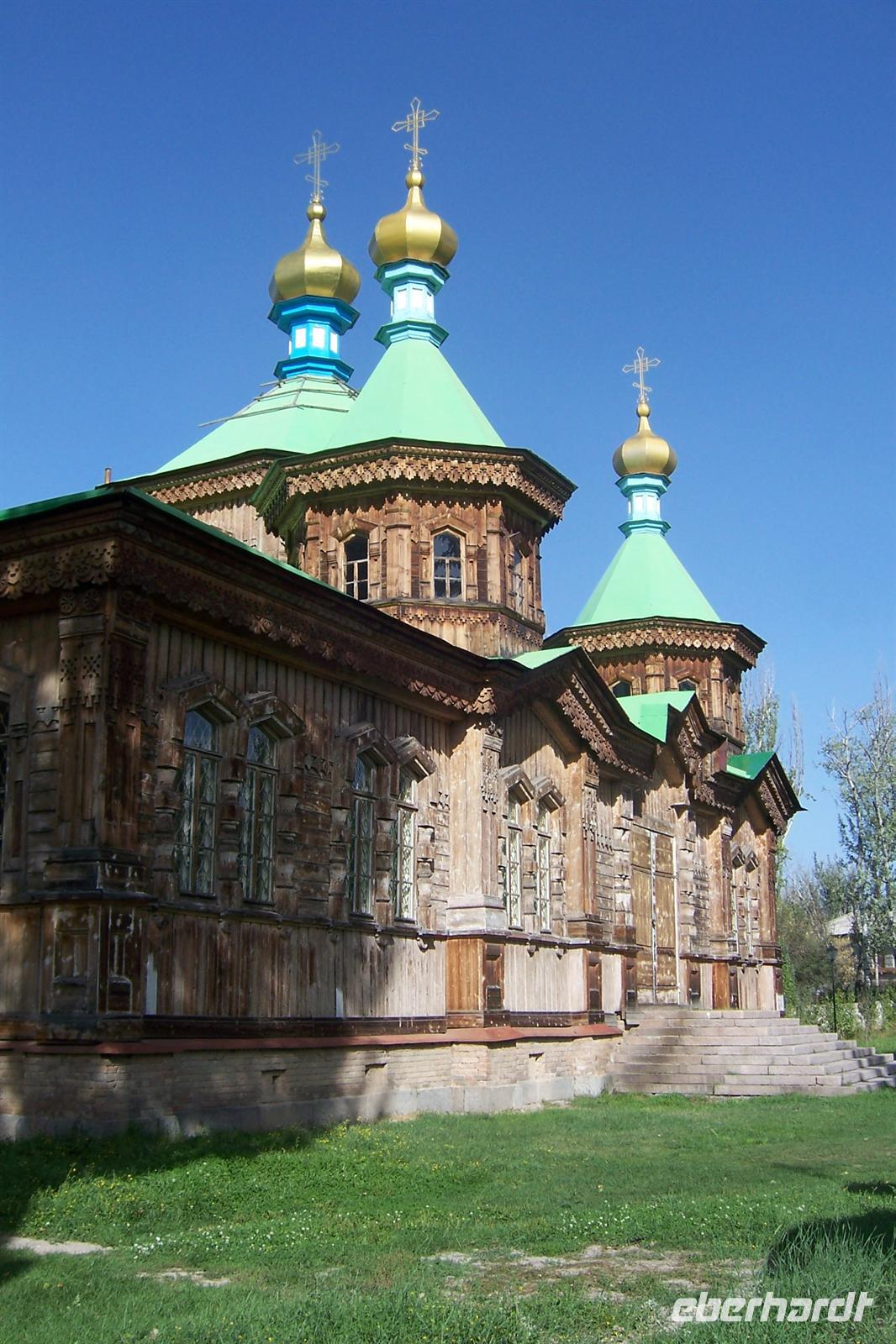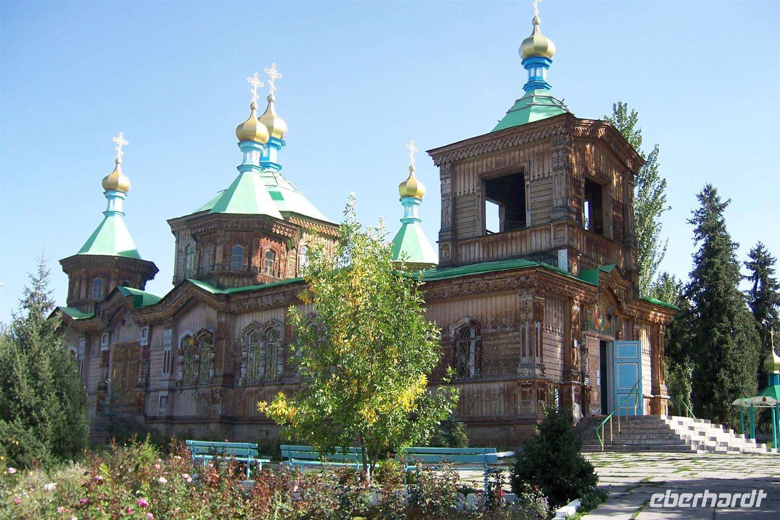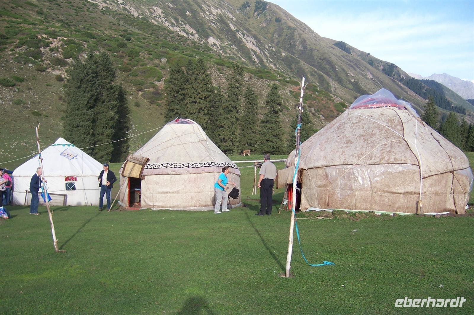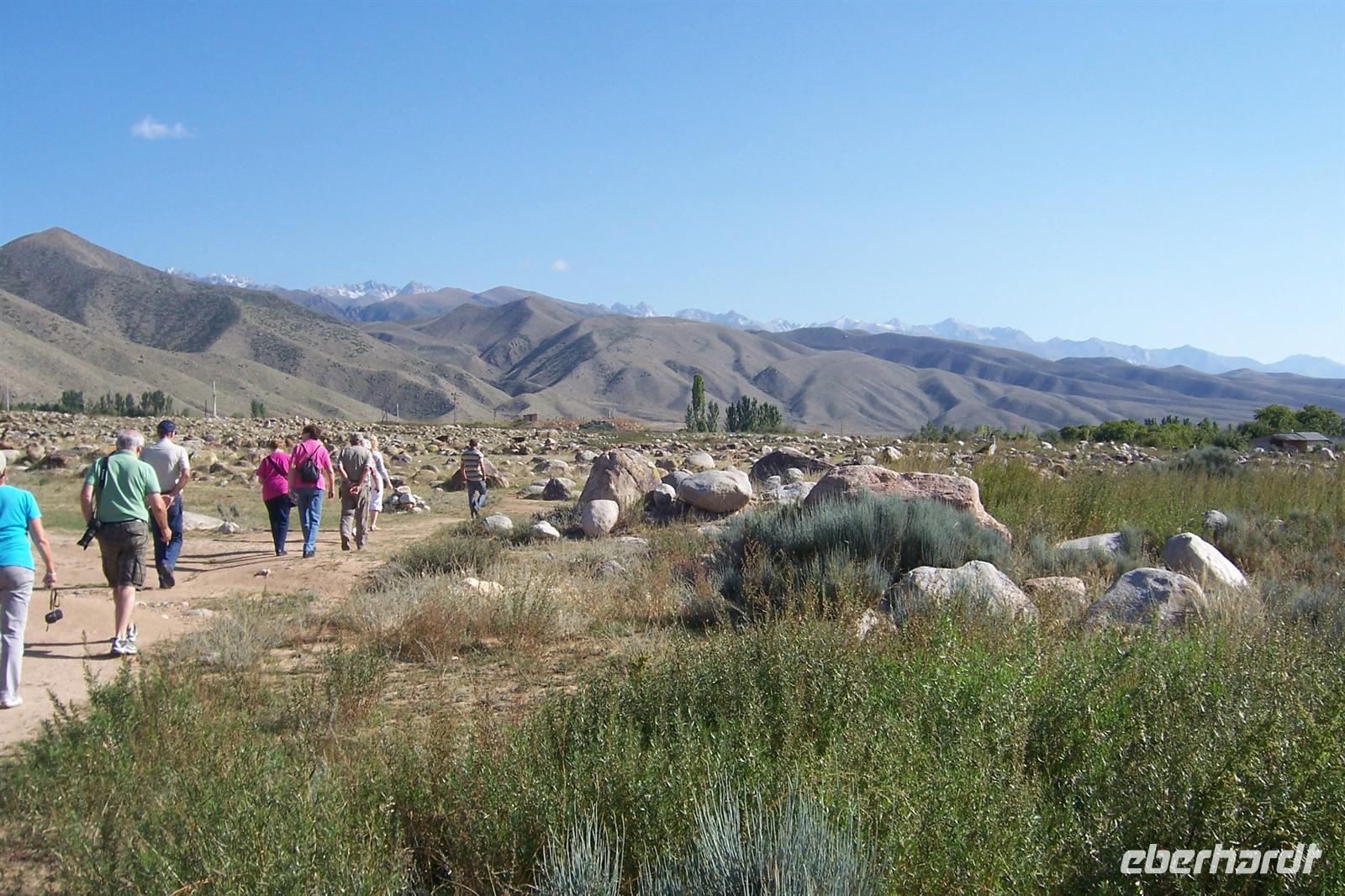 Wir beginnen den Tag mit dem Kauf frischen Fangfisches, den wir abends gemeinsam verzehren wollen. Danach erreichen wir die Felszeichnungen von Cholpon-Ata. Leider muss man auf dem Gelände wirklich suchen, um einige der Darstellungen zu finden und zu sehen. Auch wenn mit deutscher Unterstützung zusammengetragen wurde, muss noch Einiges passieren, um dies zu einem touristischen Höhepunkt werden zu lassen. Wir erreichen gegen Mittag Karakol und besuchen zunächst das Museum des Weltreisenden Prschewalski - eine wirklich interessante Ausstellung! Danach besichtigen wir die Dunganen-Moschee und die russische Holzkirche. Auch wenn ich mehrfach die örtliche Agentur und den Reiseleiter befragt habe, bekomme ich keine klaren Aussagen zu unserer Übernachtung in der Jurte. Da mich ein ungutes Gefühl beschleicht und ich eine nicht angemessene Unterkunft vermute, gebe ich an alle Gäste die Information, dass ich hier in Karakol ein Hotel besichtige, welches ich alternativ für die Gruppe buchen möchte. Alle sind einverstanden und nach meiner Besichtigung steht fest, dass wir die Nomaden besuchen, aber im Hotel übernachten werden. Wir fahren zur Sheti Oguz-Schlucht und weiter mit Kleinbus und Auto die Berge zur Nomadenfamilie hinauf. Was ich vermutet hatte, ist nun Gewissheit. Wir hätten in drei Jurten auf dem Boden die Nacht verbringen müssen. Jetzt sind alle froh, die Nacht in einem weichen Bett verbringen zu dürfen.