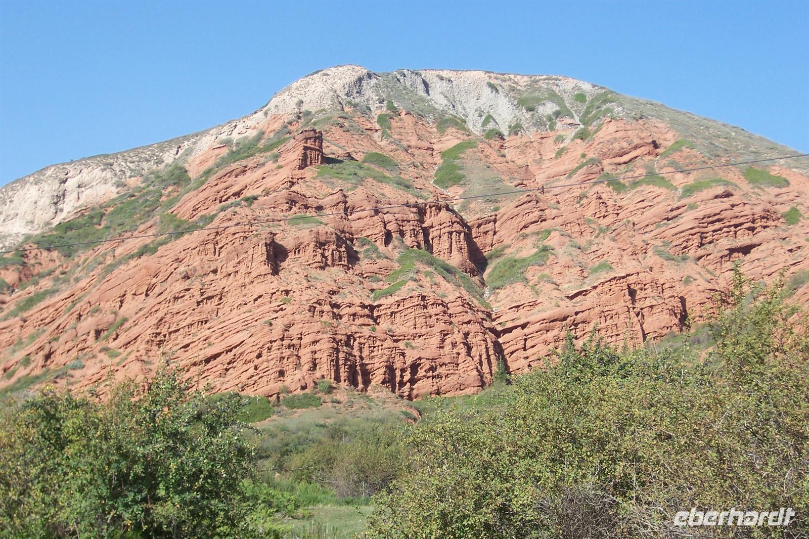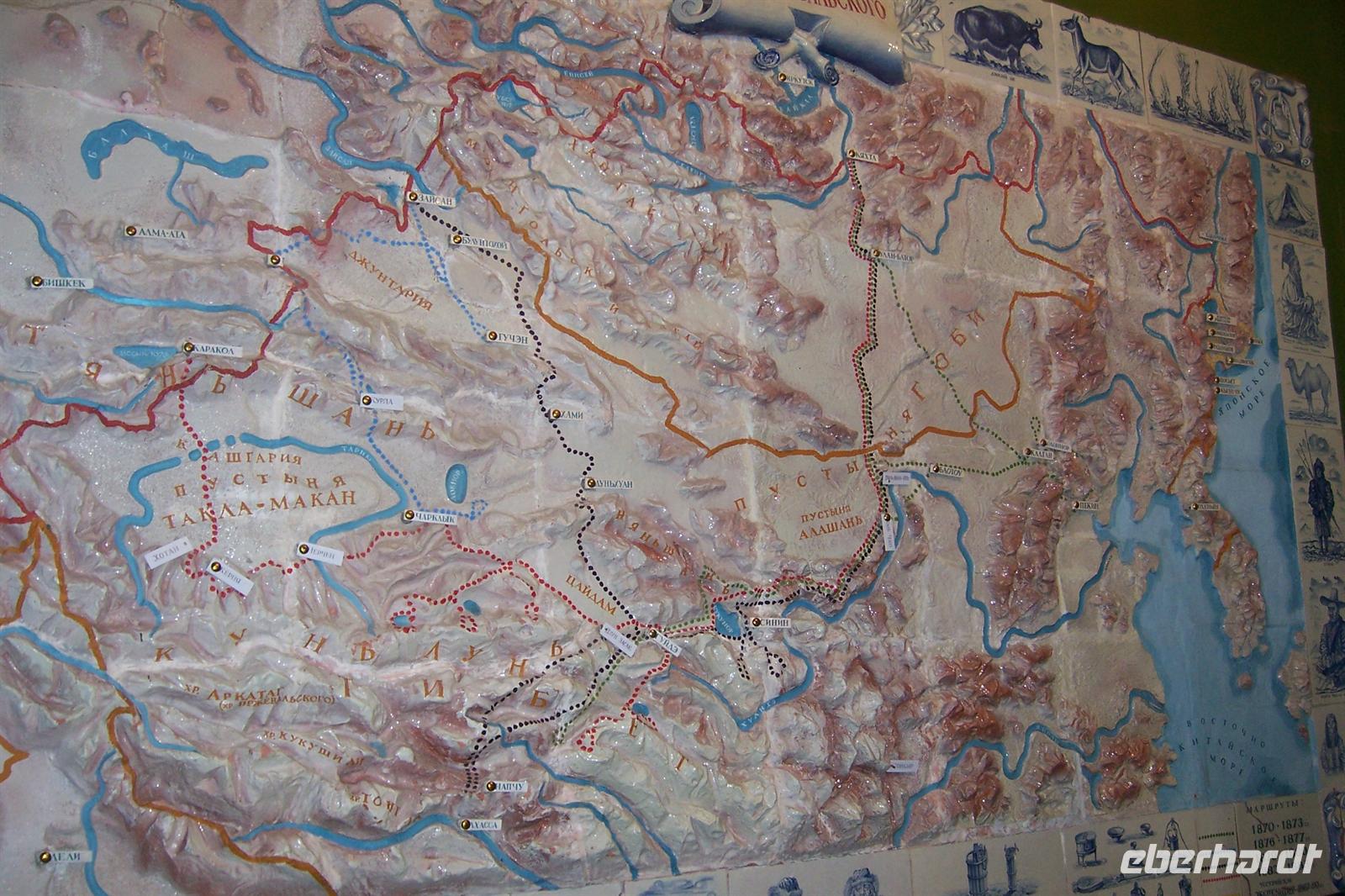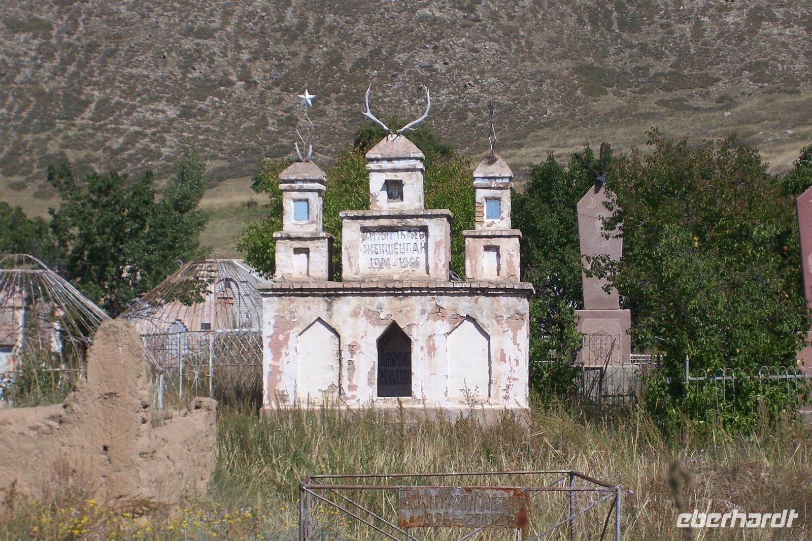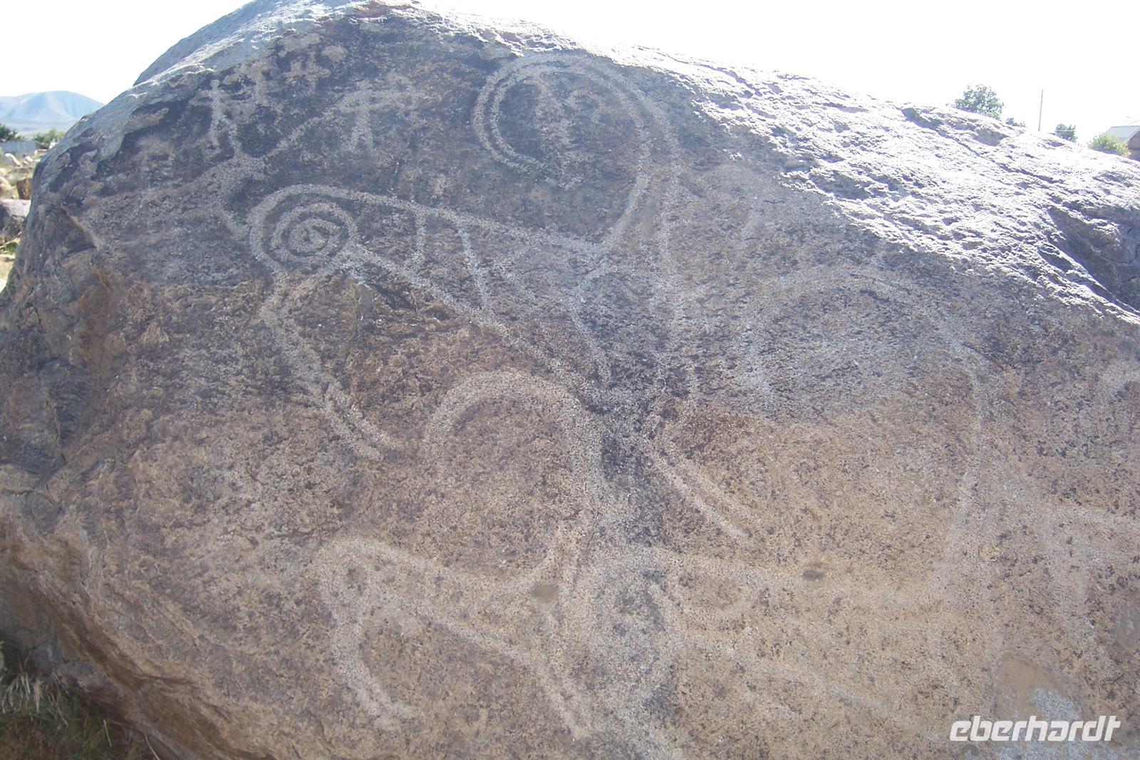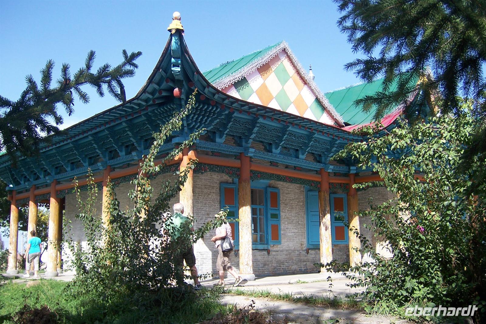 Wir beginnen den Tag mit dem Kauf frischen Fangfisches, den wir abends gemeinsam verzehren wollen. Danach erreichen wir die Felszeichnungen von Cholpon-Ata. Leider muss man auf dem Gelände wirklich suchen, um einige der Darstellungen zu finden und zu sehen. Auch wenn mit deutscher Unterstützung zusammengetragen wurde, muss noch Einiges passieren, um dies zu einem touristischen Höhepunkt werden zu lassen. Wir erreichen gegen Mittag Karakol und besuchen zunächst das Museum des Weltreisenden Prschewalski - eine wirklich interessante Ausstellung! Danach besichtigen wir die Dunganen-Moschee und die russische Holzkirche. Auch wenn ich mehrfach die örtliche Agentur und den Reiseleiter befragt habe, bekomme ich keine klaren Aussagen zu unserer Übernachtung in der Jurte. Da mich ein ungutes Gefühl beschleicht und ich eine nicht angemessene Unterkunft vermute, gebe ich an alle Gäste die Information, dass ich hier in Karakol ein Hotel besichtige, welches ich alternativ für die Gruppe buchen möchte. Alle sind einverstanden und nach meiner Besichtigung steht fest, dass wir die Nomaden besuchen, aber im Hotel übernachten werden. Wir fahren zur Sheti Oguz-Schlucht und weiter mit Kleinbus und Auto die Berge zur Nomadenfamilie hinauf. Was ich vermutet hatte, ist nun Gewissheit. Wir hätten in drei Jurten auf dem Boden die Nacht verbringen müssen. Jetzt sind alle froh, die Nacht in einem weichen Bett verbringen zu dürfen.