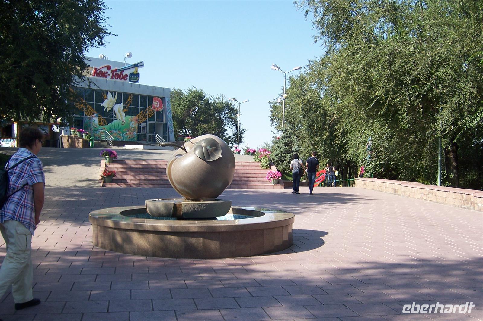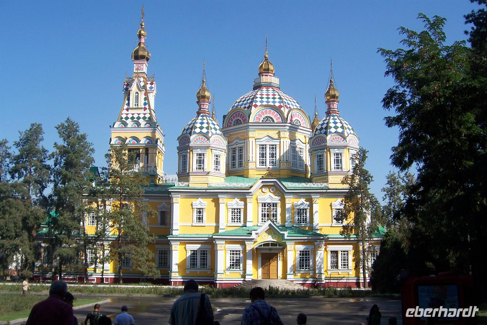 Wir unternehmen eine Stadtrundfahrt durch Almaty und erspähen die ersten wild wachsenden Äpfel, die der Stadt ihren Namen gaben. Zuerst fahren wir Parkanlage mit der Senkow-Kathedrale.