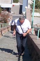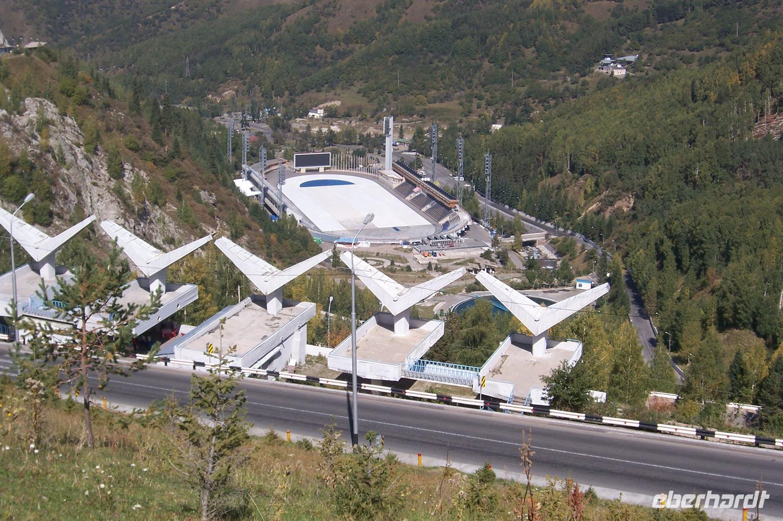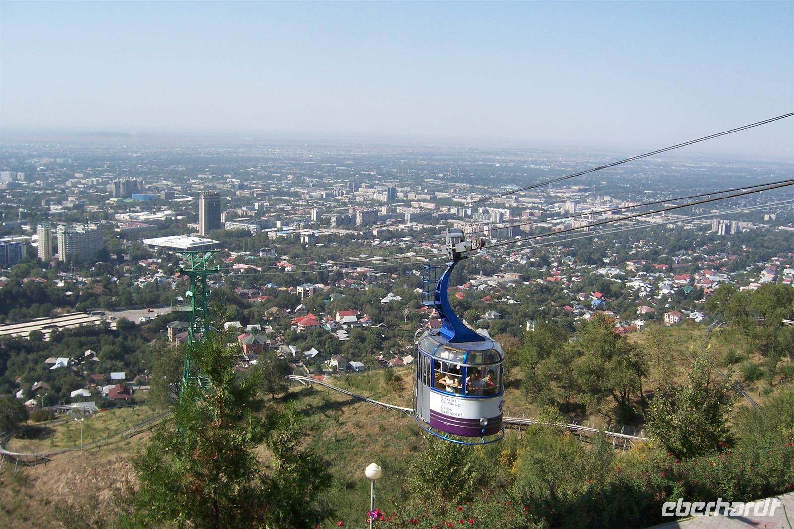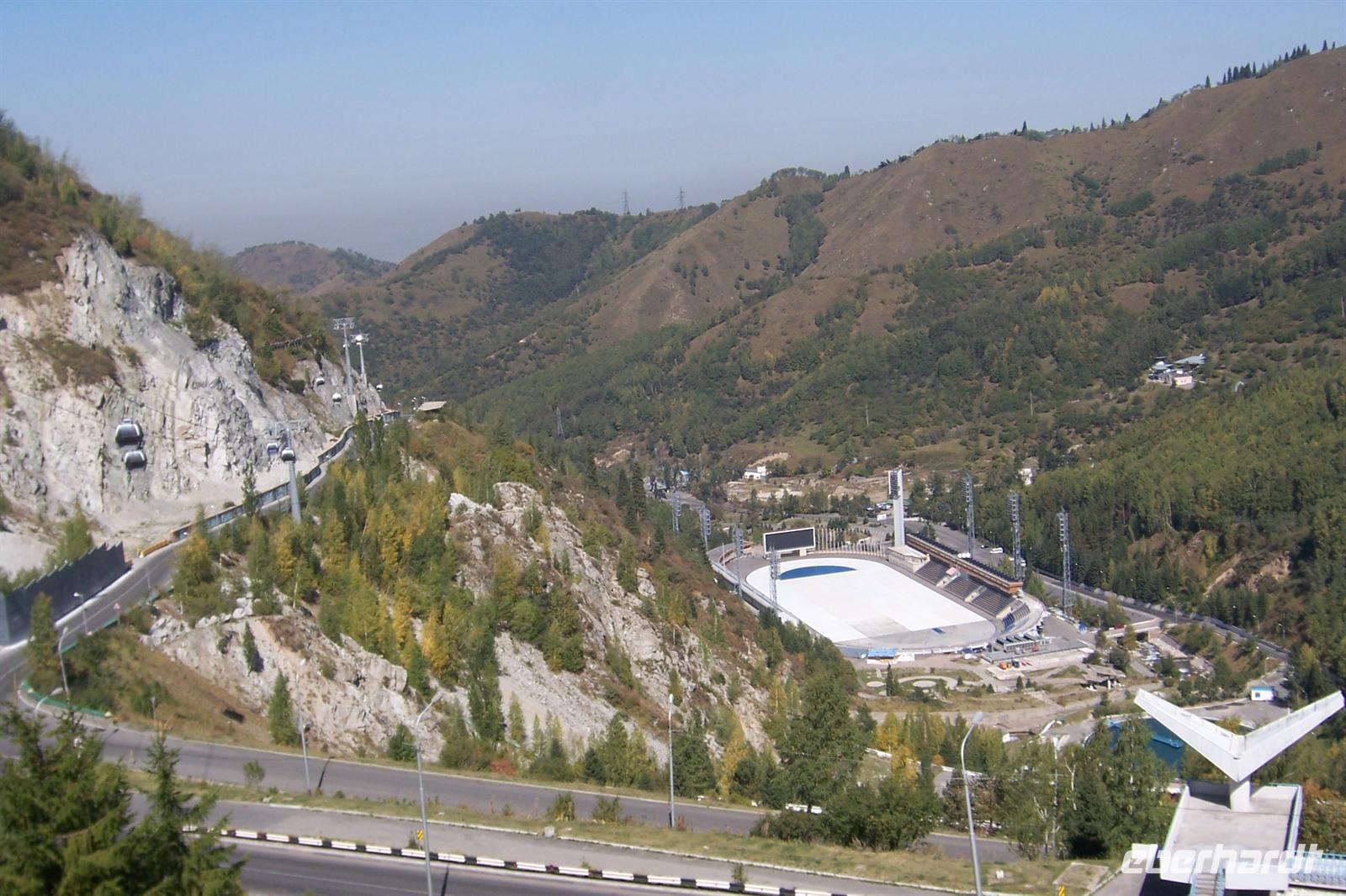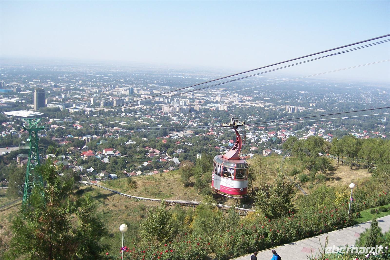 Sie gilt mit ihrer 56 Meter aufragenden Konstruktion als eine der größten Holzkirchen weltweit. Danach sehen wir das imposante Denkmal der zwei Weltkriege mit dem ewigen Feuer, an dem sich unmittelbar auch das alte und neue Haus des Militärstabs befindet, ein wahrer Gegensatz. Wir fahren zum neuen Platz mit dem Nationaldenkmal. Danach geht es etwas außerhalb der Stadt zum Einsstadion Medeo, welches für seine zahlreichen Weltrekorde bekannt ist. Oberhalb befindet sich der Staudamm, der die Stadt vor einer nochmaligen Lawine schützen soll. Die Mehrheit der Gruppe ersteigt die fast endlos scheinenden Treppenstufen bis hinauf. Einzelne lassen sich bequem im Taxi nach oben fahren. Danach speisen wir in einer Jurte zu Mittag und anschließend fahren wir mit dem Transferbus auf den Kok-Tobe. Der Hausberg Almatys bietet einen herrlichen Blick über die Stadt und ist ein schönes Motiv für unser Gruppenbild.