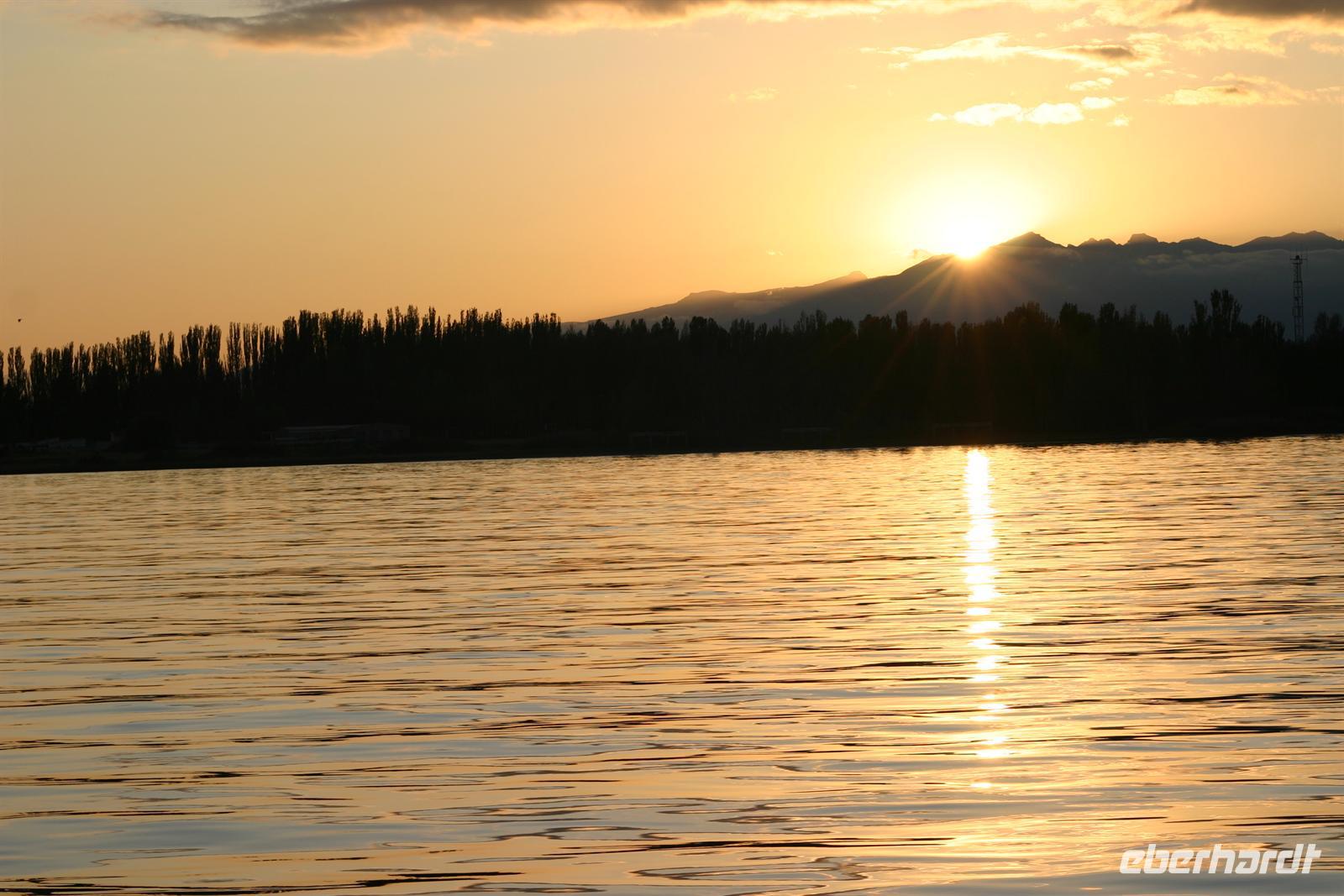 Irgendjemand hatte sich wohl ein weiteres unvergessliches Erlebnis gewünscht, denn schon am gleichen Abend überraschte uns unser Reiseleiter mit einer Bootsfahrt auf dem berühmten Issykul-See. Während die Sonne langsam hinter den schneebedeckten Bergen versank und den See und die umliegende Landschaft in sanftes Weinrot tauchte, wurde es auf dem Schiff ganz ruhig und alle genossen den Augenblick.