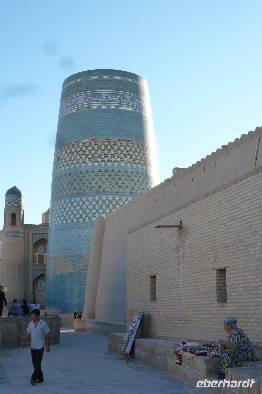 Der Tag startete zeitig: Wir flogen um 07:50 Uhr von Tashkent nach Urgench. Der Flug war gemütlich und es klappte alles super. Unsere Reiseleiterin war mit dabei und wir flogen in die Wüste! Wir wurden am Flughafen erwartet und fuhren ca. 30km nach Chiwa, einer alten Handelsstadt in der Wüste direkt an der Seidenstraße. Wir checkten in das Hotel Asia Khiva ein und machten uns dann auf um die Stadt zu erkunden. Diese besteht fast komplett aus Lehmhäusern, kleinen Gassen, tollen Moscheen, Minaretten und Medresen. Es war richtig warm, aber diese Wüstenschadt war so schön zum ansehen, dass uns der Stadtbummel trotz der Wärme sehr viel Spaß gemacht hat. Überall hübsche Kinder, Straßenhändler und Handwerker. Wir sahen wie Koranständer geschnitzt wurden und wie Frauen Teppiche webten. In einer ehemaligen Medesse „Yasaul Boshi“ aßen wir Mittag - wieder wunderschön gedeckte Tische und sehr gute Speisen. Wir gratulierten hier auch unserem Geburtstagkind zu seinem Geburtstag mitten in der Wüste und überreichten eine typisch usbekische Kappe als Geschenk! Nach einer Siesta im Hotel (um die Mittagshitze gut zu überstehen) spazierten wir am Nachmittag weiter durch das Städtchen und besuchten eine weitere Medresse mit über 200 Holzsäulen sowie zwei Paläste. Auf der Straße trafen wir junge Musiker, welche uns ein spontanes usbekisches Straßenkonzert gaben - es war wunderschön und einer unserer Gäste schnappte sich dann gleich das Akkordeon und spiele den nun vielen Einheimischen und unseren Gästen auch ein Ständchen. Nachher im Tash Hauli-Palast besuchten wir die prachtvollen Innenhöfe des Harem des ehemaligen Khan - wirklich sehr schön. Nachher genossen wir im Schatten eines kleinen Cafés Kaffee und staunten über das blaue Minarett direkt neben uns. Einige Gäste sind hoch zum Aussichtsbalkon des Palastes gestiegen! Am Abend ging es weiter mit dem guten Essen, wir saßen draußen bei herrlichem Wetter und ließen und gefüllte Teigtaschen schmecken. Als besondere Überraschung bekam unser Geburtstagskind eine riesengroße Torte mit Kerzen, die wir uns alle nachher bei einem Wässerchen schmecken ließen.
