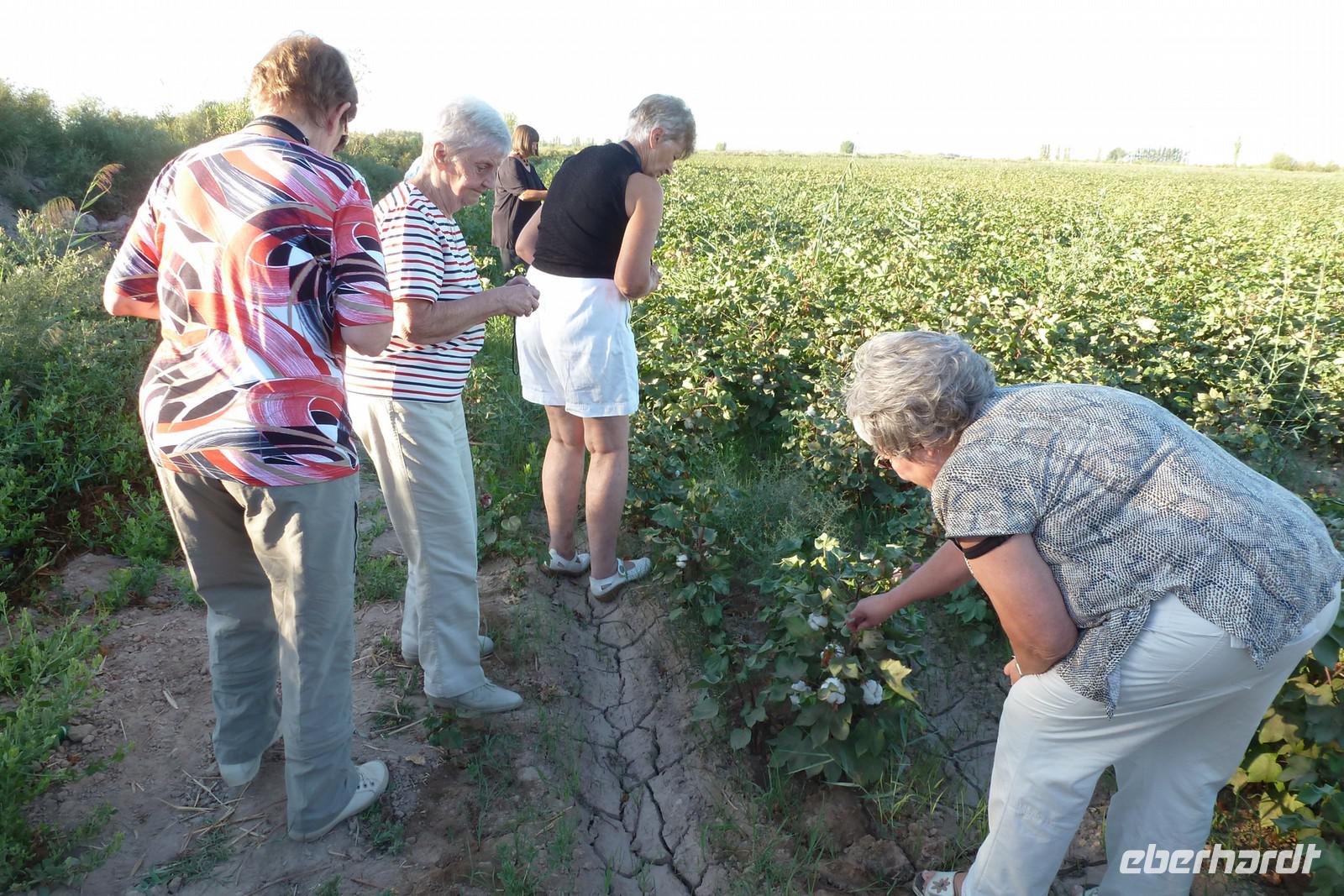 Samarkand - die märchenhafte und wohl schönste Stadt des Orients stand heute auf unserem Programm. Bei angenehmen Temperaturen besuchten wir als erstes das Mausoleum Gur-Emir mit dem Grad von Timur - ein wunderschönes mit Gold verziertes Gebäude. Und dann kam der wirklich beeindruckende Registan-Platz mit den drei einmaligen Medresen Ulug Beg, Shir-Dor und Tillja Kari. Der Anblick dieser drei Gebäude war toll - viele empfanden diesen Platz als einen ganz besonderen Höhepunkt der Reise! Wir nahmen uns viel Zeit, um die Medresen mit ihren vielen kleinen ehemaligen Wohnkammern zu besuchen. Jetzt findet man dort Handwerker, Souvenirverkäufer und Künstler. Auch ein Musiker hat uns typisch usbekische Instrumente vorgespielt und unsere Gäste konnten in altertümliche Kleider der Usbeken schlüpfen - ein toller Vormittag. Wir haben anschließend in einem hübschen Restaurant Mittag gegessen bevor wir die Moschee Bibi Hanim besuchten. Nachher noch den Bazar von Samarkand mit tollen getrockneten Rosinen und südländischen Früchten - und dann ging es zurück zum Hotel für einen wohl verdienten Mittagsschlaf. Ausgeruht fuhren wir am Abend in einen der berühmtesten Weinkeller Samarkands - dort wurden wir vom „Weinchef „ persönlich begrüßt und durch das kleine Museum geführt, bevor wir 10 verschiedene usbekische Weine probieren konnten. In einem tollen Saal an einem alten Holztisch wurden uns süße Dessertweine und guter Cognac serviert. Gut gelaunt fuhren wir weiter zu unserem Abendessen am Registan Platz, bevor wir um 21 Uhr die Licht- und Tonshow vor den drei Medresen bestaunten. Und nur für unsere Eberhardt Gäste wurde die Geschichte auf Deutsch vorgetragen und so konnten alle dieses schöne Ereignis bei einem Glas Champagner genießen!