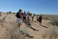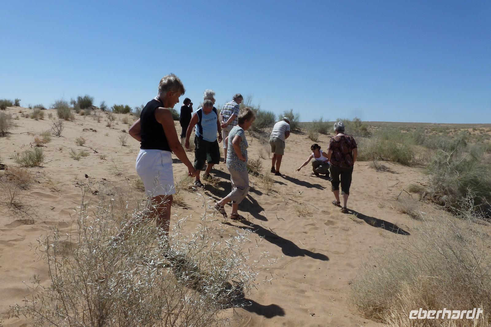 Die Wüste ruft! Wir fuhren heute durch die riesige Kizilkum Wüste nach Buchara! Und es war wirklich eine große Wüste - links und rechts nichts als Sand, San und Sand. Die Straße war etwas abenteuerlich - aber unser toller Buschauffeur hat uns sehr gut durch diese einmalige Landschaft gefahren. Wir stoppten unterwegs an ehemaligen Teehäusern in einer kleinen Oase und dort genossen wir ein leckeres Picknick mit frischen Obst und Gemüse, Wurst, Käse und Brot. Und dann ging es weiter, nun auf besseren Straßen Richtung Buchara. Unterwegs hat uns unsere Reiseleiterin Zika mit tollen Geschichten, Erzählungen, Musik, Märchen, Witzen und Erklärungen die Fahrt versüßt! Schließlich sind wir abends in der Märchenstadt Buchara angekommen und gingen das letzte Stück zum Hotel Minsifa zu Fuß - den die Gassen der Altstadt waren zu eng für unseren Bus. Hinter einem unscheinbaren, für Usbekistan so typischen Tor verbarg sich unser schönes Hotel mit einem tollen Innenhof und liebevoll gestalteten Zimmer. Wir spazierten nachher durch die Gassen zu unserem Restaurant Dolon, wo wir auf der Dachterasse zum Abendessen erwartet wurden - mit tollem Blick über die Stadt und auf den Vollmond!