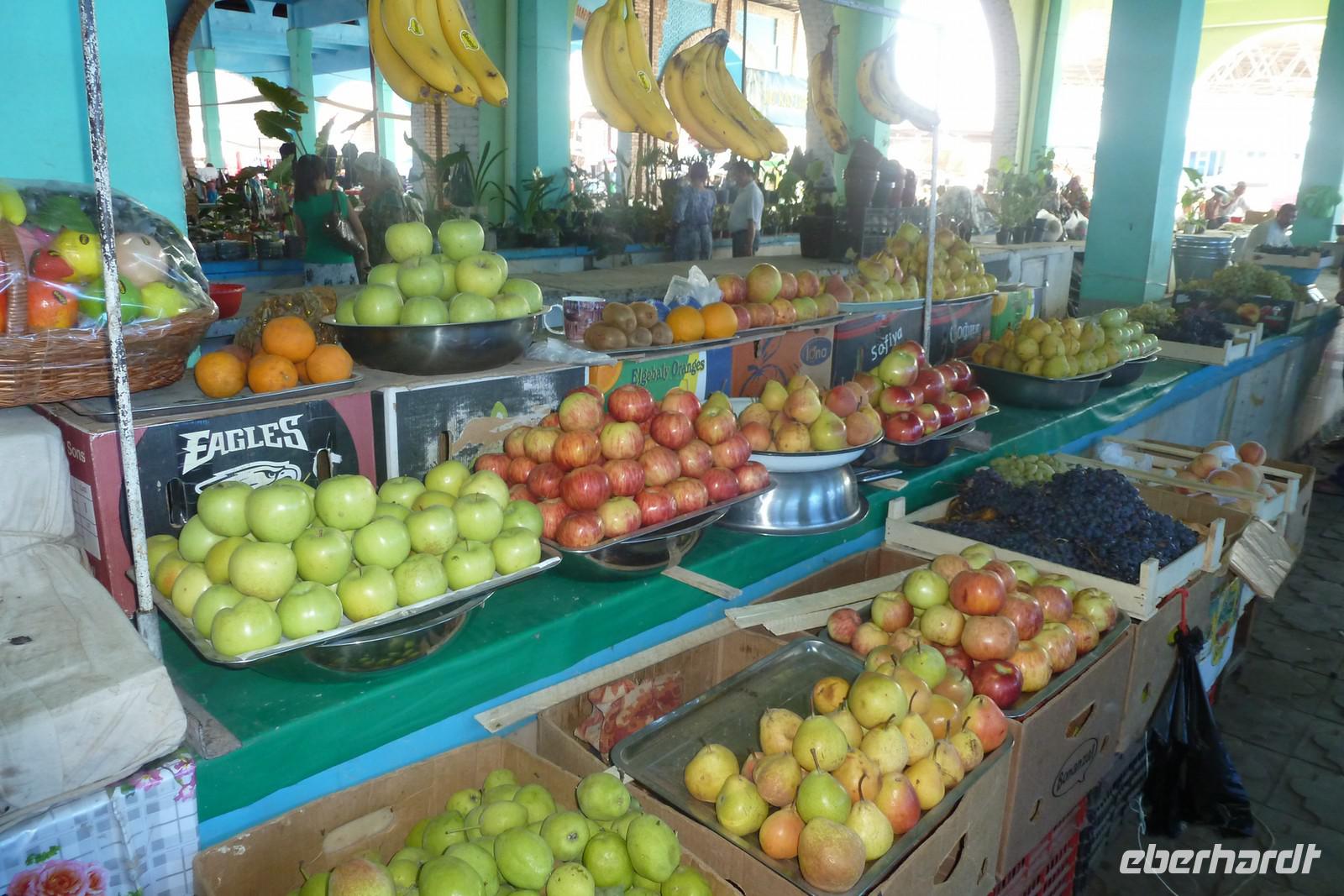 Heute sind wir früh aufgestanden, denn unser Flug nach Kirgisistan ging schon um 8 Uhr. Wir verabschiedeten uns von unserem ganz tollen Buschauffeur Utkur und unserer spitzen Reiseleiterin Zika, denn die beiden konnten leider nicht mit nach Kirgisistan kommen. So flogen wir nur 40 min in das Nachbarland, die Einreise war völlig unproblematisch, nur auf unser Gepäck mussten wir in Bishkek am Flughafen eine Weile warten. Aber das hat dann auch alles geklappt und wir wurden schon am Flughafen von unserer neuen Reiseleiterin Lira empfangen. Ein großer, toller Bus erwartet uns und so konnte der zweite Teil unserer Seidenstraße Reise beginnen. Wir wurden in dem Land freundlich begrüßt und fuhren gleich erst einmal unsere Euro in kirgisische SOM tauschen. Und dann zum Hotel Ak Keme, ein großes Hotel mit Pool und einer tollen Anlage mitten in der Stadt. Nachdem wir unsere Zimmer bezogen hatten fuhren wir zum Mittagessen ins Café Obama - und saßen wie zu Hause auf gemütlichen Sofas! Am Nachmittag haben wir uns Bishkek angeschaut: zuerst auf den riesengroßen Osh Mark - Obst, Gewürze, Fleisch und alles was die Kirgisen brauchen gibt es hier! Nach einem Marktrundgang fuhren wir zum Regierungsgebäude und zum historischen Museum am Hauptplatz. Es erinnert hier alles noch sehr stark an sie Sowjetzeit vor der kirgisischen Unabhängigkeit. Schließlich hatten wir dann vor dem Abendessen noch genügend Zeit zum ausruhen oder schwimmen im Pool des Hotels. Abends fuhren wir zum Restaurant Arzu, wo wir wieder viel zu Essen bekamen - es gab gefüllte Teigtaschen!