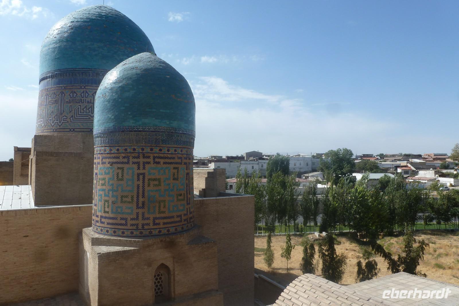 Die Wüste ruft wieder! Auf der heutigen Fahrt nach Samarkand ging es wieder durch Wüste und Steppe. Wir fuhren durch Bauerndörfer mit all den grauen Lehmhäusern, Frauen mit bunten Kleidern, Landbewohnern auf Eseln, Kühen, Fettschwanz-Schafen und der endlosen Weite Usbekistans. Unterwegs stoppten wir in Schahrisabs, wo wir wieder bei einer Familie zum Mittagessen eingeladen waren. Anschließend schauten wir uns die Geburtsstadt von Tamerlan an und besuchten den lebendigen Bazar der Stadt. Weiter ging es Richtung einer der schönsten Städte des Orients. Wir machten nochmal in einem kleinem Bauerndorf Stopp und besuchten eine einheimische Familie um zu sehen, wie die Menschen in der kargen Landschaft leben. Die Kinder der Familie freuten sich über die Geschenke unserer Gäste. Und schließlich erreichten wir am Abend Samarkand und unser Hotel Sher Dor. Ein weiteres Abendessen bei einer Familie in einem tollen Innenhof und zwei Runden Wässerchen rundeten den Abend ab. Ach und es gab am Klavier in der Hotellobby ein Gute Nacht Konzert von unserem Mitreisenden Heinz - war das ein Spaß!