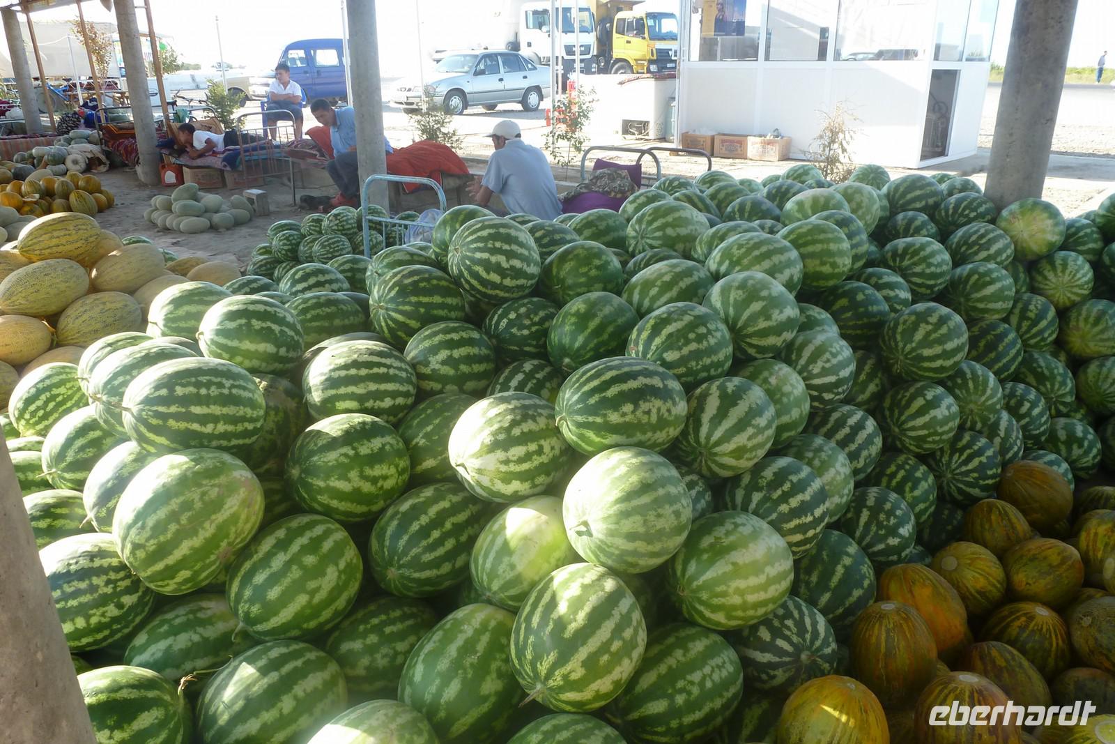 Wir besuchten am Morgen die Gräberstraße Samarkands mit vielen Mausoleen, wo wir wieder viele Usbeken getroffen haben. Nachher sind wir zum Observatorium des berühmten Ulugbeks gefahren, bevor wir in einem schönen Lokal Mittag gegessen haben. Nachher ging es weiter zum Afrosiab Museum und schließlich machten wir uns auf unsere Rückreise nach Tashkent. Fünf Stunden Fahrt auf einer guten Straße durch Usbekistan - es war sehr spannend denn links und rechts spiele sich das Leben ab, so war die Fahrt überhaupt nicht langweilig. Unterwegs stoppten wir an einem Melonenmarkt und probierten frische Melone- mhhh lecker! Schließlich erreichten wir am Abend wieder die usbekische Hauptstadt und unser Hotel vom ersten Abend! Wir spazierten noch zu einem georgischen Restaurant und verbrachten den letzten Abend in Usbekistan!