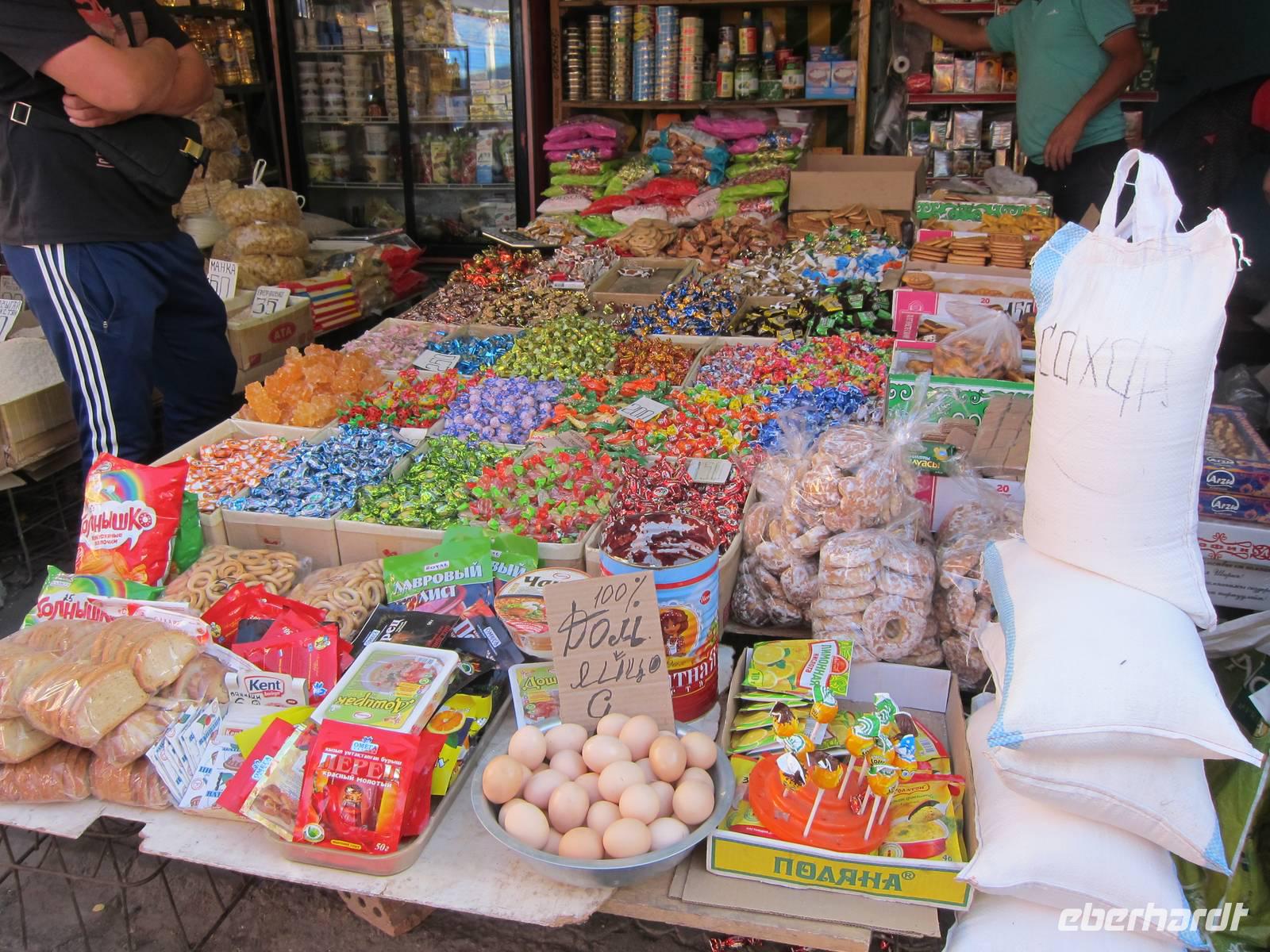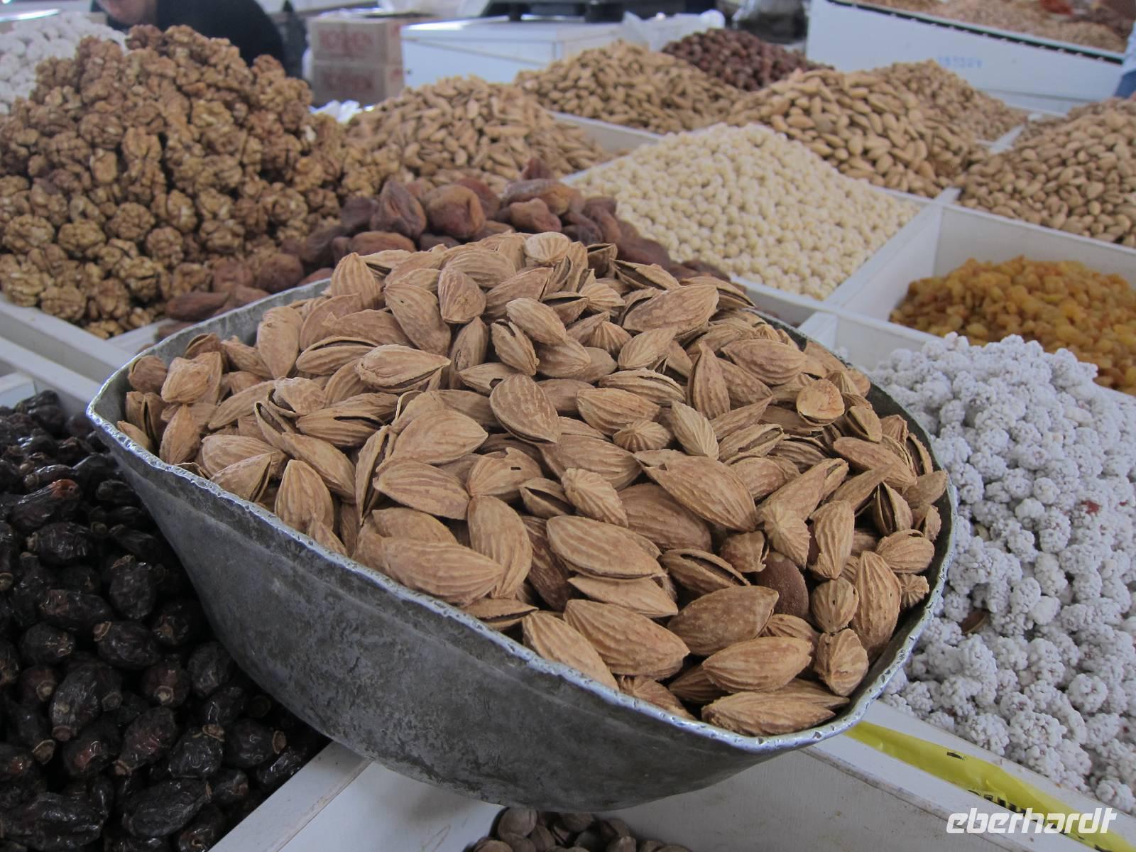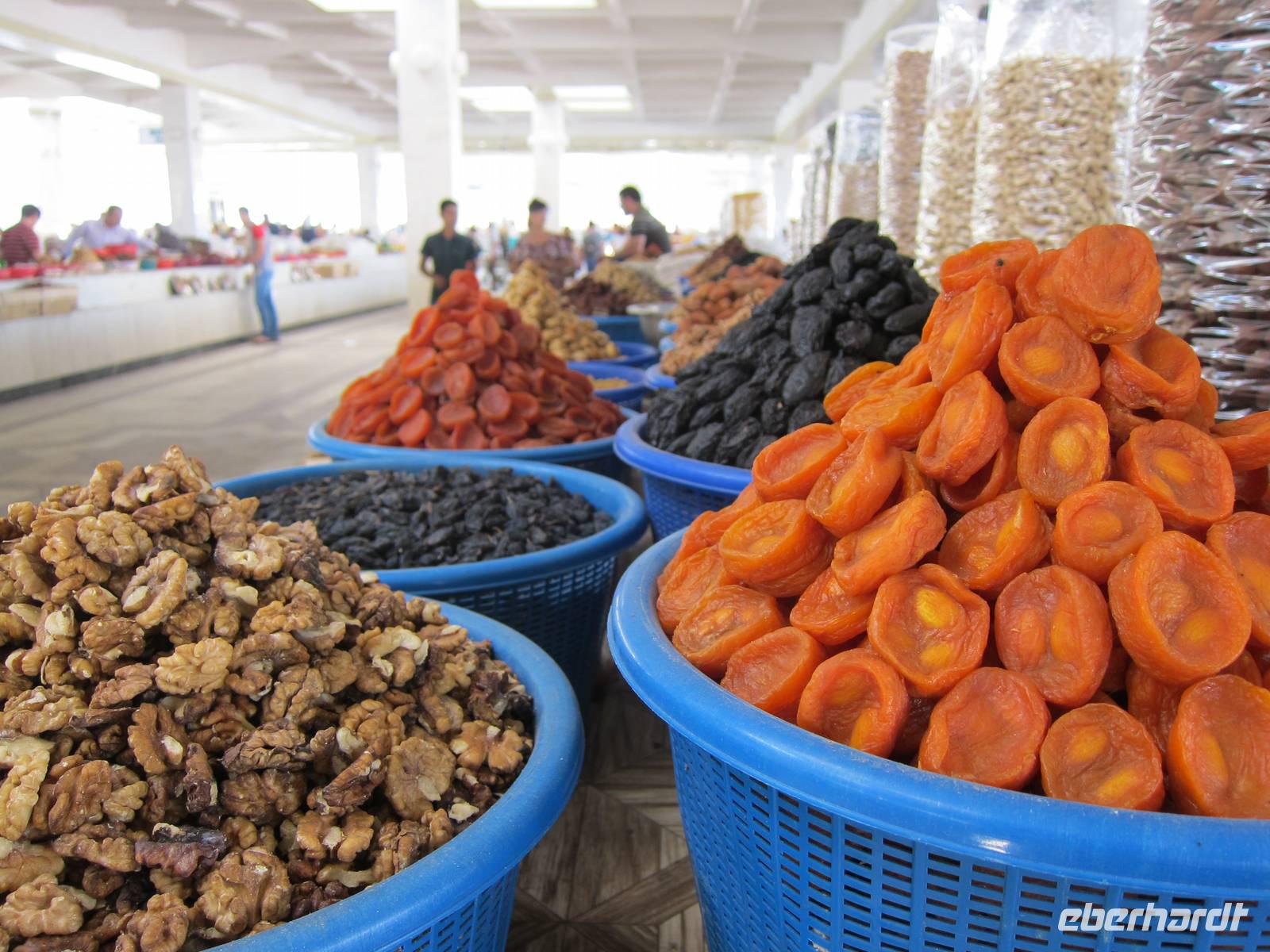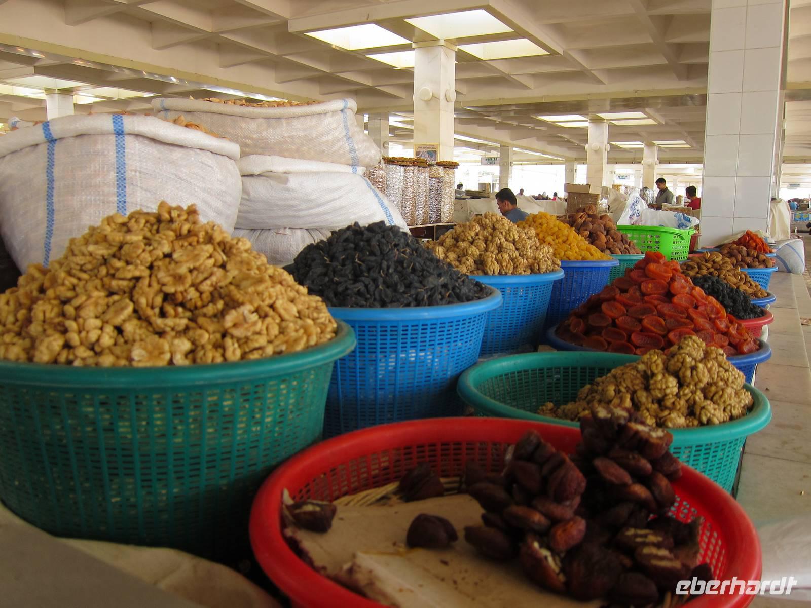Am späten Nachmittag fuhren wir dann zum Osch Markt, dem Hauptbasar der Stadt. Hier gibt es, wie auch auf anderen Basaren, von Gewürzen über Obst und Gemüse, Blumen, Fleisch und Fisch bis hin zu Hygiene- und Kosmetikartikeln alles zu kaufen.