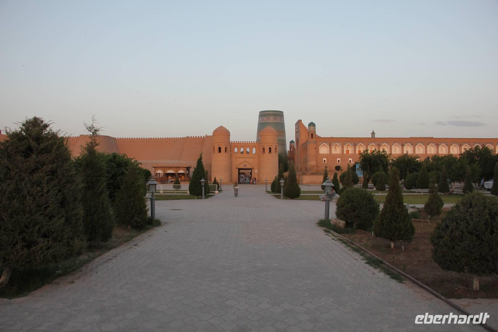 Nach dem Mittagessen in der Altstadt von Chiwa stand die Besichtigung dieser wunderschönen Altstadt auf dem Plan. Dabei wurden unter anderem die hiesige Zirkusfamilie, die Djuma Moschee (Freitagsmoschee), der Tash Hauli Palast sowie die alte Festung Chiwas besucht. Auch bei einer Teppichknüpferei, wo Teppiche noch aus reiner Seide in Handarbeit hergestellt werden, sowie bei einer kleinen Holzstube, wo unter anderem Koranständer gebaut werden, wurde vorbei geschaut.