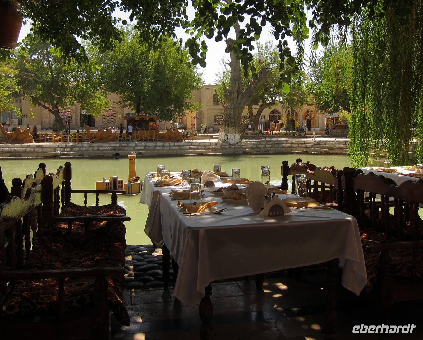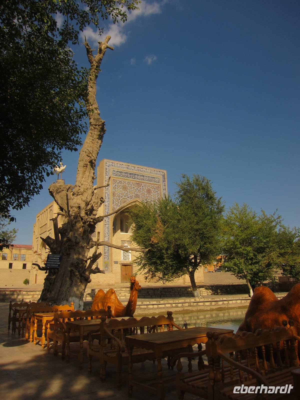 Dieser Tag stand ganz im Zeichen von Buchara, einer der schönsten Städte des Landes. Während der Stadtbeischtigung sahen wir die Medrese Nodir Devon Begi sowie den auf dem Esel sitzende Hodja. Weiter ging es mit dem Bus zum Samaniden-Park, mit dem gleichnamigen Museum. Weiter ging es zur Hiobsquelle, wo Zika etwas zur heutigen Wasserversorgung der Stadt und des Landes erklärte. Später ging es dann auf den Markt von Buchara. Später wurde die Moschee mit den 40 Säulen sowie die ehemaligen Festung Bucharas beischtigt.