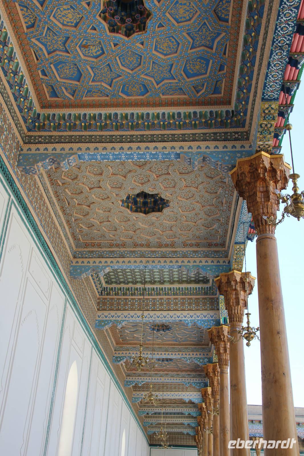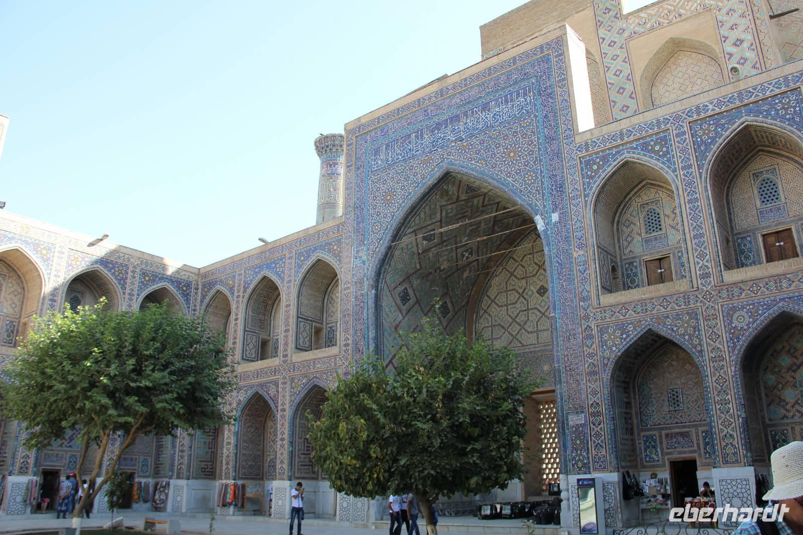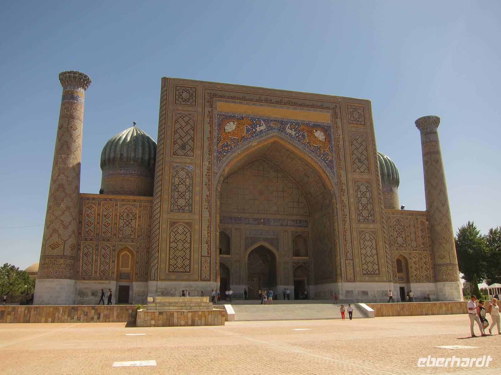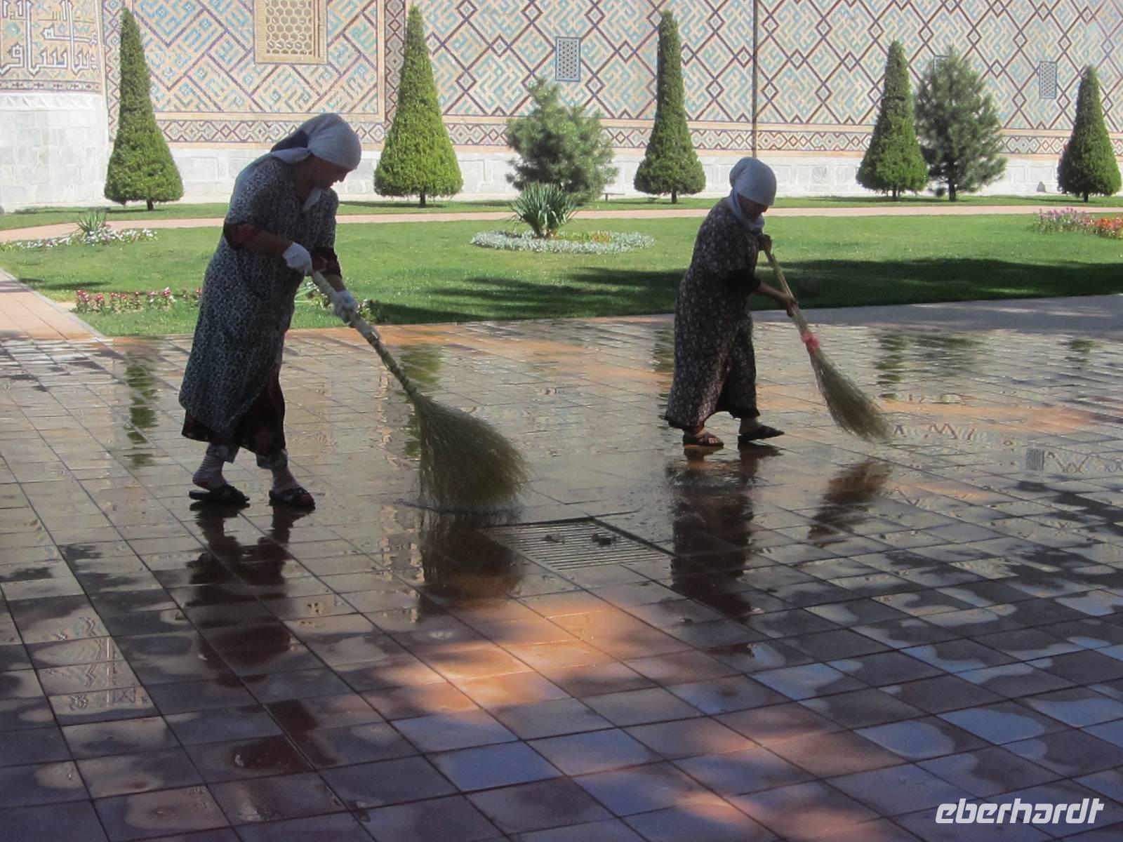 Dieser Tag wurde ganz Samarkand gewidmet. Bei einer ausführlichen Stadtbesichtigung wurden das Gur Emir Mausoleum mit seiner melonenartige Kuppel besucht und die drei Medresen des Registan Platzes ausführlich besichtigt. Weiter ging es zu Fuß über die Taschkent Street zur Moschee Bibi Hanim, wo heute leider nur noch die Überreste der einstig prächtigen Moschee erhalten sind. Zudem wurde dem Basar der Stadt natürlich ein Besuch abgestattet.