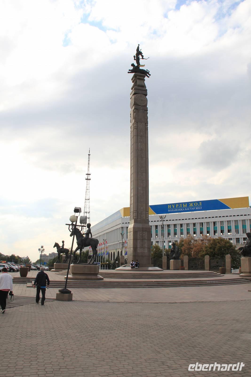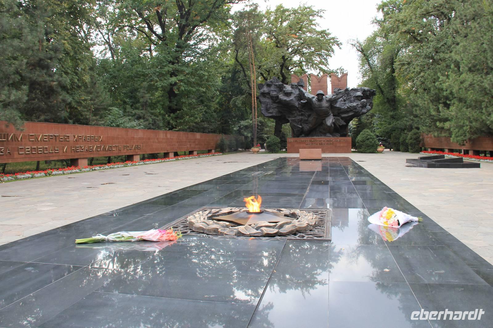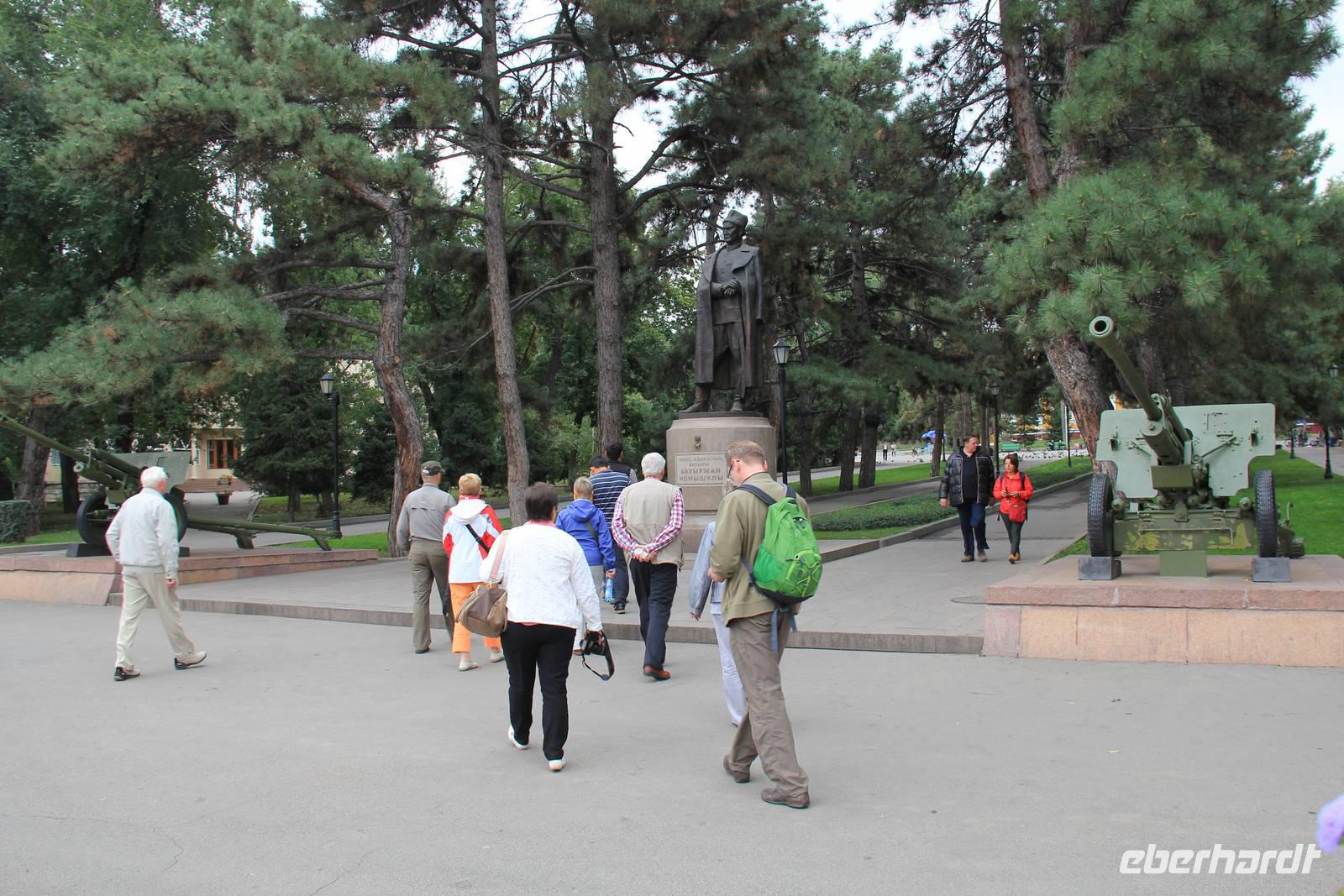 Nach dem Mittagessen unternahmen wir dann unsere Stadtbesichtigung in Almaty. Wir starteten mit einem Rundgang durch den Panfilov Park, der den 28 Soldaten von Panfilov gewidmet ist. Hier befindet sich auch die schönste Kathedrale der Stadt, die russisch-orthodoxe Senkov Kathedrale. Weiter ging es entlang der Tannenallee der Staatschefs zum Denkmal der 28 Panfilov-Soldaten, wo sich auch die ewige Flamme und Denkmäler der Heldenstädte befinden. Mit dem Bus ging es weiter zum Hotel Kasachstan mit dem gegenüberliegenden Pusteblumen-Springbrunnen und zum Platz der Republik, heute auch neuer Platz genannt.