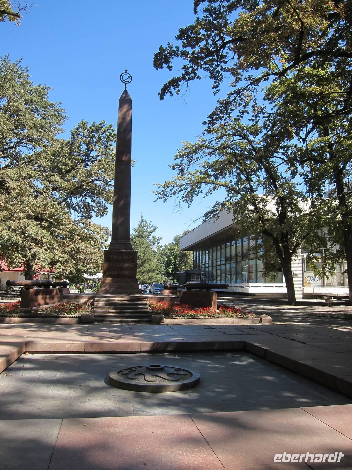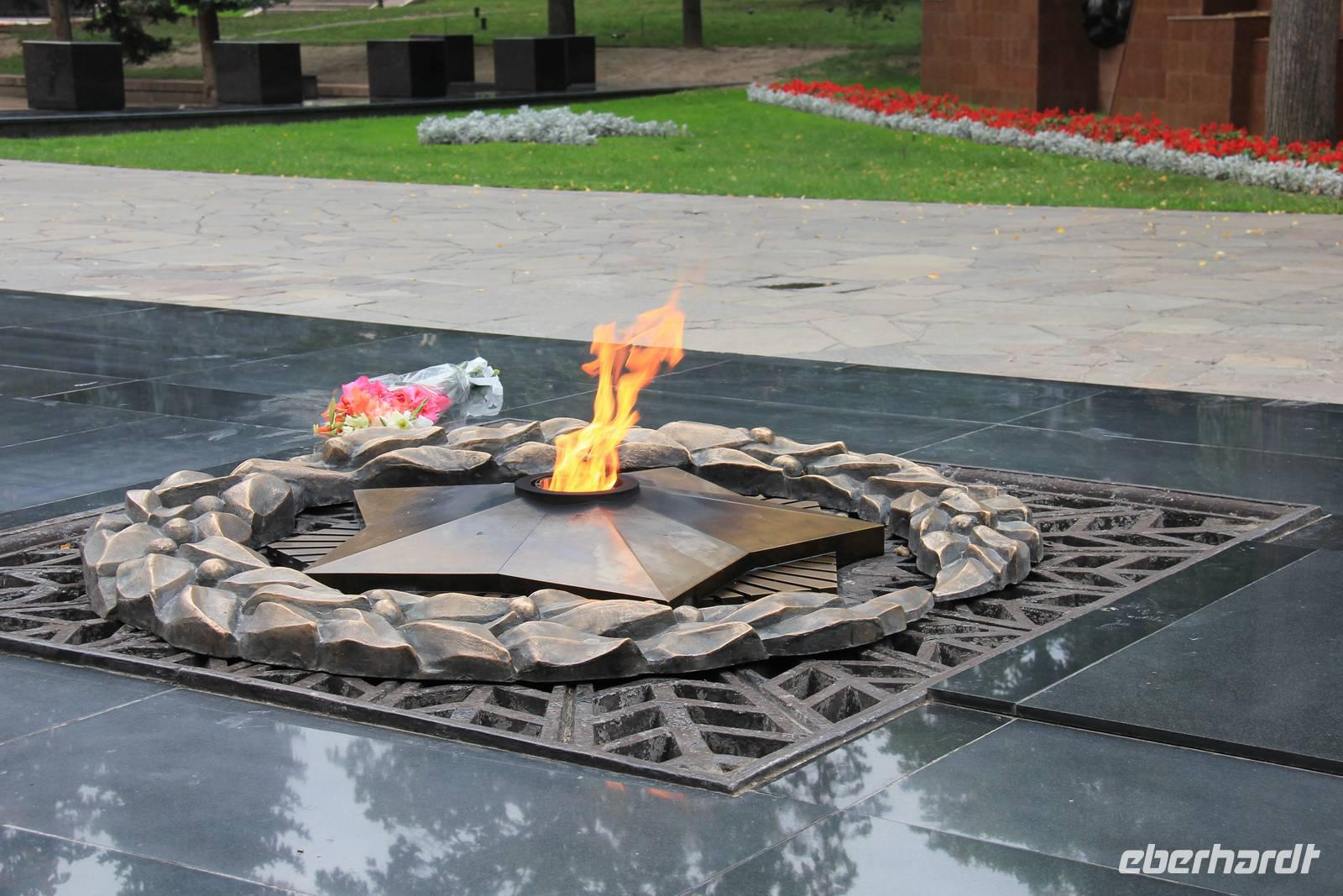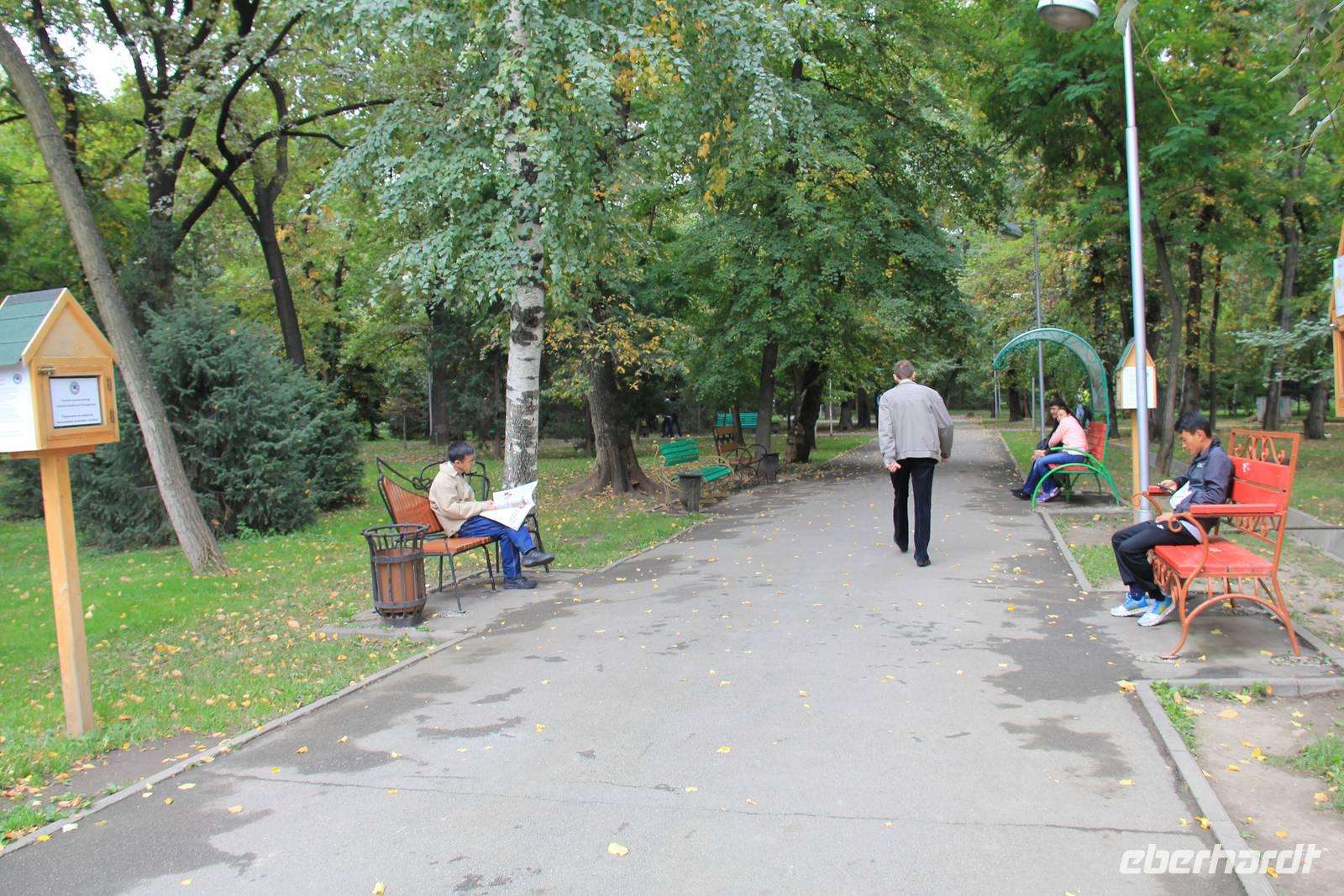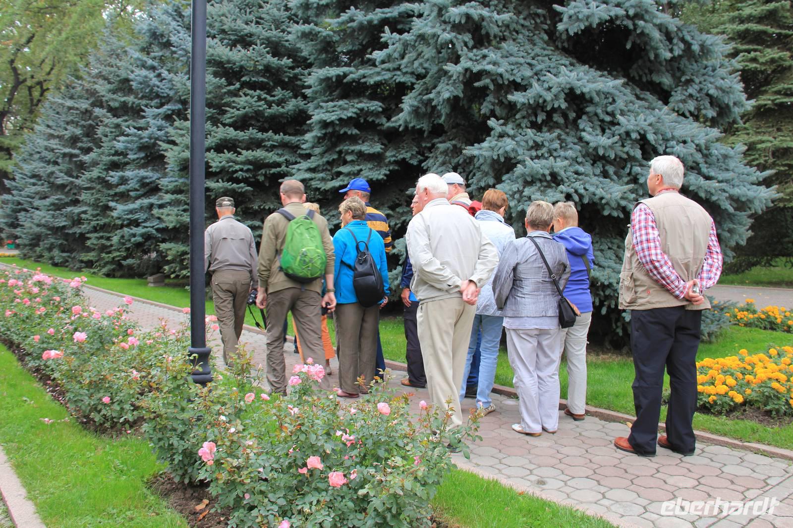 Nach dem Mittagessen unternahmen wir dann unsere Stadtbesichtigung in Almaty. Wir starteten mit einem Rundgang durch den Panfilov Park, der den 28 Soldaten von Panfilov gewidmet ist. Hier befindet sich auch die schönste Kathedrale der Stadt, die russisch-orthodoxe Senkov Kathedrale. Weiter ging es entlang der Tannenallee der Staatschefs zum Denkmal der 28 Panfilov-Soldaten, wo sich auch die ewige Flamme und Denkmäler der Heldenstädte befinden. Mit dem Bus ging es weiter zum Hotel Kasachstan mit dem gegenüberliegenden Pusteblumen-Springbrunnen und zum Platz der Republik, heute auch neuer Platz genannt.