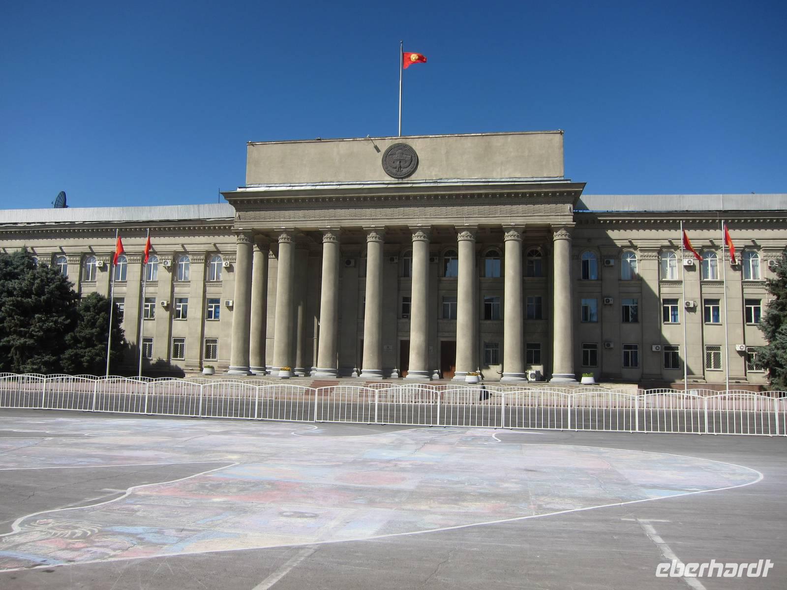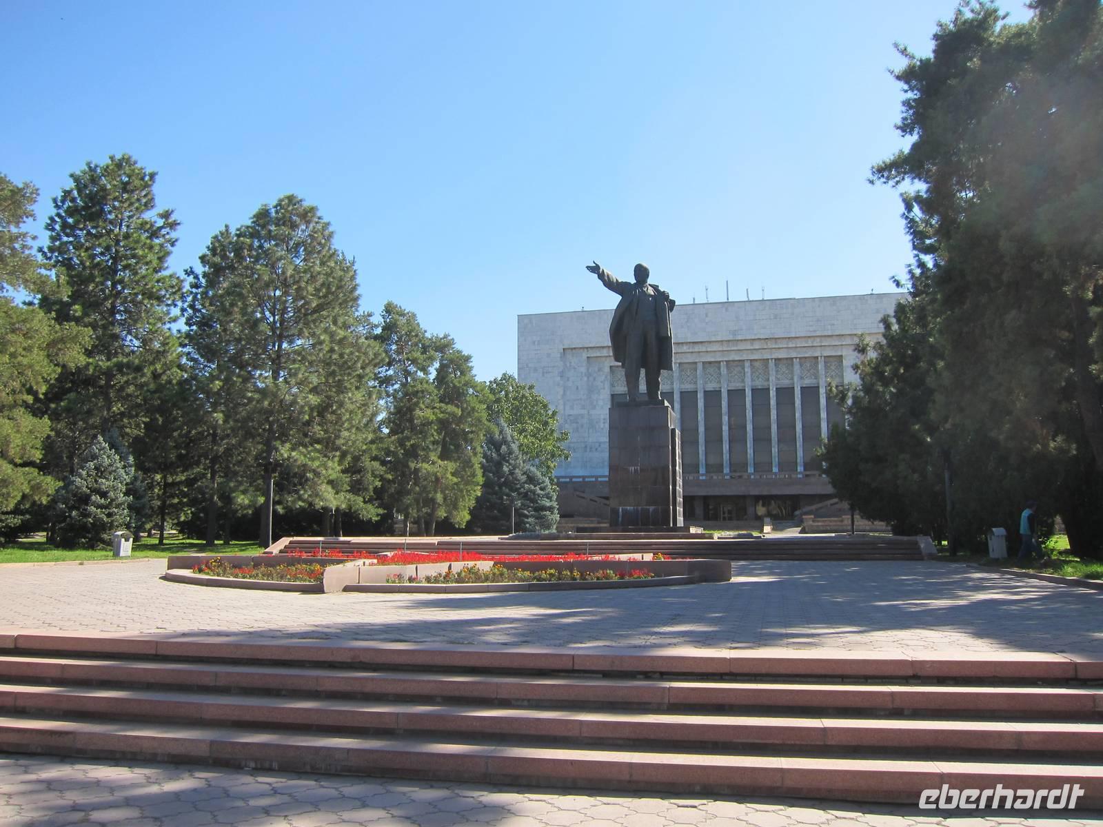 Dem Nachmittag verbrachten wir dann mit einem Stadtrundgang durch Bishkek. Dabei sahen wir die Statue von Kurmanjan Datka im Eichelpark. Weiter ging es durch den Eichelpark zur einst glühenden ewigen Flamme. Direkt daneben befindet sich das von außen weniger anschauliche russische Drama-Theater. Hier werden sowohl moderne, als auch klassische Stücke aufgeführt, jedoch immer auf Russisch. Vorbei am Theater für Oper und Ballett sowie an der Bibliothek der Stadt gingen wir in Richtung Regierungspalast. Dabei sahen wir noch die amerikanische Universität der Stadt, das heutige Nationalmuseum mit der Lenin-Statue davor. Der Regierungspalast wird auf Grund seines Aussehens auch das Weiße Haus von Bishkek genannt. Auf dem Ala Too Platz angekommen, sahen wir die bewachte kirgisische Flagge sowie ein Reiterstandbild des kirgisischen Nationalhelden Manas. Laut einem Nationalepos soll er die 40 kirgisischen Stämme vereint haben.