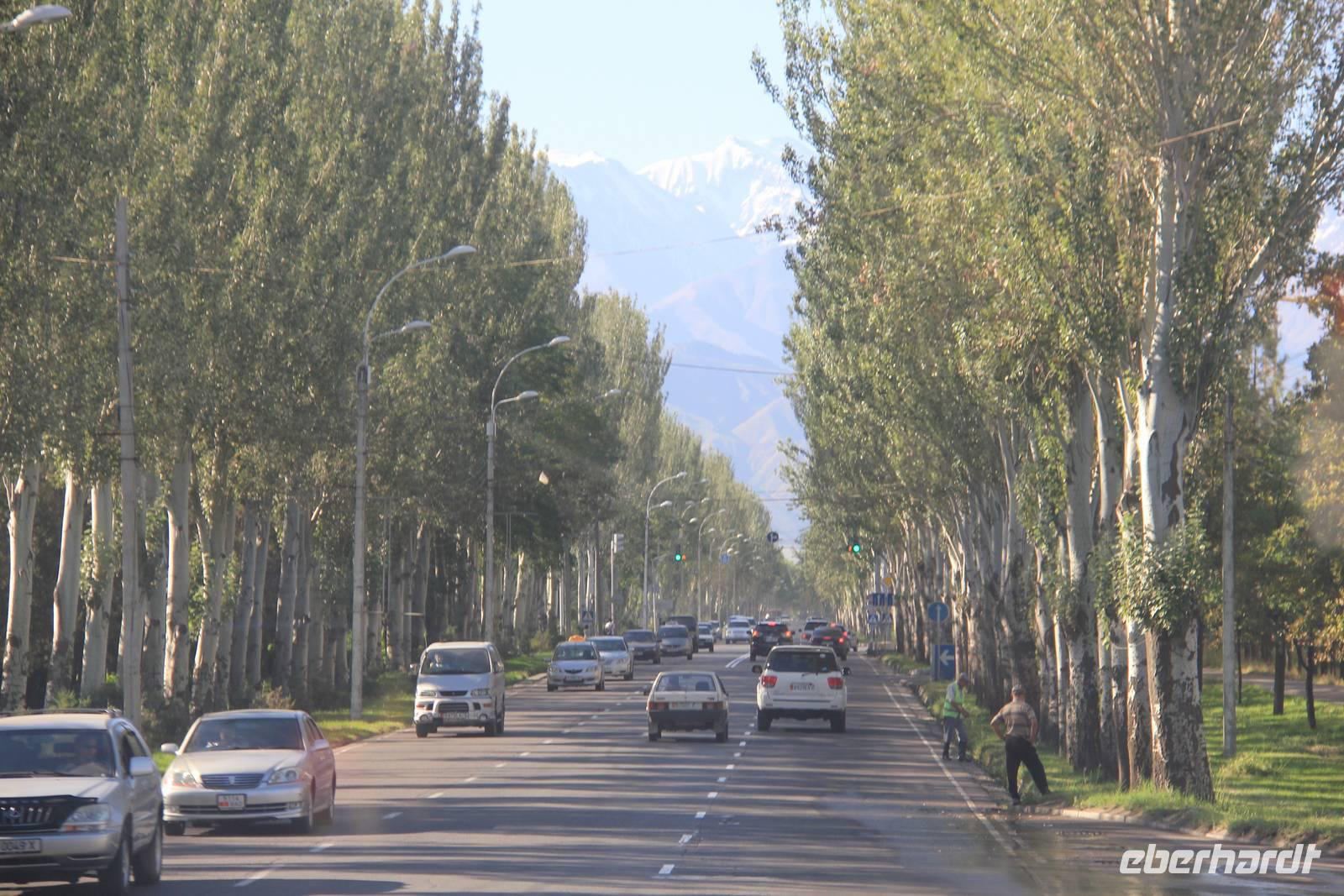 Dort angekommen hieß es: "Herzlich willkommen in Kirgistan!" Ab heute begleitete ich die Gruppe und wir fuhren gemeinsam mit unserem örtlichen Reiseleiter Mars, der uns den Rest der Reise begleiten wird, vom Flughafen ins Stadtzentrum von Bishkek. Nachdem wir kurz an einer Wechselstube gehalten hatten, ging es weiter zum Hotel.