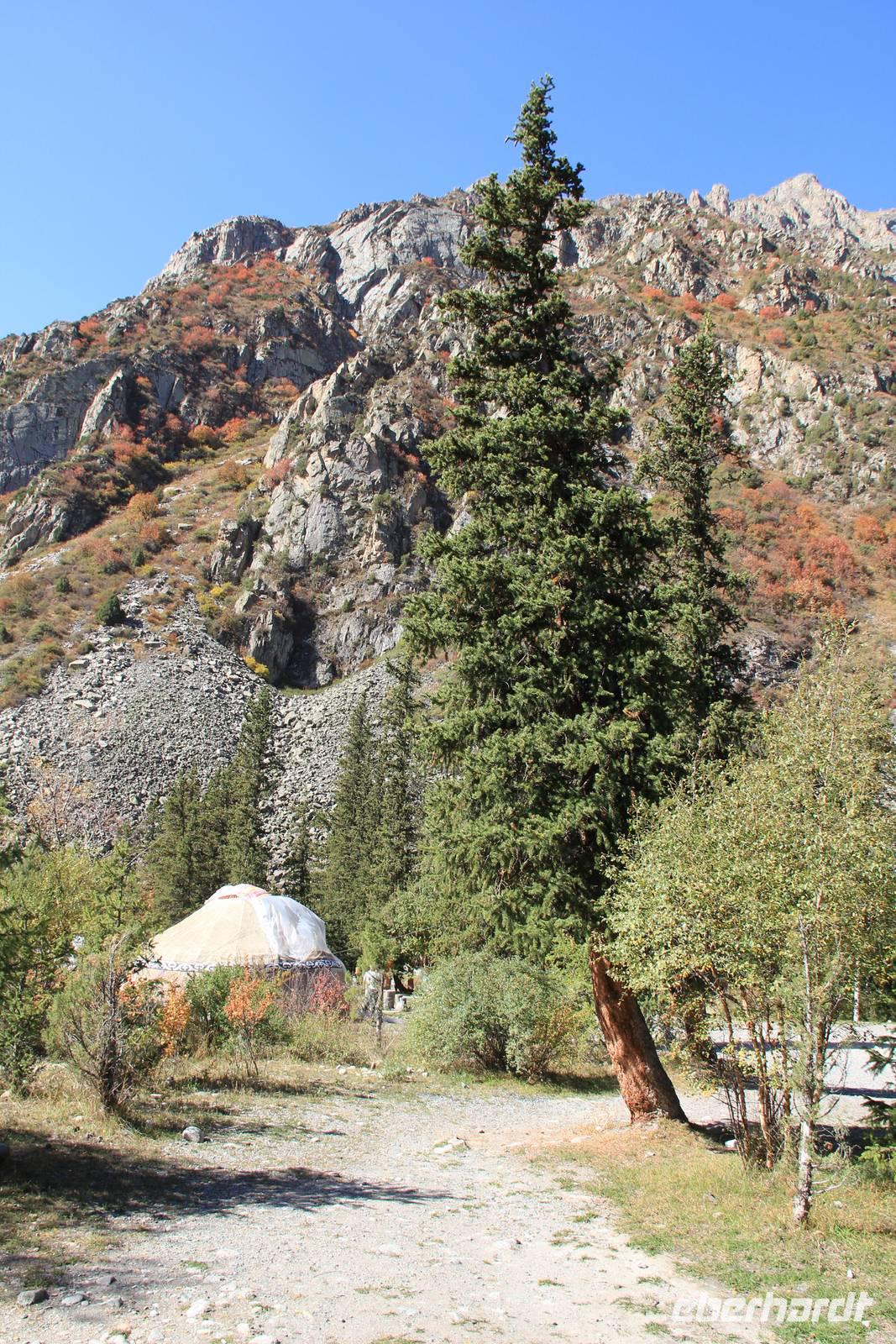 Zuerst fuhren wir jedoch in den Süden von Bishkek zum Ala Artscha Naturpark. Hier angekommen genossen wir die Natur in vollen Zügen. Entlang des gleichnamigen Flusses unternahmen wir eine kleine leichte Wanderung bis zu einer Jurte. Der Ausblick auf die schneebedeckten Berge und die teils grünen, teils schon herbstlich gelb und rot gefärbten Bäume war einzigartig.