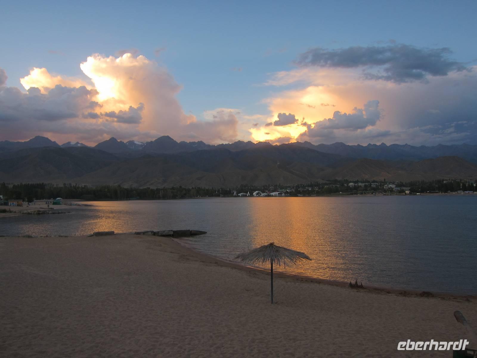 Am Abend kamen wir dann am idyllischen Issyk Kul See an. Manche nutzen gleich die Gunst der Stunde und gingen im See baden.