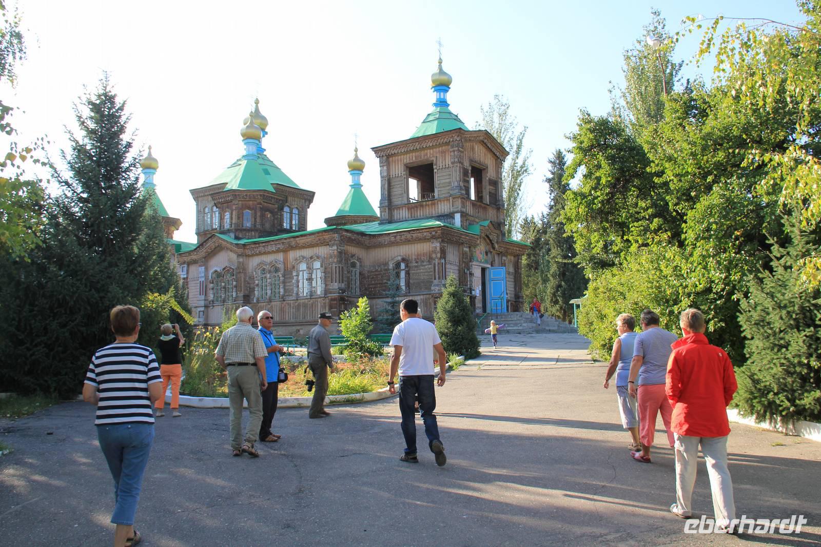 Bevor wir die Stadt Karakol verließen, fuhren wir noch zur russisch-orthodoxen Holzkirche, welche durch ihr elastisches Holz schob einige Erdbeben heil überstanden hat.
