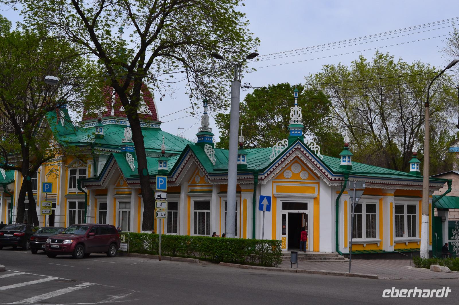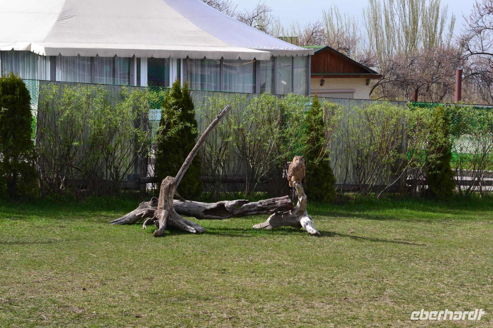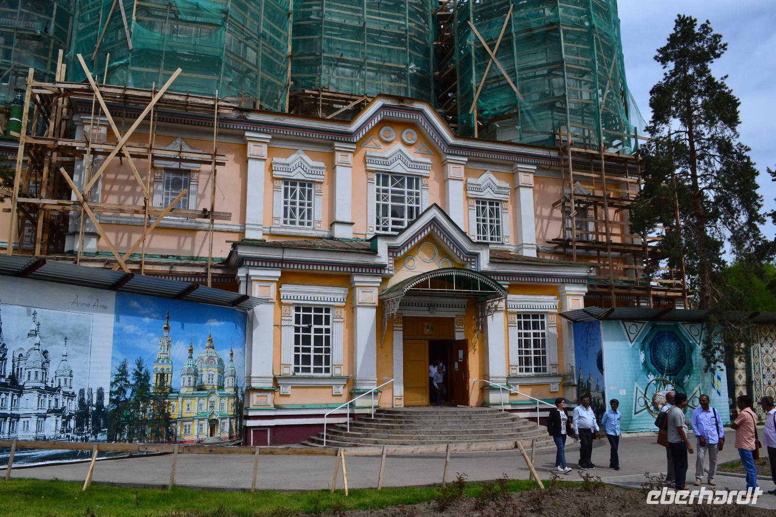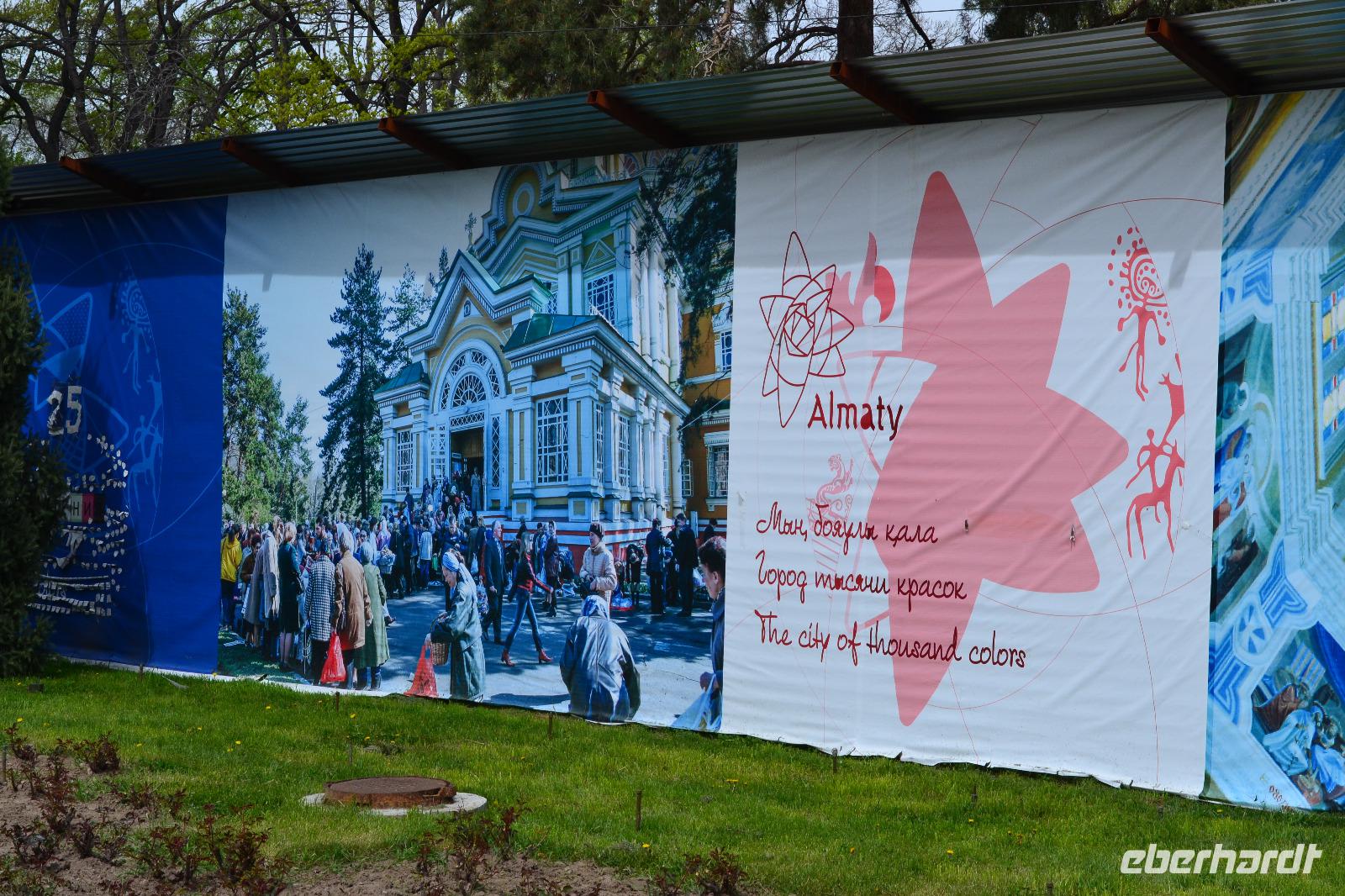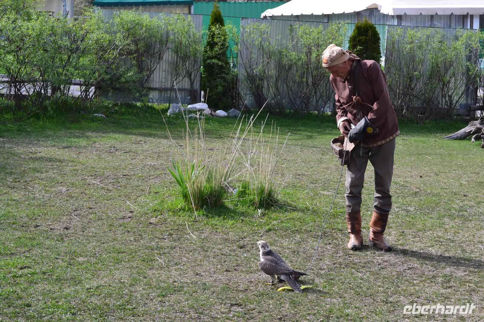 Nach einem sehr angenehmen und ruhigen Flug von Frankfurt nach Almaty landen wir kurz vor Mitternacht in Kasachstan, wo wir von unserer örtlichen Reiseleiterin Lena in Empfang genommen werden. Gegen 01:00 Uhr erreichen wir unser Hotel und verbringen unsere erste Nacht in Zentralasien. Wir können sogar ausschlafen, denn der kleine Stadtspaziergang am nächsten Tag beginnt erst um 11:00 Uhr. Beim Frühstück bewundern wir den riesigen Kronleuchter und die schönen Wandmalereien des kuppelförmigen Speisesaals, die uns schon in die Märchen- und Sagenwelt entführen. Die ehemalige kasachische Hauptstadt Almaty gilt als eine der grünsten Städte der ehemaligen Sowjetunion, was wir nach unserem kleinen Bummel bestätigen können. Wir sehen auch einige der schönsten Holzbauten des russischen Architekten Zenkow, darunter das ehemalige Versammlungshaus der Offiziere - heute ein Museum für kasachische Musikinstrumente - und die orthodoxe Auferstehungskathedrale mit einer goldenen Altarwand und prächtigen Ikonen. Am Nachmittag verlassen wir die Stadt und fahren in die schneebedeckten Berge, die wir schon beim Blick aus dem Hotelfenster bewundern konnten. Unser Ziel ist der Almaty-See, der malerisch in eine Schlucht mit steilen Hängen eingebettet ist, die auch Ende April immer noch von Schnee bedeckt sind. Der See, der als Trinkreservoir für die 1,4 Millionen Einwohner von Almaty dient, scheint von oben betrachtet sogar noch vereist zu sein. Lena erzählt uns, dass der Pegel des Sees im August erst seinen höchsten Stand erreichen wird. Anschließend werden wir in die Geheimnisse der Jagd mit verschiedenen Greifvögeln - Uhu, Falke, Steinadler, Seeadler, Bartgeier - eingewiesen, was sehr gefährlich und auf jeden Fall beeindruckend aussieht, besonders wenn so ein majestätischer Adler mit weit ausgebreiteten Schwingen nur ganz knapp über unsere Köpfe hinwegfegt. Ich habe zwar schon einmal eine ähnliche Vorführung erlebt, aber zu sehen, wie man mit einem Adler auch Wölfe jagen kann, war auch mir neu. Auf dem Weg zum Abendessen machen wir noch einen Fotostopp am kolossalen Säuleneingang zum Park der kasachischen Präsidenten. Nun haben wir uns unser Abendessen aber auch wirklich verdient. Nach vier Gängen inklusive einer ebenso kolossalen Honigtorte fallen wir erschöpft aber glücklich in unsere Hotelbetten.