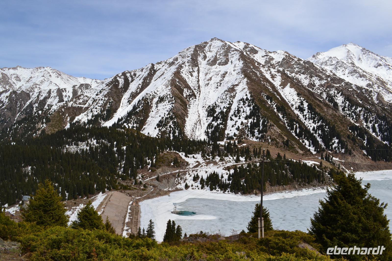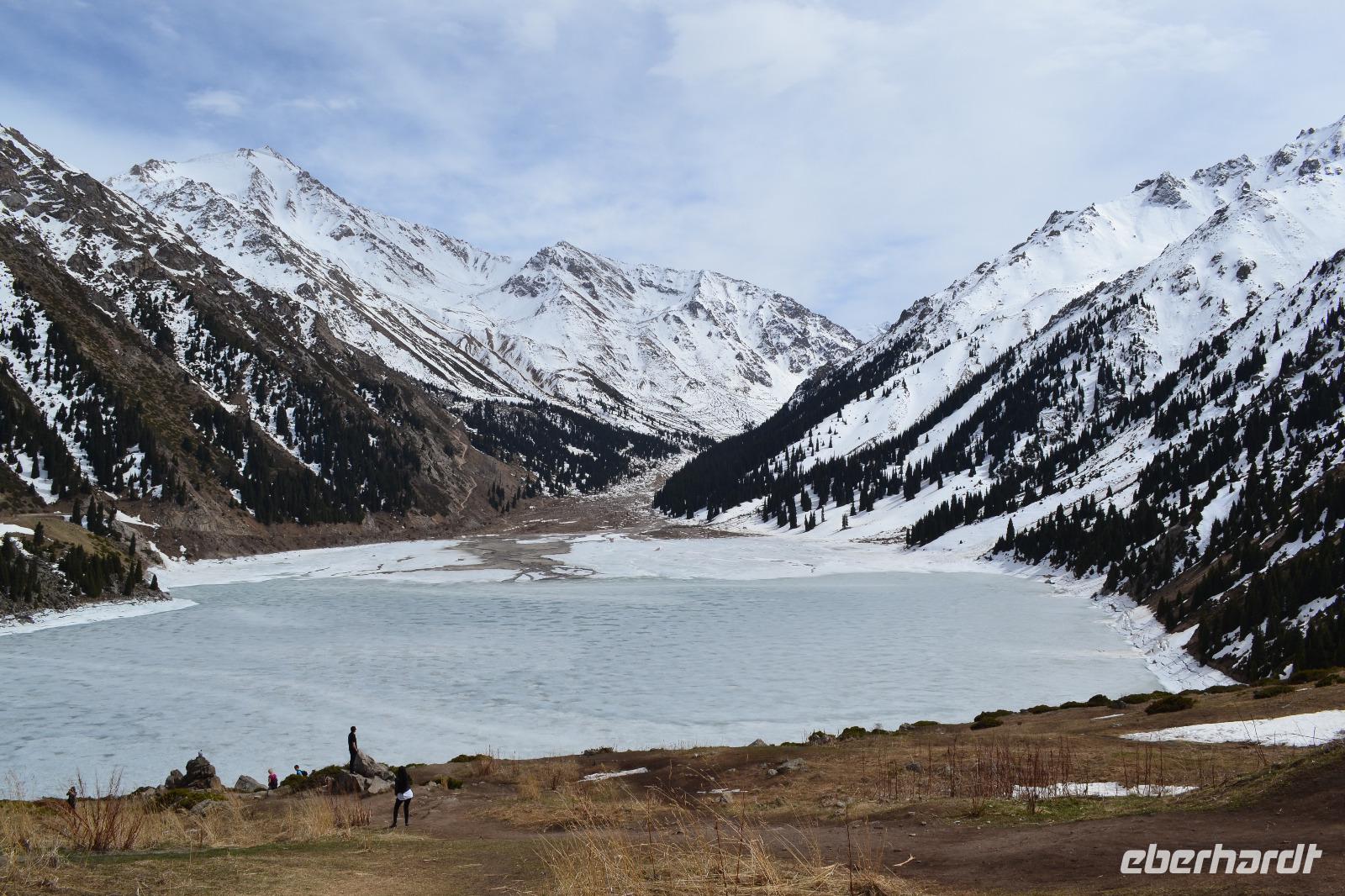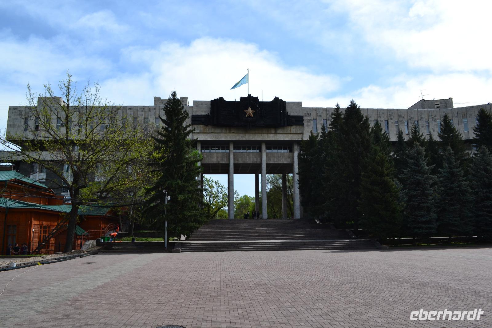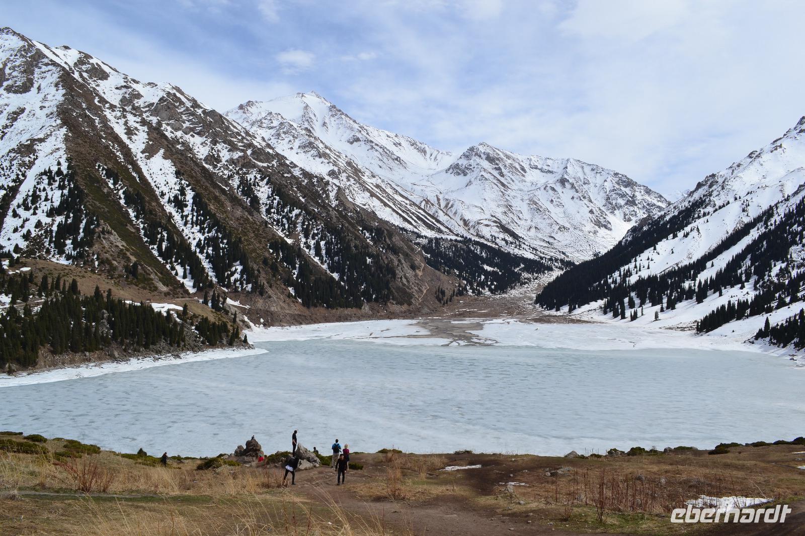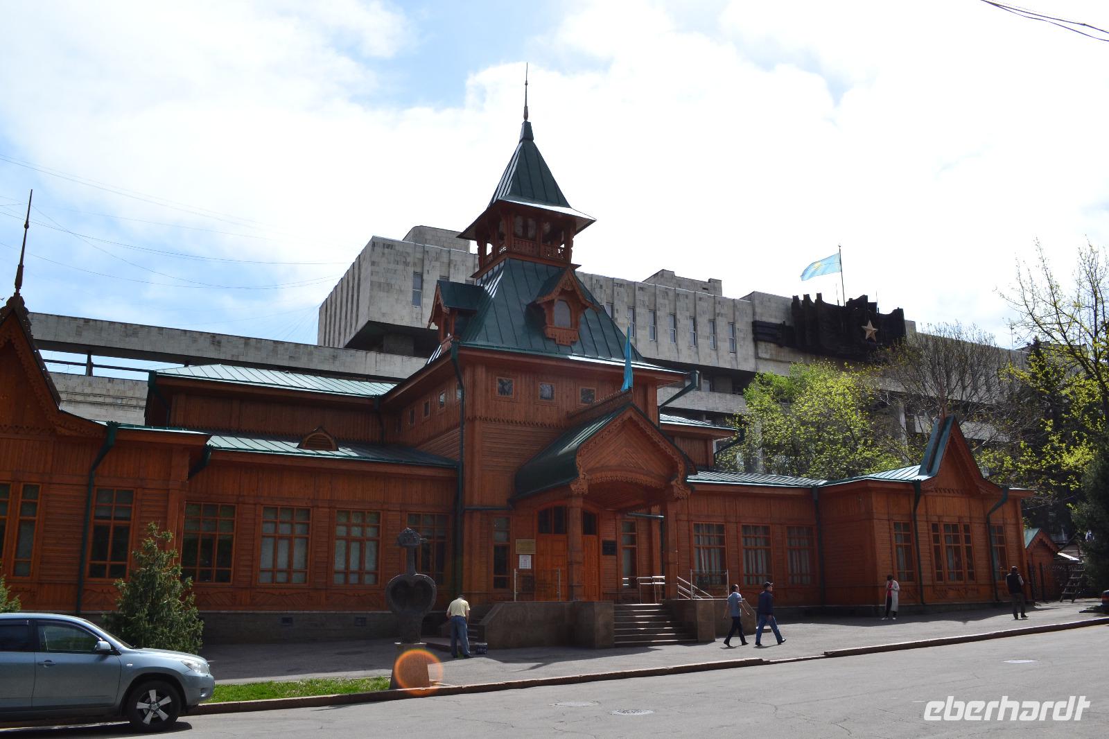 Nach einem sehr angenehmen und ruhigen Flug von Frankfurt nach Almaty landen wir kurz vor Mitternacht in Kasachstan, wo wir von unserer örtlichen Reiseleiterin Lena in Empfang genommen werden. Gegen 01:00 Uhr erreichen wir unser Hotel und verbringen unsere erste Nacht in Zentralasien. Wir können sogar ausschlafen, denn der kleine Stadtspaziergang am nächsten Tag beginnt erst um 11:00 Uhr. Beim Frühstück bewundern wir den riesigen Kronleuchter und die schönen Wandmalereien des kuppelförmigen Speisesaals, die uns schon in die Märchen- und Sagenwelt entführen. Die ehemalige kasachische Hauptstadt Almaty gilt als eine der grünsten Städte der ehemaligen Sowjetunion, was wir nach unserem kleinen Bummel bestätigen können. Wir sehen auch einige der schönsten Holzbauten des russischen Architekten Zenkow, darunter das ehemalige Versammlungshaus der Offiziere - heute ein Museum für kasachische Musikinstrumente - und die orthodoxe Auferstehungskathedrale mit einer goldenen Altarwand und prächtigen Ikonen. Am Nachmittag verlassen wir die Stadt und fahren in die schneebedeckten Berge, die wir schon beim Blick aus dem Hotelfenster bewundern konnten. Unser Ziel ist der Almaty-See, der malerisch in eine Schlucht mit steilen Hängen eingebettet ist, die auch Ende April immer noch von Schnee bedeckt sind. Der See, der als Trinkreservoir für die 1,4 Millionen Einwohner von Almaty dient, scheint von oben betrachtet sogar noch vereist zu sein. Lena erzählt uns, dass der Pegel des Sees im August erst seinen höchsten Stand erreichen wird. Anschließend werden wir in die Geheimnisse der Jagd mit verschiedenen Greifvögeln - Uhu, Falke, Steinadler, Seeadler, Bartgeier - eingewiesen, was sehr gefährlich und auf jeden Fall beeindruckend aussieht, besonders wenn so ein majestätischer Adler mit weit ausgebreiteten Schwingen nur ganz knapp über unsere Köpfe hinwegfegt. Ich habe zwar schon einmal eine ähnliche Vorführung erlebt, aber zu sehen, wie man mit einem Adler auch Wölfe jagen kann, war auch mir neu. Auf dem Weg zum Abendessen machen wir noch einen Fotostopp am kolossalen Säuleneingang zum Park der kasachischen Präsidenten. Nun haben wir uns unser Abendessen aber auch wirklich verdient. Nach vier Gängen inklusive einer ebenso kolossalen Honigtorte fallen wir erschöpft aber glücklich in unsere Hotelbetten.