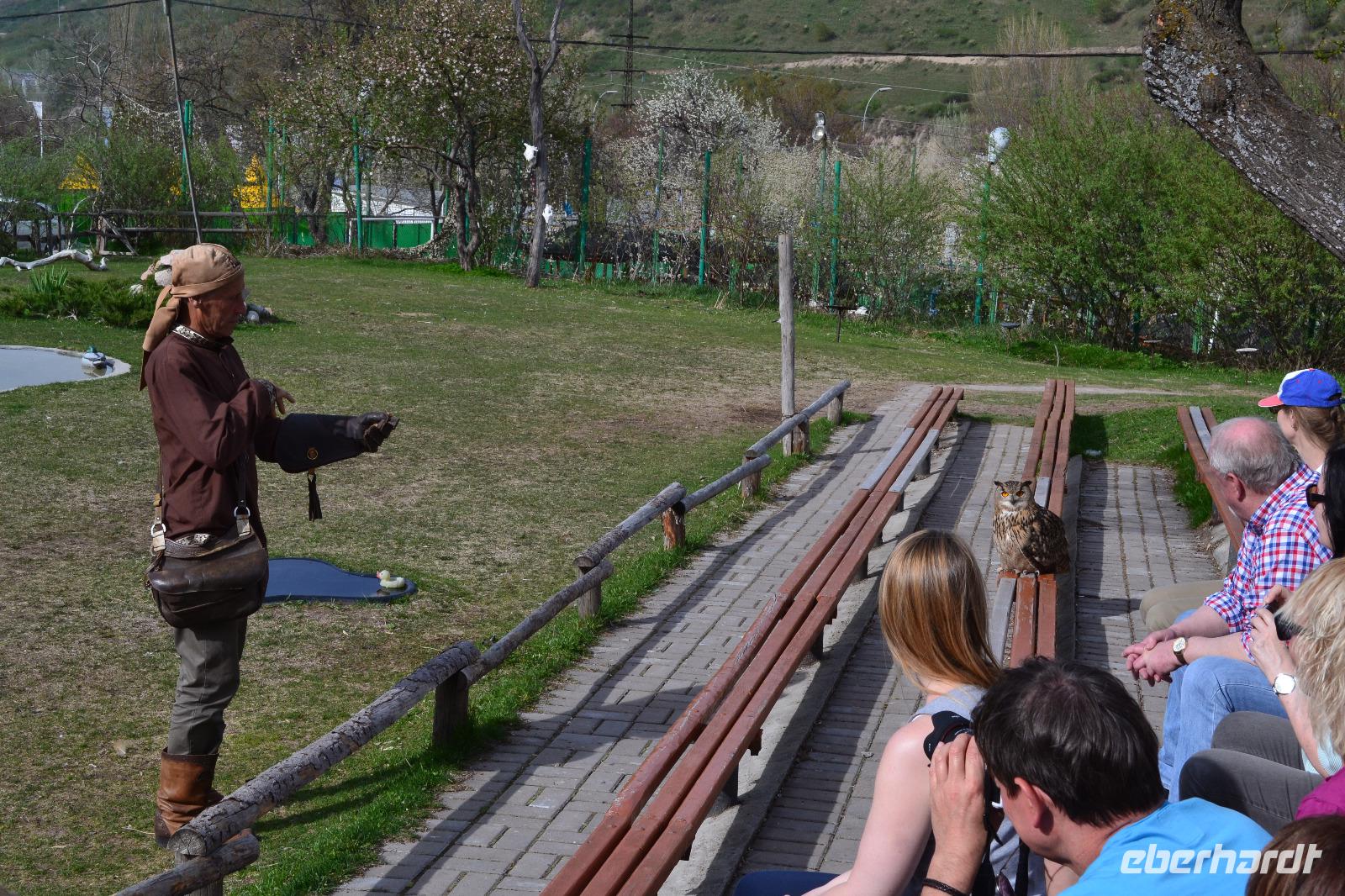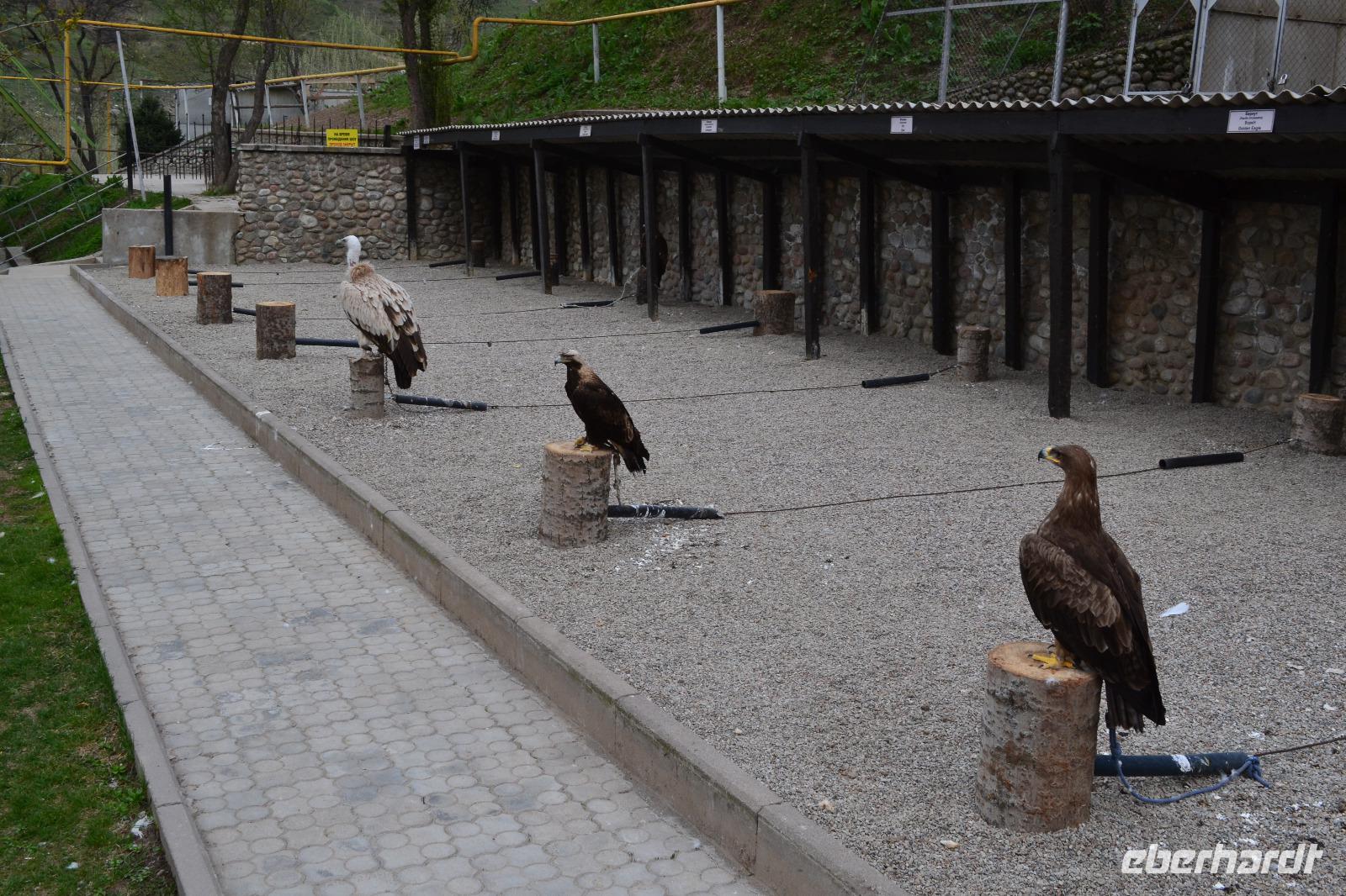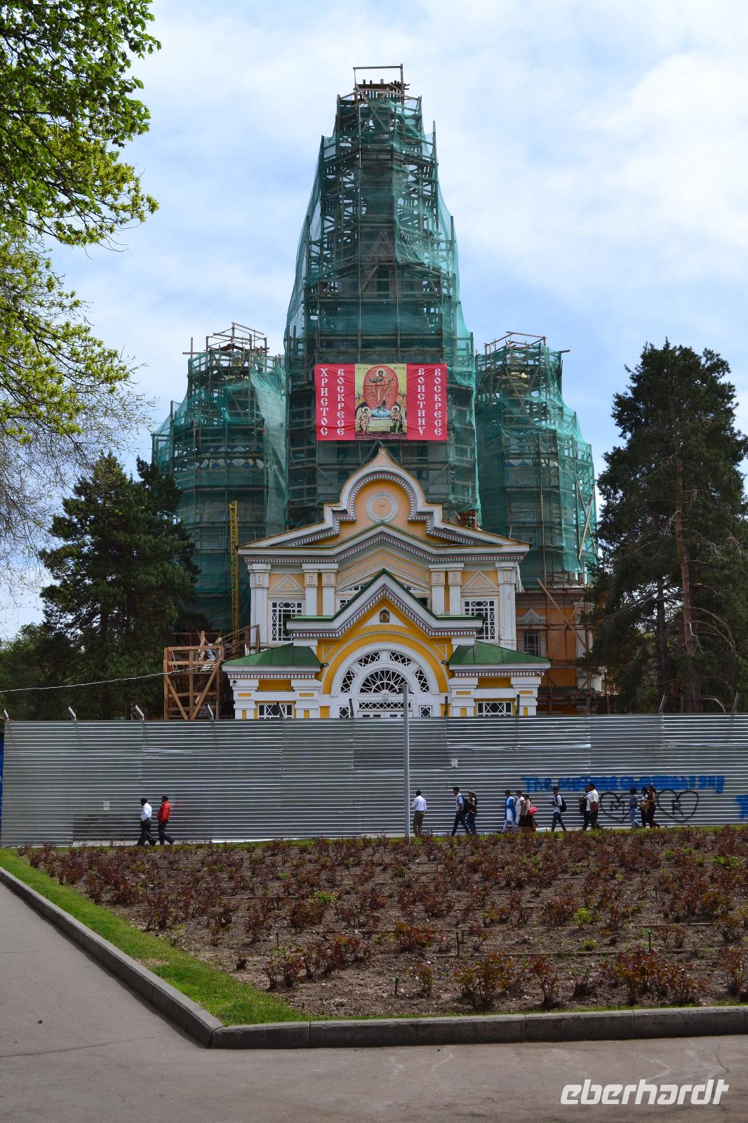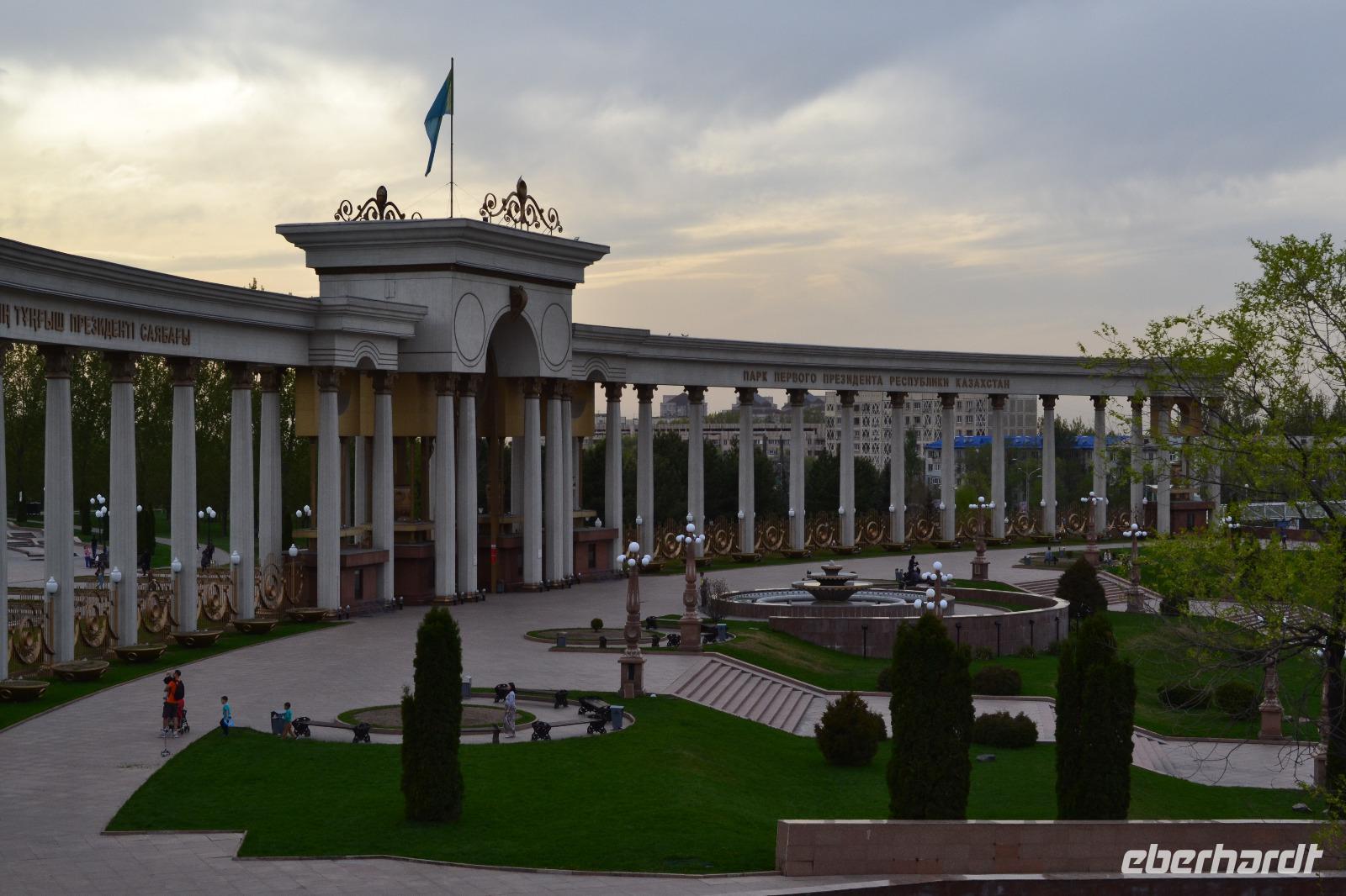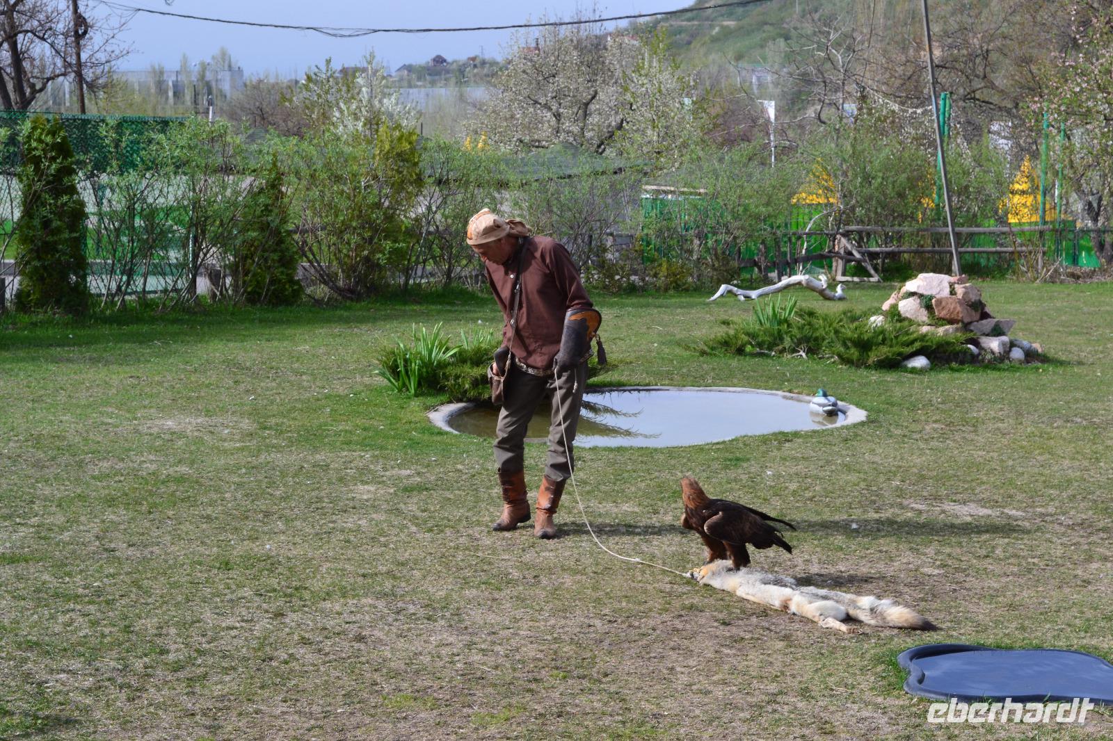 Nach einem sehr angenehmen und ruhigen Flug von Frankfurt nach Almaty landen wir kurz vor Mitternacht in Kasachstan, wo wir von unserer örtlichen Reiseleiterin Lena in Empfang genommen werden. Gegen 01:00 Uhr erreichen wir unser Hotel und verbringen unsere erste Nacht in Zentralasien. Wir können sogar ausschlafen, denn der kleine Stadtspaziergang am nächsten Tag beginnt erst um 11:00 Uhr. Beim Frühstück bewundern wir den riesigen Kronleuchter und die schönen Wandmalereien des kuppelförmigen Speisesaals, die uns schon in die Märchen- und Sagenwelt entführen. Die ehemalige kasachische Hauptstadt Almaty gilt als eine der grünsten Städte der ehemaligen Sowjetunion, was wir nach unserem kleinen Bummel bestätigen können. Wir sehen auch einige der schönsten Holzbauten des russischen Architekten Zenkow, darunter das ehemalige Versammlungshaus der Offiziere - heute ein Museum für kasachische Musikinstrumente - und die orthodoxe Auferstehungskathedrale mit einer goldenen Altarwand und prächtigen Ikonen. Am Nachmittag verlassen wir die Stadt und fahren in die schneebedeckten Berge, die wir schon beim Blick aus dem Hotelfenster bewundern konnten. Unser Ziel ist der Almaty-See, der malerisch in eine Schlucht mit steilen Hängen eingebettet ist, die auch Ende April immer noch von Schnee bedeckt sind. Der See, der als Trinkreservoir für die 1,4 Millionen Einwohner von Almaty dient, scheint von oben betrachtet sogar noch vereist zu sein. Lena erzählt uns, dass der Pegel des Sees im August erst seinen höchsten Stand erreichen wird. Anschließend werden wir in die Geheimnisse der Jagd mit verschiedenen Greifvögeln - Uhu, Falke, Steinadler, Seeadler, Bartgeier - eingewiesen, was sehr gefährlich und auf jeden Fall beeindruckend aussieht, besonders wenn so ein majestätischer Adler mit weit ausgebreiteten Schwingen nur ganz knapp über unsere Köpfe hinwegfegt. Ich habe zwar schon einmal eine ähnliche Vorführung erlebt, aber zu sehen, wie man mit einem Adler auch Wölfe jagen kann, war auch mir neu. Auf dem Weg zum Abendessen machen wir noch einen Fotostopp am kolossalen Säuleneingang zum Park der kasachischen Präsidenten. Nun haben wir uns unser Abendessen aber auch wirklich verdient. Nach vier Gängen inklusive einer ebenso kolossalen Honigtorte fallen wir erschöpft aber glücklich in unsere Hotelbetten.