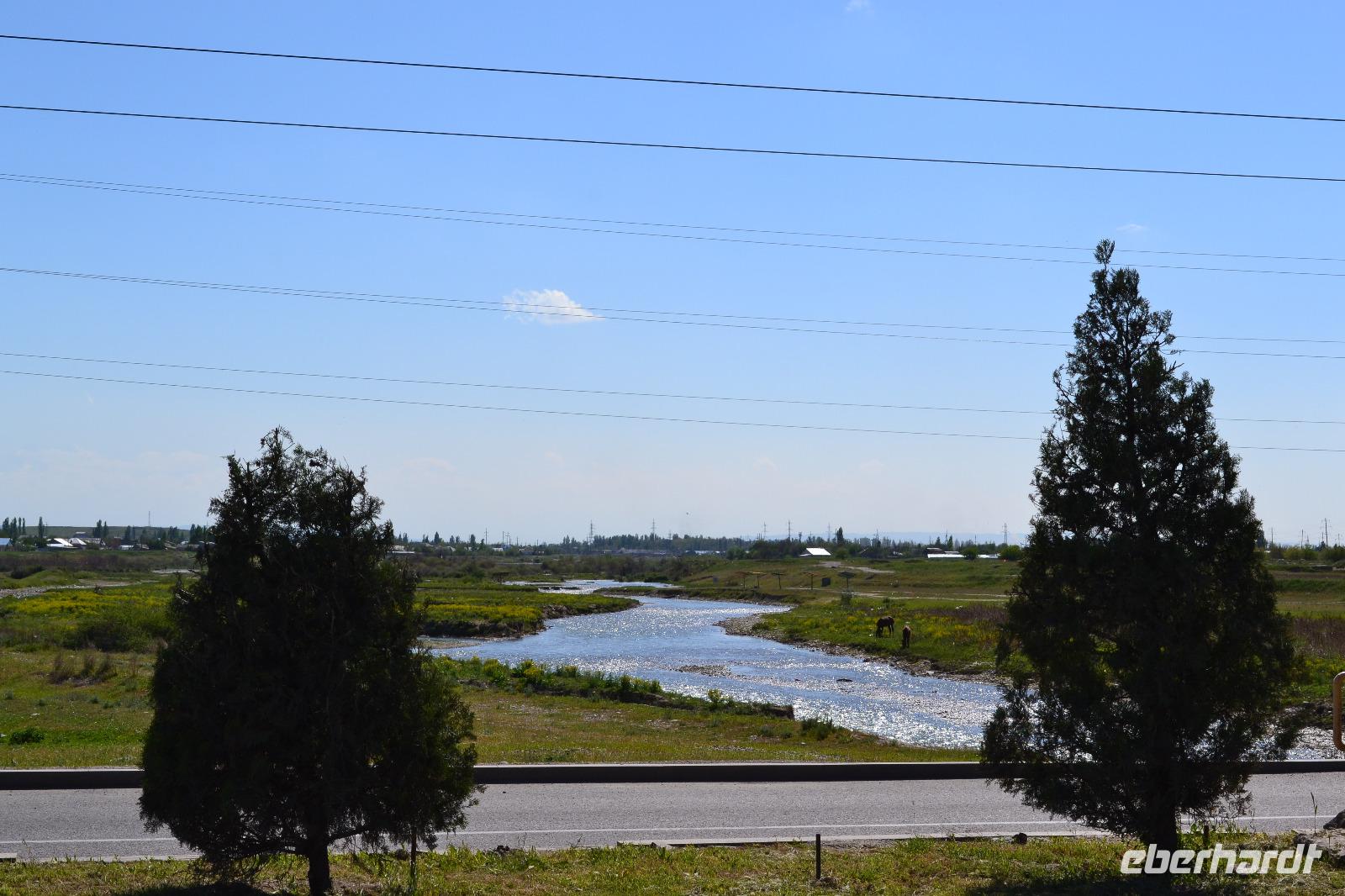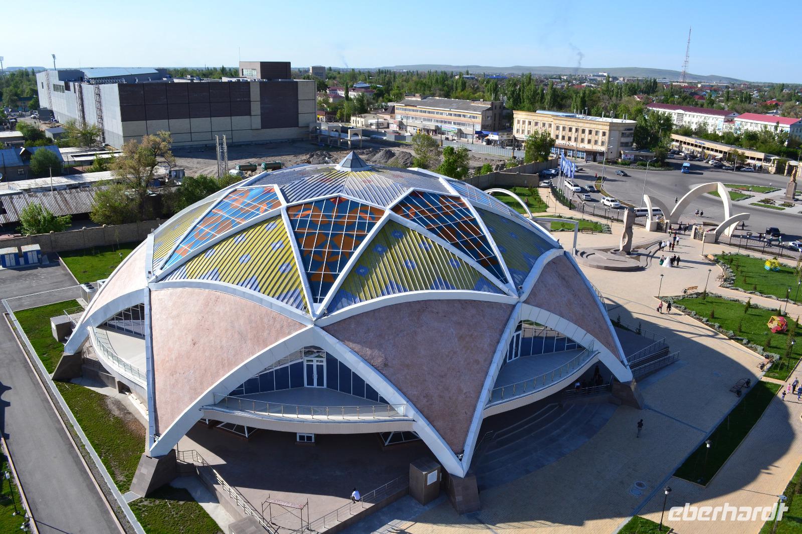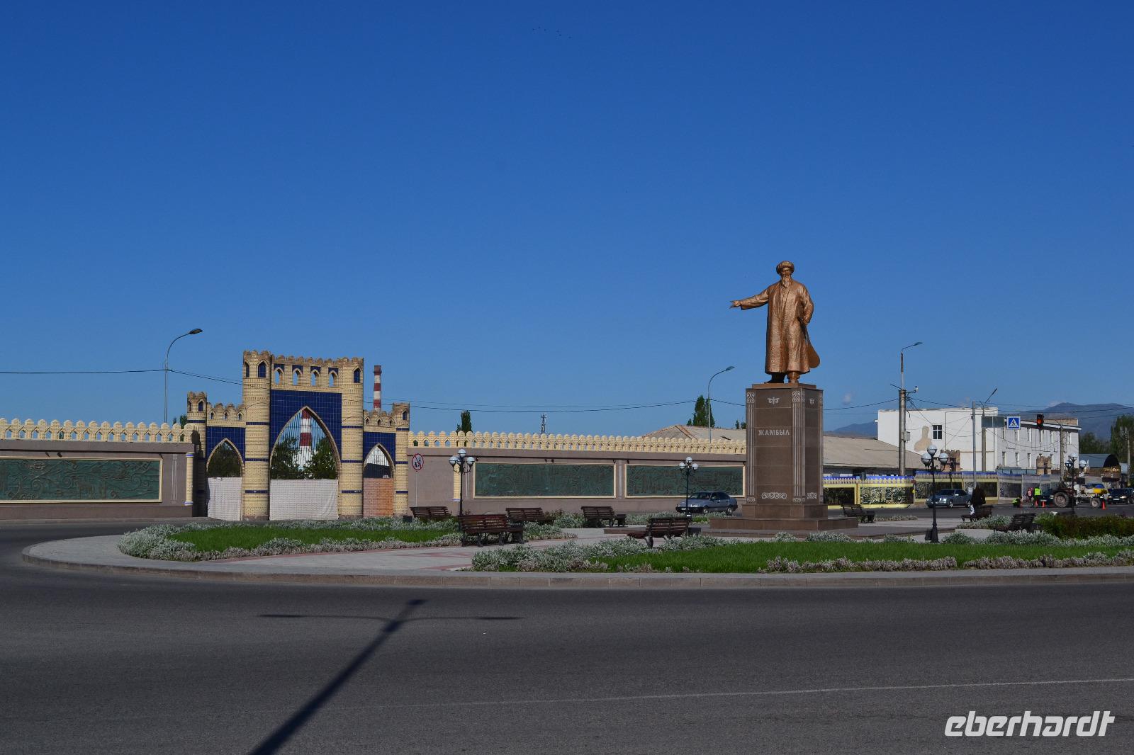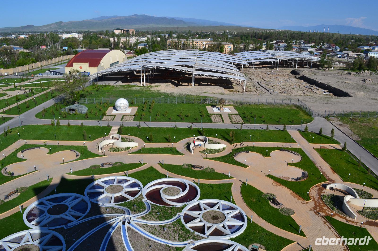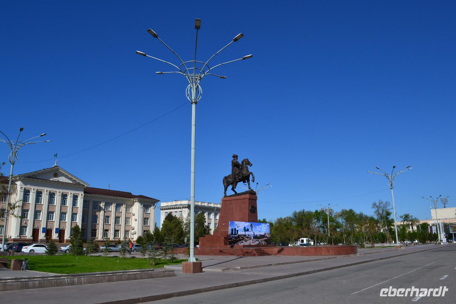 Am Vormittag führt uns Lena durch ihre Heimatstadt Bishkek. Während wir über den Ala-Too-Platz, den Alten Platz und durch den Eichenpark bummeln, erzählt uns Lena von den Revolutionen 2005 und 2010, die Kirgisistan schwer erschütterten. Daran waren nicht zuletzt das starke ökonomische Gefälle zwischen dem Nordteil und dem Südteil des Landes sowie die patriarchalischen Clanstrukturen Schuld. Nach der Stadtbesichtigung fahren wir zurück nach Kasachstan. Auch diesmal geht der Grenzübertritt - von einer einzigen längeren Kofferkontrolle abgesehen - relativ unkompliziert vonstatten. Zurück in Kasachstan folgen wir dem Grenzverlauf in Richtung Westen bis nach Taras. Am Fluss Talas halten wir kurz an, denn hier in der Nähe fand 761 n. Chr. eine schicksalhafte Schlacht zwischen Chinesen und Arabern statt. Der Sieg der Araber leitete letztendlich die Vorherrschaft des Islam in Zentralasien ein. Unser Hotel in Taras erreichen wir am Nachmittag. Bis zum Abendessen ist noch etwas Zeit, weshalb Lena und ich einen Spaziergang zu einem Aussichtsturm anbieten, von dem man einen Blick über die Stadt und die benachbarten Ausgrabungsstätten hat. Die alte Karawanenstadt mit einer Geschichte, die mehr als 2.000 Jahre zurückreicht, wurde im 13. Jahrhundert von den Mongolen verwüstet, und später ein paar Kilometer weiter wieder aufgebaut.