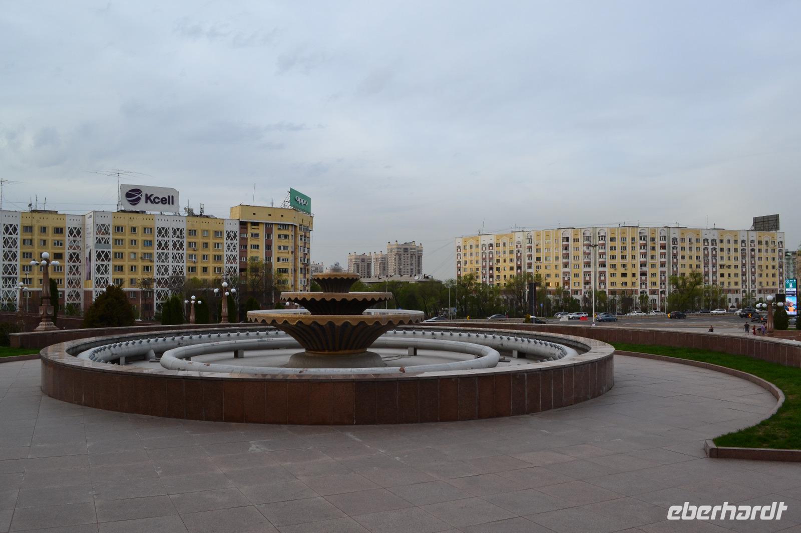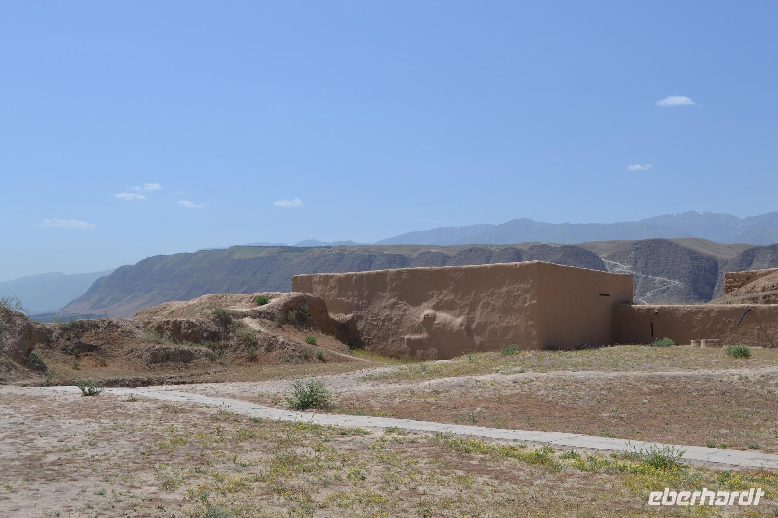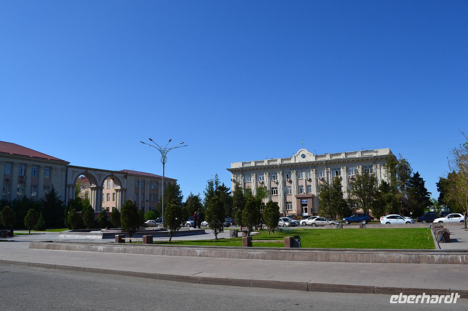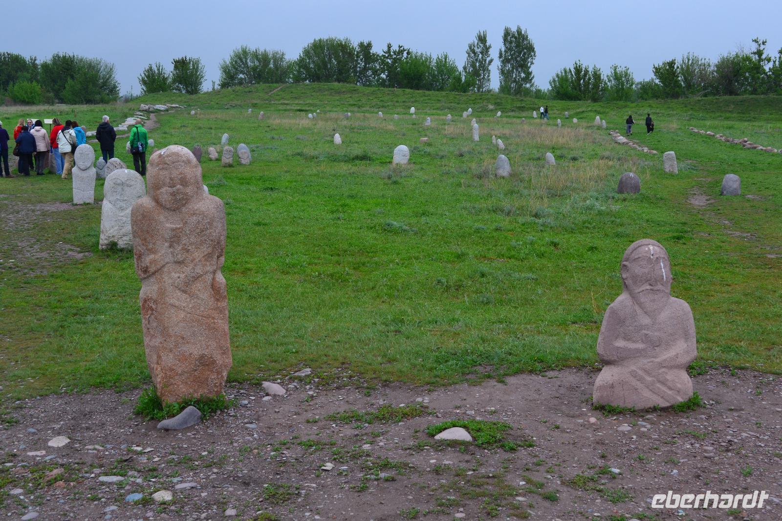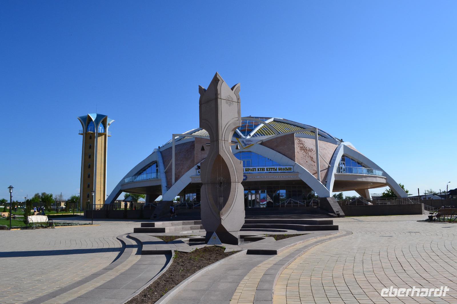 Am Vormittag führt uns Lena durch ihre Heimatstadt Bishkek. Während wir über den Ala-Too-Platz, den Alten Platz und durch den Eichenpark bummeln, erzählt uns Lena von den Revolutionen 2005 und 2010, die Kirgisistan schwer erschütterten. Daran waren nicht zuletzt das starke ökonomische Gefälle zwischen dem Nordteil und dem Südteil des Landes sowie die patriarchalischen Clanstrukturen Schuld. Nach der Stadtbesichtigung fahren wir zurück nach Kasachstan. Auch diesmal geht der Grenzübertritt - von einer einzigen längeren Kofferkontrolle abgesehen - relativ unkompliziert vonstatten. Zurück in Kasachstan folgen wir dem Grenzverlauf in Richtung Westen bis nach Taras. Am Fluss Talas halten wir kurz an, denn hier in der Nähe fand 761 n. Chr. eine schicksalhafte Schlacht zwischen Chinesen und Arabern statt. Der Sieg der Araber leitete letztendlich die Vorherrschaft des Islam in Zentralasien ein. Unser Hotel in Taras erreichen wir am Nachmittag. Bis zum Abendessen ist noch etwas Zeit, weshalb Lena und ich einen Spaziergang zu einem Aussichtsturm anbieten, von dem man einen Blick über die Stadt und die benachbarten Ausgrabungsstätten hat. Die alte Karawanenstadt mit einer Geschichte, die mehr als 2.000 Jahre zurückreicht, wurde im 13. Jahrhundert von den Mongolen verwüstet, und später ein paar Kilometer weiter wieder aufgebaut.