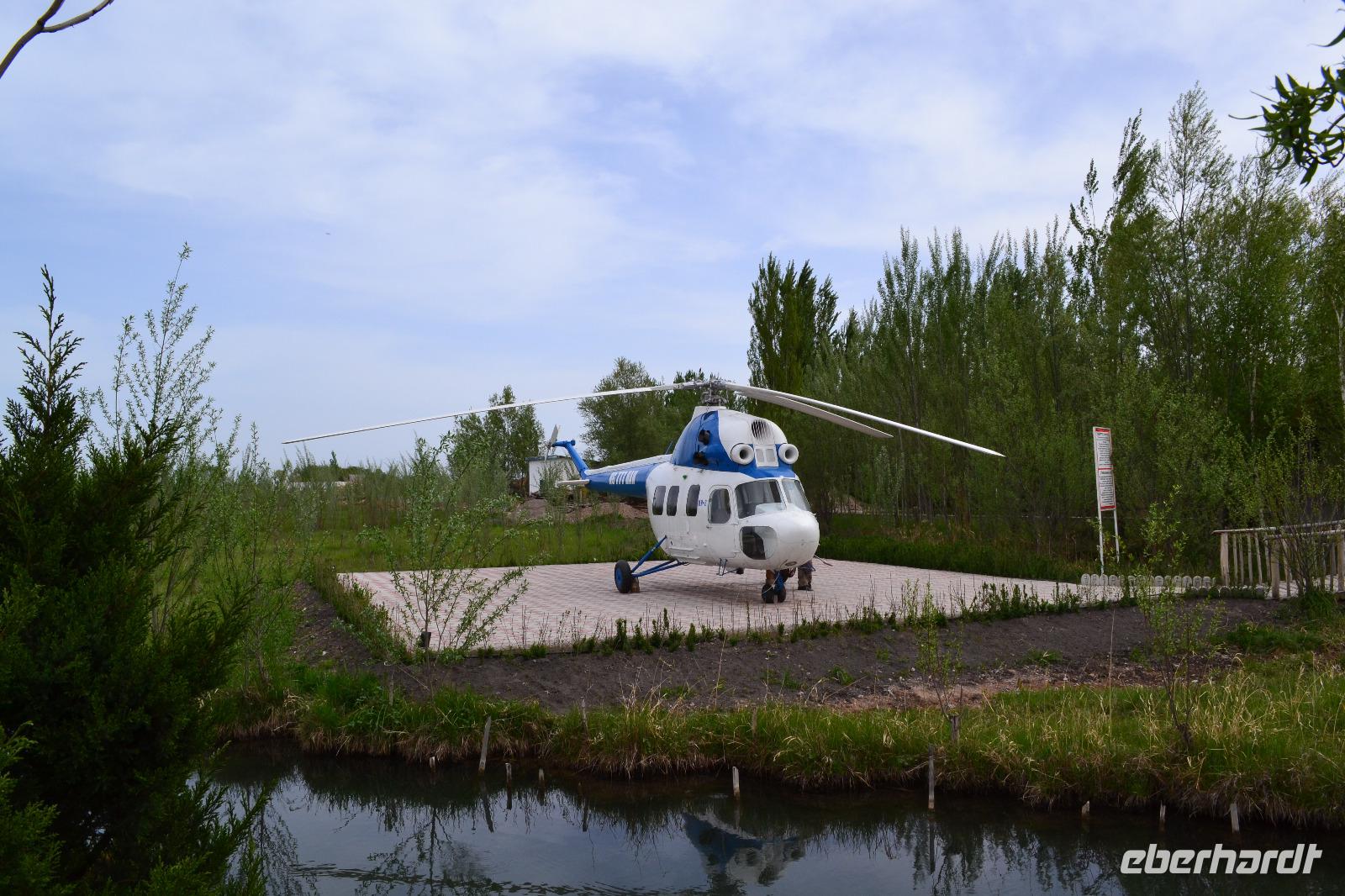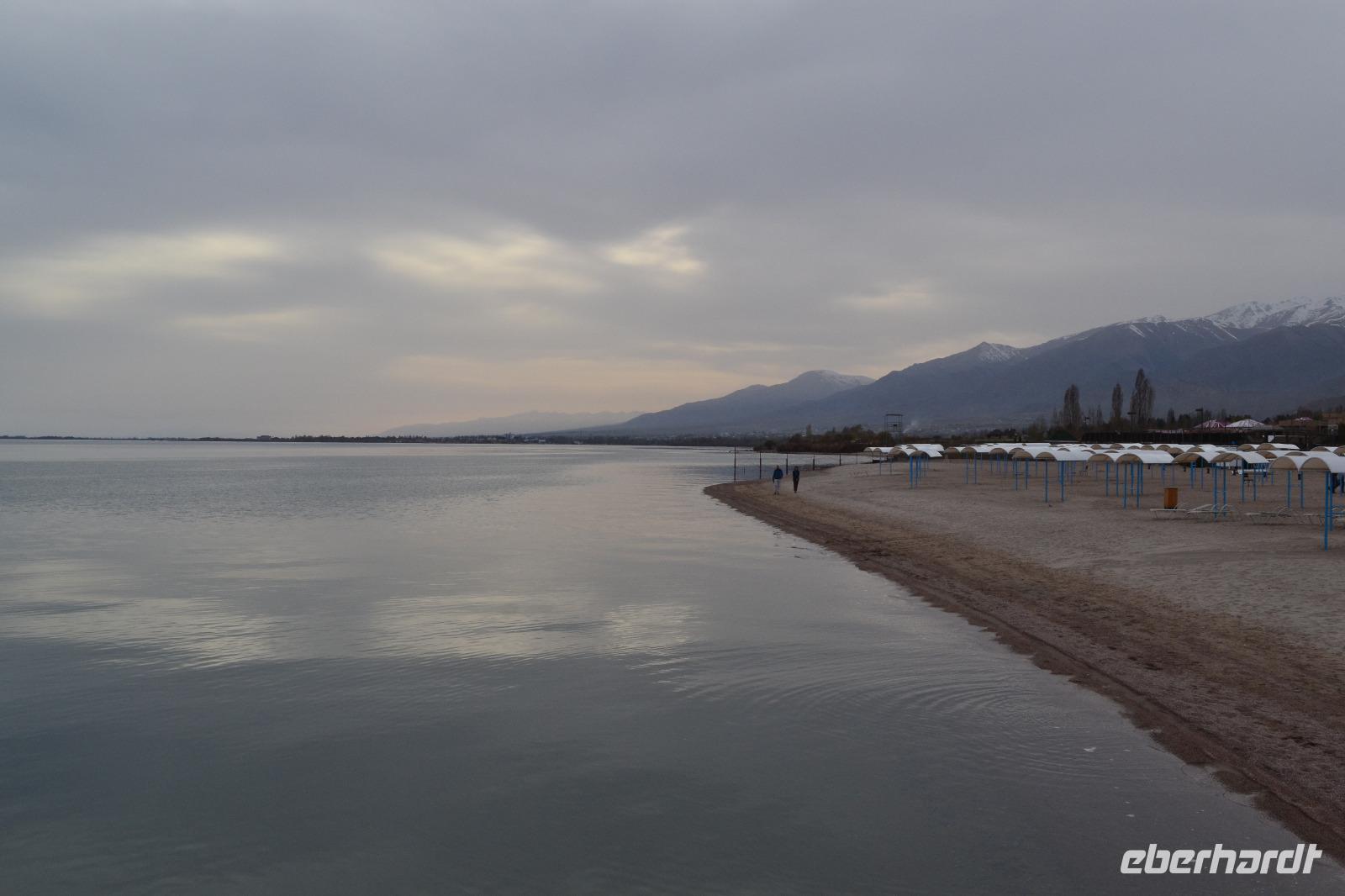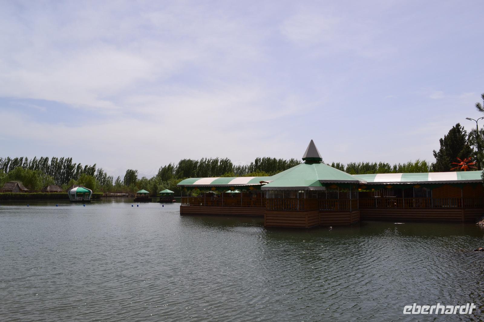 Da der Grenzübergang über den Kegen-Pass gesperrt ist, müssen wir einen großen Bogen fahren, um zu unserem nächsten Hotel am Issyk-Kul-See zu gelangen. Erst einmal fahren wir Richtung Bishkek zur kasachisch-kirgisischen Grenze. Zwar müssen wir unsere Koffer selbst über die Grenze ziehen (oder Kofferträger mieten), aber in einer knappen halben Stunde ist alles erledigt, und wir können wieder in unseren Bus einsteigen. In Kirgistan biegen wir dann Richtung Süden und damit Richtung Berge ab. An einem kleinen See mit Strand machen wir Mittagspause und erhalten ein reichhaltiges Menü im Café Hawaii. Der Besitzer ist offenbar ein großer Fan des amerikanischen Bundesstaates und hat sich den See mit Palmen dekoriert. Außerdem stehen einige Statuen in der Gegend, die offenbar aus Ersatzteilen und Metallobjekten zusammengeschweißt sind, darunter auch ein Drache. Ach, und ein alter MIL-Hubschrauber steht auch noch rum. Ein bisschen surreal wirkt das Grundstück dadurch schon. Gerade als wir abfahren wollen, kommt eine Hochzeitsgesellschaft an, die wir natürlich neugierig beobachten. Bis zum Issyk-Kul-See sind es immer noch einige Kilometer. Lena vertreibt uns die Zeit, indem sie uns von den uns zum Teil sehr fremden Gebräuchen und Traditionen ihrer Heimat erzählt. Neben uns taucht dann die einspurige Eisenbahnlinie von Bishkek nach Balyktschy auf, der wir bis zum Westufer des Issyk-Kul-Sees folgen. Der im Tianshan-Gebirge gelegene See ist der zweitgrößte Gebirgssee der Erde, verfügt über 118 Zuflüsse, aber keinen Abfluss. Er friert niemals zu, was teilweise an den heißen Quellen am Seeboden, teilweise am recht hohen Salzgehalt liegt. Bis nach Tscholponata fahren wir am Nordufer des Sees entlang. Uns fallen die vielen Straßenbaustellen auf, und Lena erklärt uns, dass alles für die internationalen Nomadenspiele vorbereitet wird, die bald hier in der Gegend stattfinden werden. Unser Hotelgebäude in Tscholponata ist Teil einer größeren Ferienanlage direkt am See. Vor dem Abendessen können wir uns noch ein bisschen die Füße vertreten und bis zum Seeufer spazieren, wo es sogar eine Sauna gibt.