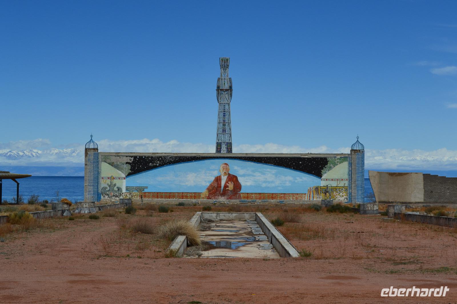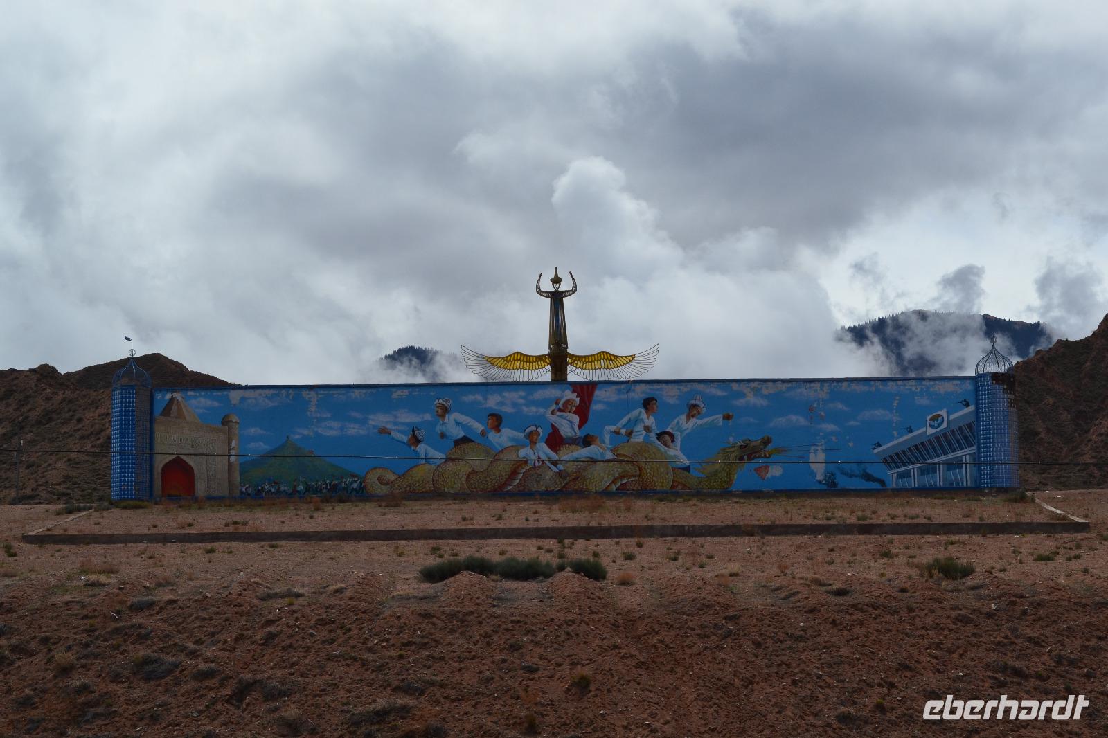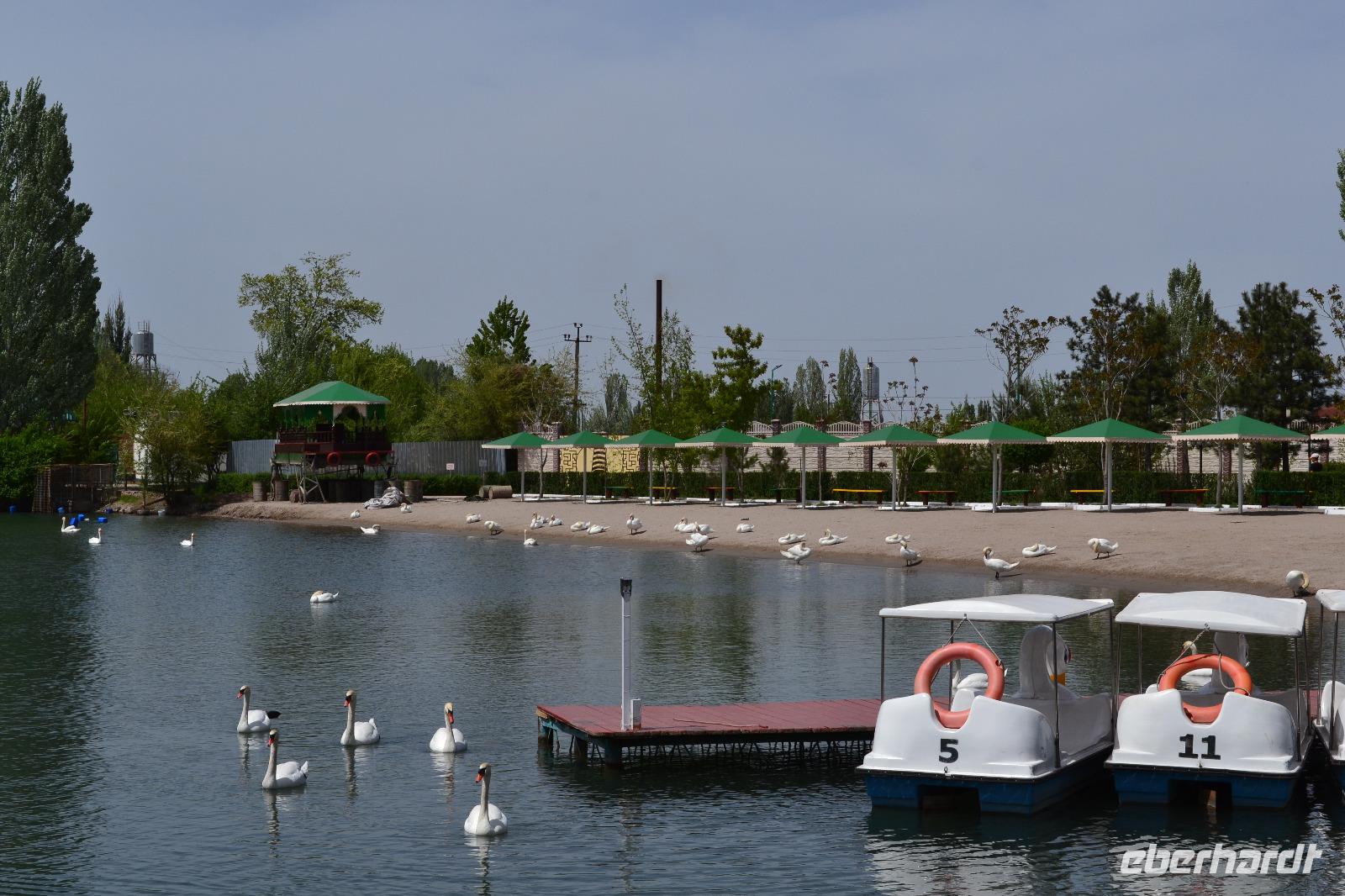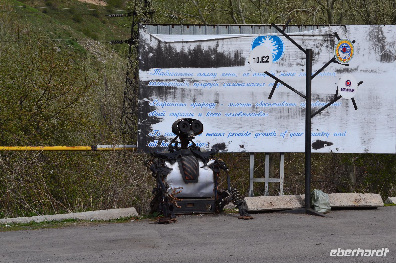 Da der Grenzübergang über den Kegen-Pass gesperrt ist, müssen wir einen großen Bogen fahren, um zu unserem nächsten Hotel am Issyk-Kul-See zu gelangen. Erst einmal fahren wir Richtung Bishkek zur kasachisch-kirgisischen Grenze. Zwar müssen wir unsere Koffer selbst über die Grenze ziehen (oder Kofferträger mieten), aber in einer knappen halben Stunde ist alles erledigt, und wir können wieder in unseren Bus einsteigen. In Kirgistan biegen wir dann Richtung Süden und damit Richtung Berge ab. An einem kleinen See mit Strand machen wir Mittagspause und erhalten ein reichhaltiges Menü im Café Hawaii. Der Besitzer ist offenbar ein großer Fan des amerikanischen Bundesstaates und hat sich den See mit Palmen dekoriert. Außerdem stehen einige Statuen in der Gegend, die offenbar aus Ersatzteilen und Metallobjekten zusammengeschweißt sind, darunter auch ein Drache. Ach, und ein alter MIL-Hubschrauber steht auch noch rum. Ein bisschen surreal wirkt das Grundstück dadurch schon. Gerade als wir abfahren wollen, kommt eine Hochzeitsgesellschaft an, die wir natürlich neugierig beobachten. Bis zum Issyk-Kul-See sind es immer noch einige Kilometer. Lena vertreibt uns die Zeit, indem sie uns von den uns zum Teil sehr fremden Gebräuchen und Traditionen ihrer Heimat erzählt. Neben uns taucht dann die einspurige Eisenbahnlinie von Bishkek nach Balyktschy auf, der wir bis zum Westufer des Issyk-Kul-Sees folgen. Der im Tianshan-Gebirge gelegene See ist der zweitgrößte Gebirgssee der Erde, verfügt über 118 Zuflüsse, aber keinen Abfluss. Er friert niemals zu, was teilweise an den heißen Quellen am Seeboden, teilweise am recht hohen Salzgehalt liegt. Bis nach Tscholponata fahren wir am Nordufer des Sees entlang. Uns fallen die vielen Straßenbaustellen auf, und Lena erklärt uns, dass alles für die internationalen Nomadenspiele vorbereitet wird, die bald hier in der Gegend stattfinden werden. Unser Hotelgebäude in Tscholponata ist Teil einer größeren Ferienanlage direkt am See. Vor dem Abendessen können wir uns noch ein bisschen die Füße vertreten und bis zum Seeufer spazieren, wo es sogar eine Sauna gibt.