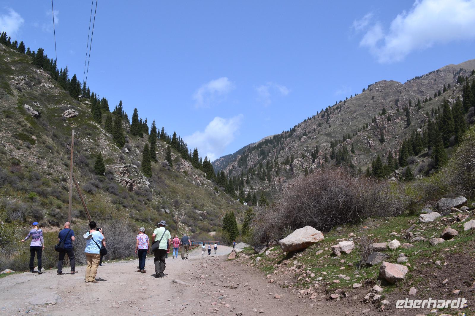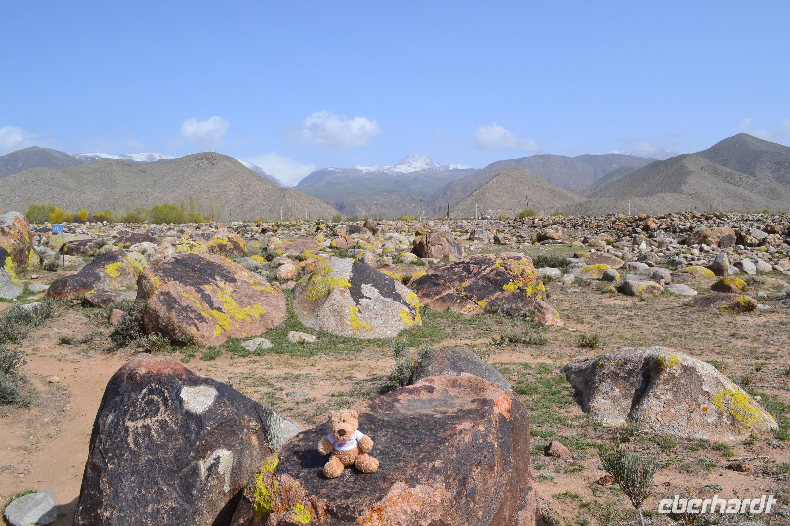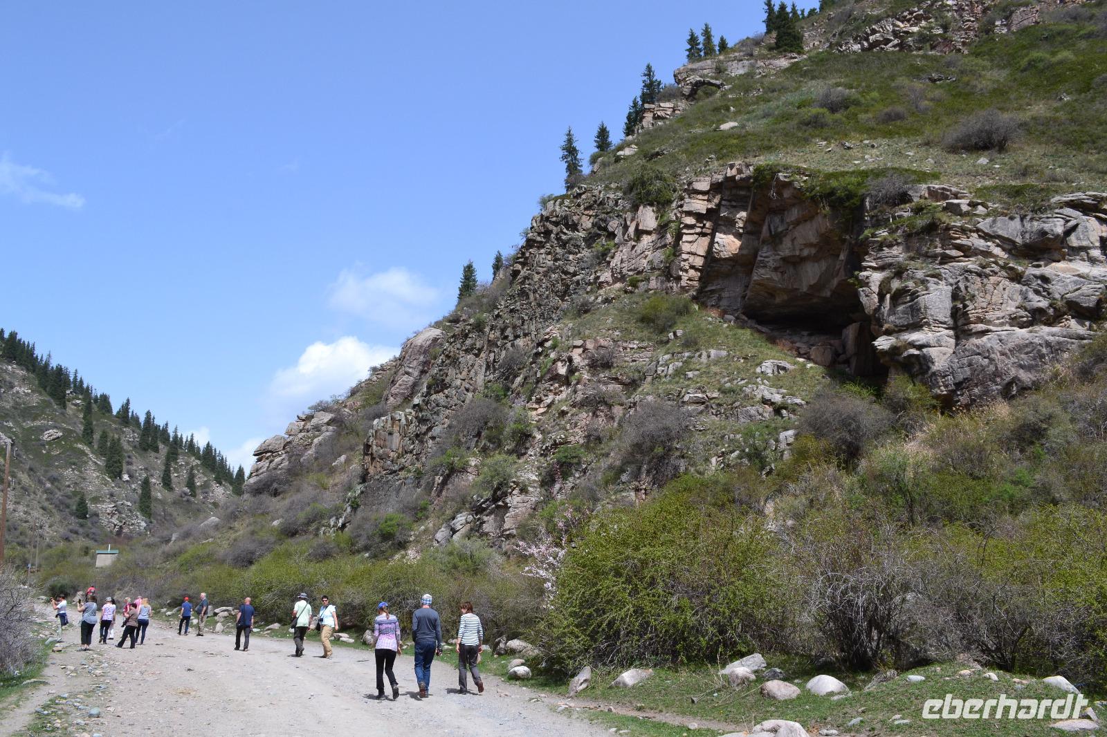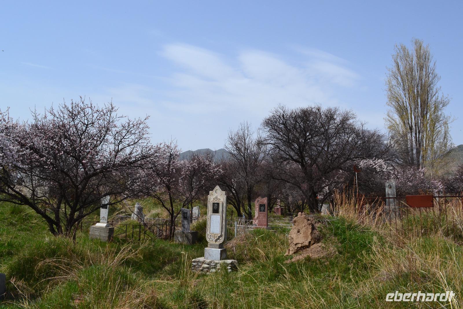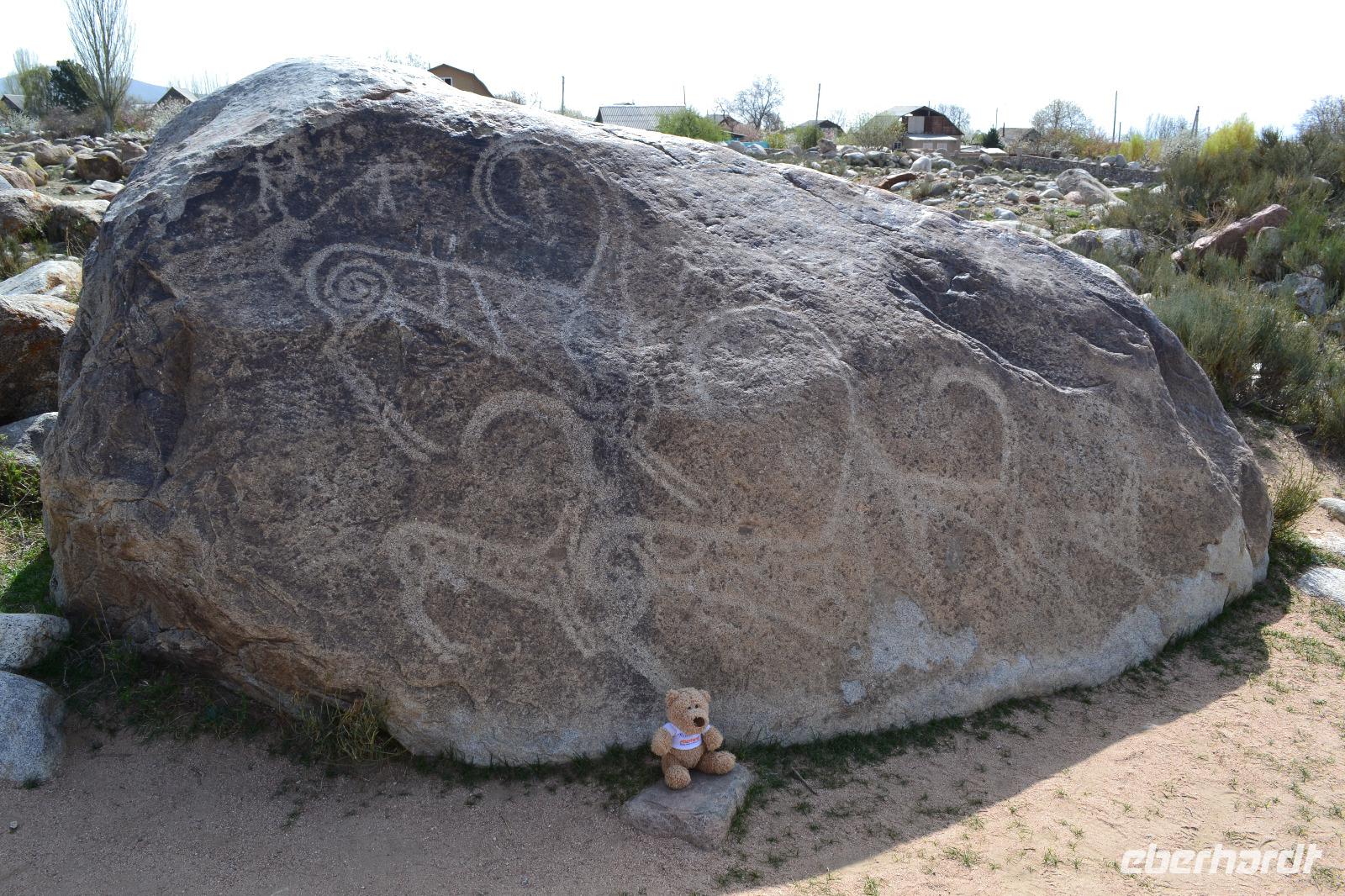 Heute haben wir keine lange Fahrt vor uns, denn wir wollen nur entlang des Nordufers des Issyk-Kul-Sees bis nach Karakol. Dafür stehen ein paar Besichtigungen und sogar eine Wanderung auf dem Programm. Ganz in der Nähe von Tscholponata befindet sich eine archäologische Stätte mit ungefähr 2.000 Petroglyphen. Sie stammen vor allem aus der Zeit der geheimnisvollen Skythen und stellen vornehmlich Jagdszenen dar. An einem kleinen Supermarkt kaufen wir dann Proviant für den Tag und unser Picknick und fahren dann ein Stück durch schöne Alleen mit blühenden Bäumen und kleine Dörfer bis zur Grigorjewskoe-Schlucht. Hier wandern wir ein kleines Stück in die Schlucht hinein und treffen auf Pferde, Reiter und Kuhhirten. Im Hochsommer leben hier auch für ein paar Monate Nomaden. Nach der Wanderung machen wir noch ein kleines Picknick mit Obst und Brot am Bus, bevor wir die Fahrt über den Schotterweg zurück zur Hauptroute am See antreten. Unser Bus passt übrigens gerade so unter dem Schlagbaum am Eingang der Schlucht hindurch! An einem typischen Friedhof machen wir anschließend einen kleinen Fotostopp. Lena erklärt uns, wie in Zentralasien der vorherrschende Islam mit Naturreligionen eine Verbindung eingegangen ist und daher eine ganz besondere Ausprägung hat. Kurz vor Karakol besichtigen wir das Przewalski-Museum, das dem berühmten Asienforscher gewidmet ist, der hier am 20. Oktober 1888 auf seiner fünften Reise verstorben ist. Die hübsche russische-orthodoxe Holzkirche in Karakol ist leider schon verschlossen, obwohl wir eigentlich noch innerhalb der offiziellen Öffnungszeiten eintreffen. Wahrscheinlich haben sie einfach nicht mehr mit Besuchern gerechnet. Wir beschließen, es am nächsten Tag noch einmal zu probieren. Immerhin können wir noch die hölzerne Dunganen-Moschee aus dem Jahr 1910 besichtigen, die von den aus China vertriebenen chinesisch-muslimischen Dunganen errichtet wurde, und vom Baustil daher eher an einen buddhistischen Tempel oder eine Pagode erinnert. In Karakol wohnen wir in einem kleinen familiengeführten Hotel, und zum Abendessen sind wir bei einer kirgisischen Familie in der Nähe eingeladen. Als wir die viel zu vielen Köstlichkeiten, die uns aufgetischt werden, verspeisen, fängt es draußen heftig zu regnen an. Zum Glück holen uns unsere beiden freundlichen Busfahrer mit dem Bus ab und bringen uns zum Hotel zurück.