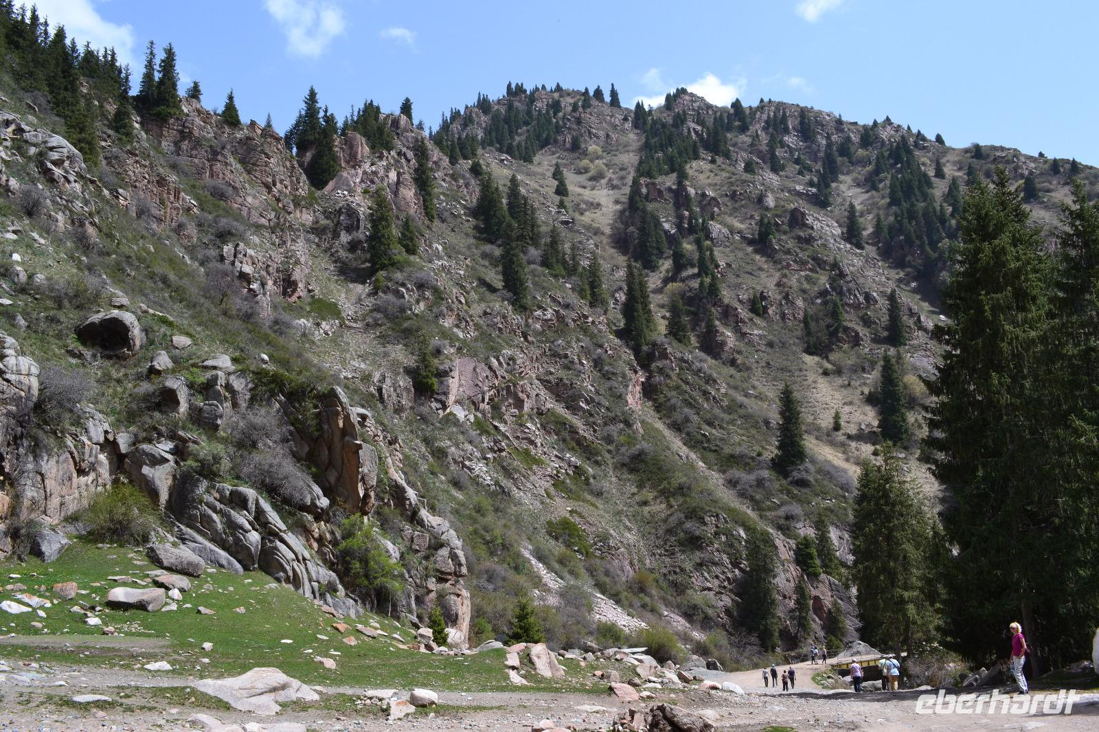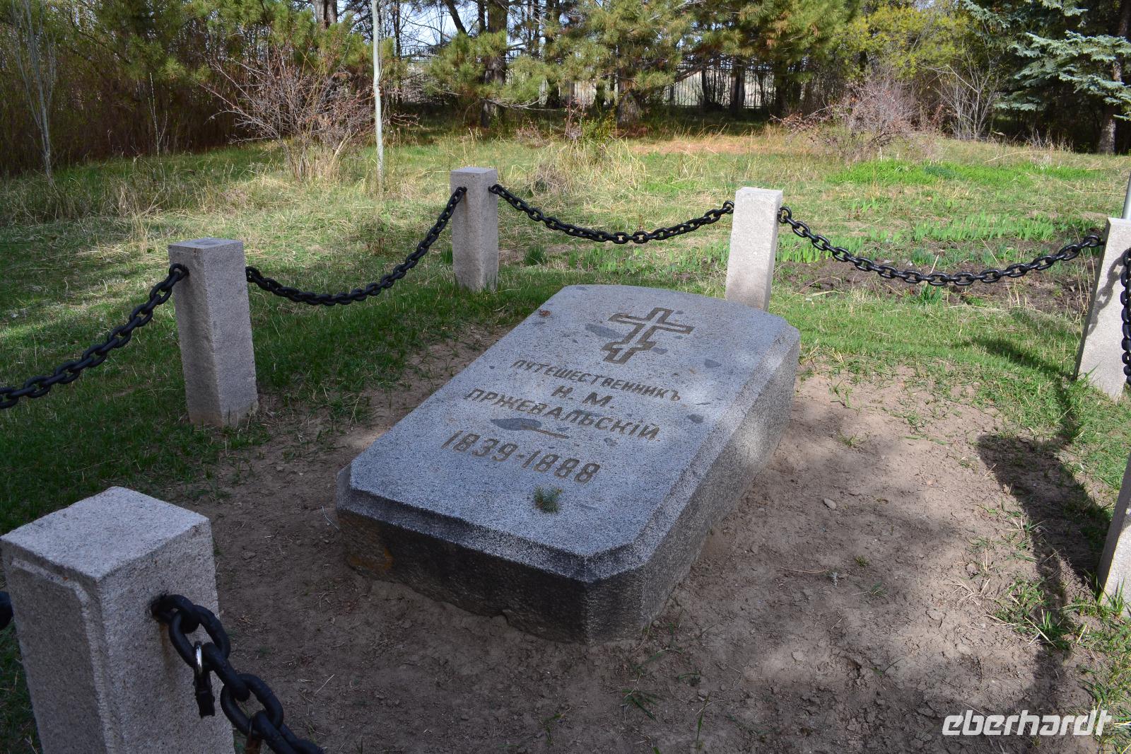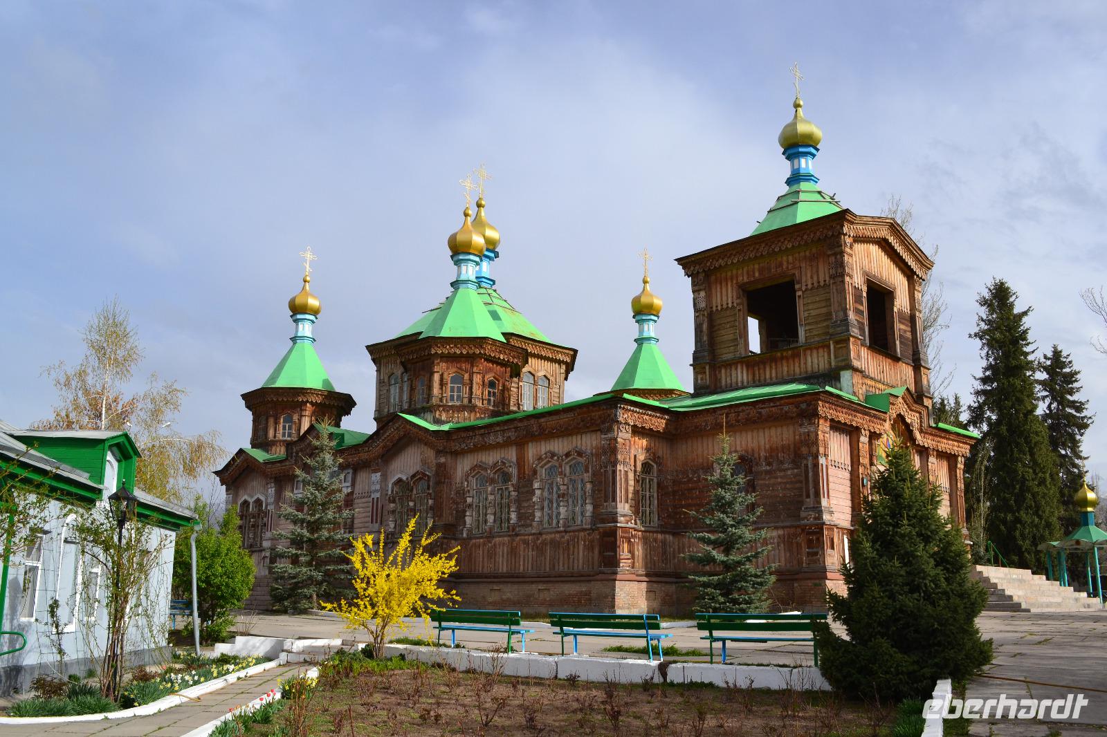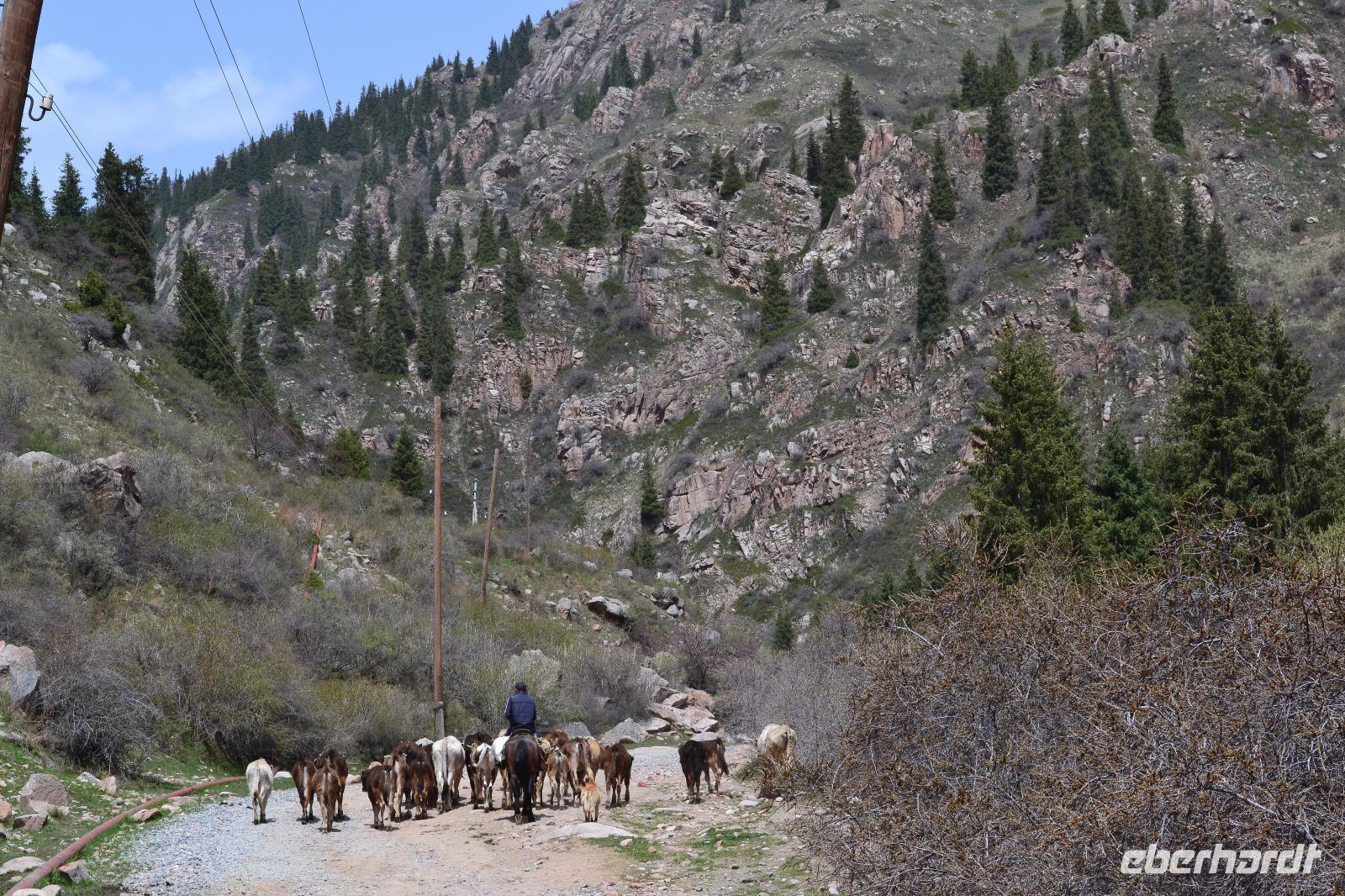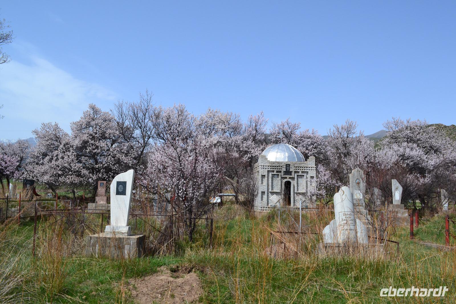 Heute haben wir keine lange Fahrt vor uns, denn wir wollen nur entlang des Nordufers des Issyk-Kul-Sees bis nach Karakol. Dafür stehen ein paar Besichtigungen und sogar eine Wanderung auf dem Programm. Ganz in der Nähe von Tscholponata befindet sich eine archäologische Stätte mit ungefähr 2.000 Petroglyphen. Sie stammen vor allem aus der Zeit der geheimnisvollen Skythen und stellen vornehmlich Jagdszenen dar. An einem kleinen Supermarkt kaufen wir dann Proviant für den Tag und unser Picknick und fahren dann ein Stück durch schöne Alleen mit blühenden Bäumen und kleine Dörfer bis zur Grigorjewskoe-Schlucht. Hier wandern wir ein kleines Stück in die Schlucht hinein und treffen auf Pferde, Reiter und Kuhhirten. Im Hochsommer leben hier auch für ein paar Monate Nomaden. Nach der Wanderung machen wir noch ein kleines Picknick mit Obst und Brot am Bus, bevor wir die Fahrt über den Schotterweg zurück zur Hauptroute am See antreten. Unser Bus passt übrigens gerade so unter dem Schlagbaum am Eingang der Schlucht hindurch! An einem typischen Friedhof machen wir anschließend einen kleinen Fotostopp. Lena erklärt uns, wie in Zentralasien der vorherrschende Islam mit Naturreligionen eine Verbindung eingegangen ist und daher eine ganz besondere Ausprägung hat. Kurz vor Karakol besichtigen wir das Przewalski-Museum, das dem berühmten Asienforscher gewidmet ist, der hier am 20. Oktober 1888 auf seiner fünften Reise verstorben ist. Die hübsche russische-orthodoxe Holzkirche in Karakol ist leider schon verschlossen, obwohl wir eigentlich noch innerhalb der offiziellen Öffnungszeiten eintreffen. Wahrscheinlich haben sie einfach nicht mehr mit Besuchern gerechnet. Wir beschließen, es am nächsten Tag noch einmal zu probieren. Immerhin können wir noch die hölzerne Dunganen-Moschee aus dem Jahr 1910 besichtigen, die von den aus China vertriebenen chinesisch-muslimischen Dunganen errichtet wurde, und vom Baustil daher eher an einen buddhistischen Tempel oder eine Pagode erinnert. In Karakol wohnen wir in einem kleinen familiengeführten Hotel, und zum Abendessen sind wir bei einer kirgisischen Familie in der Nähe eingeladen. Als wir die viel zu vielen Köstlichkeiten, die uns aufgetischt werden, verspeisen, fängt es draußen heftig zu regnen an. Zum Glück holen uns unsere beiden freundlichen Busfahrer mit dem Bus ab und bringen uns zum Hotel zurück.