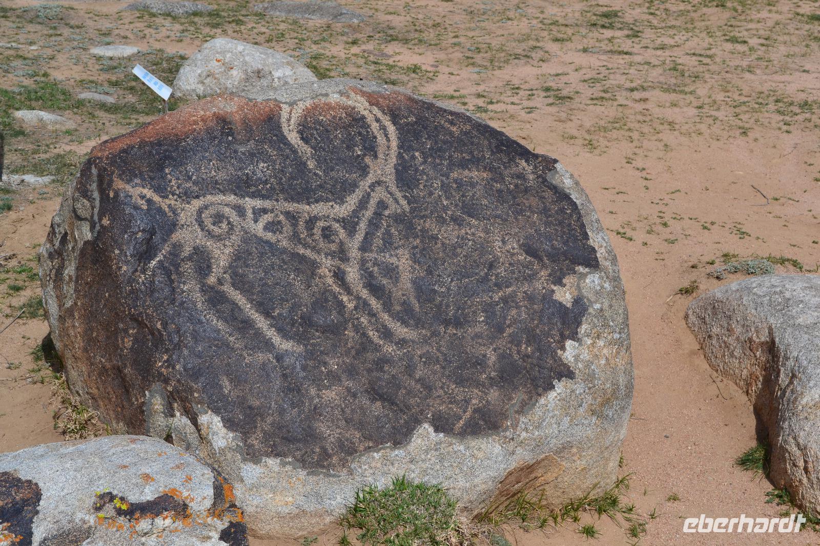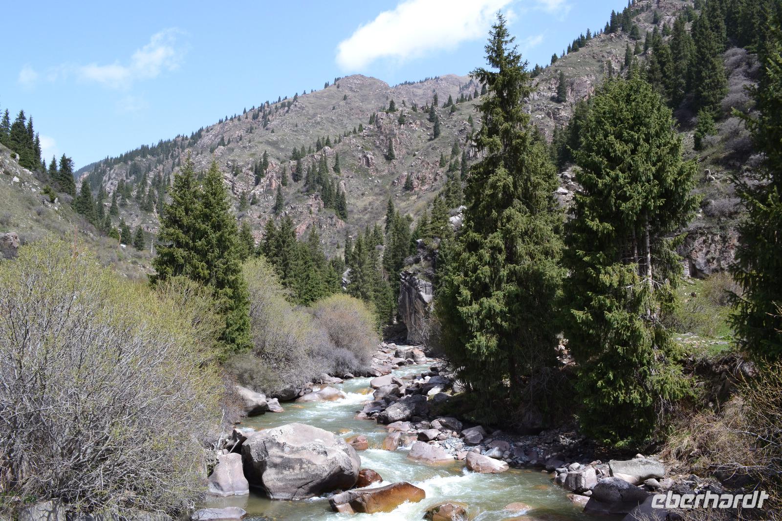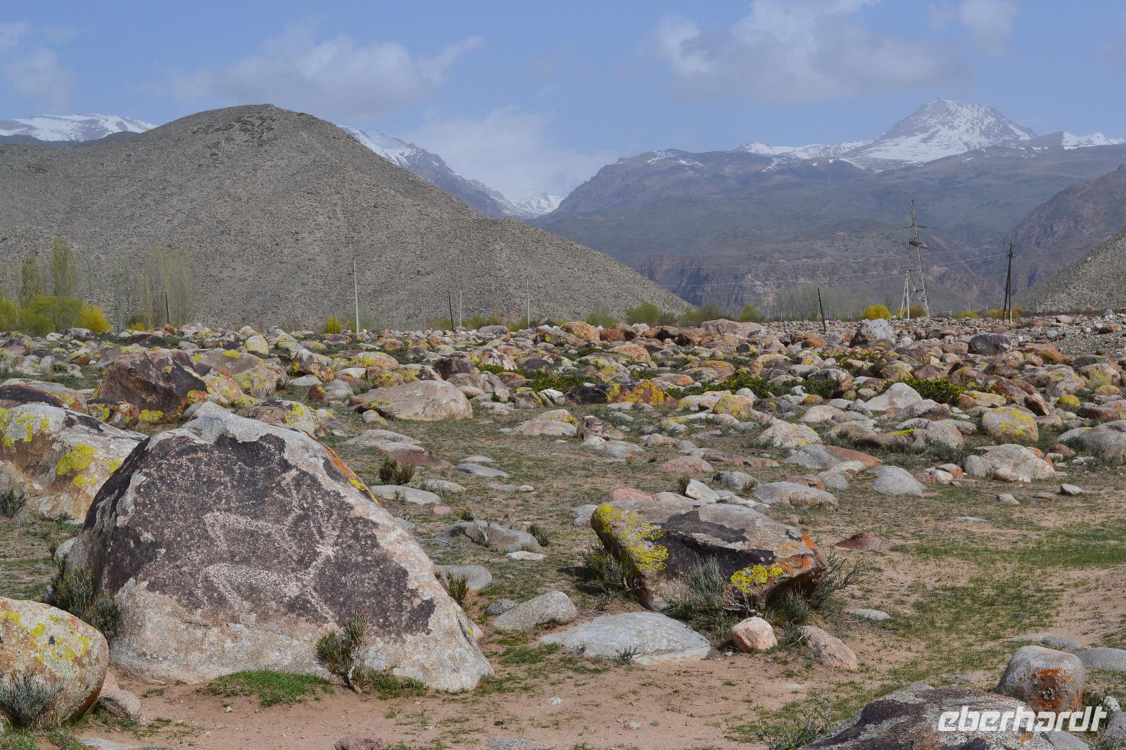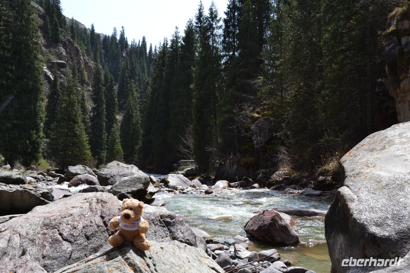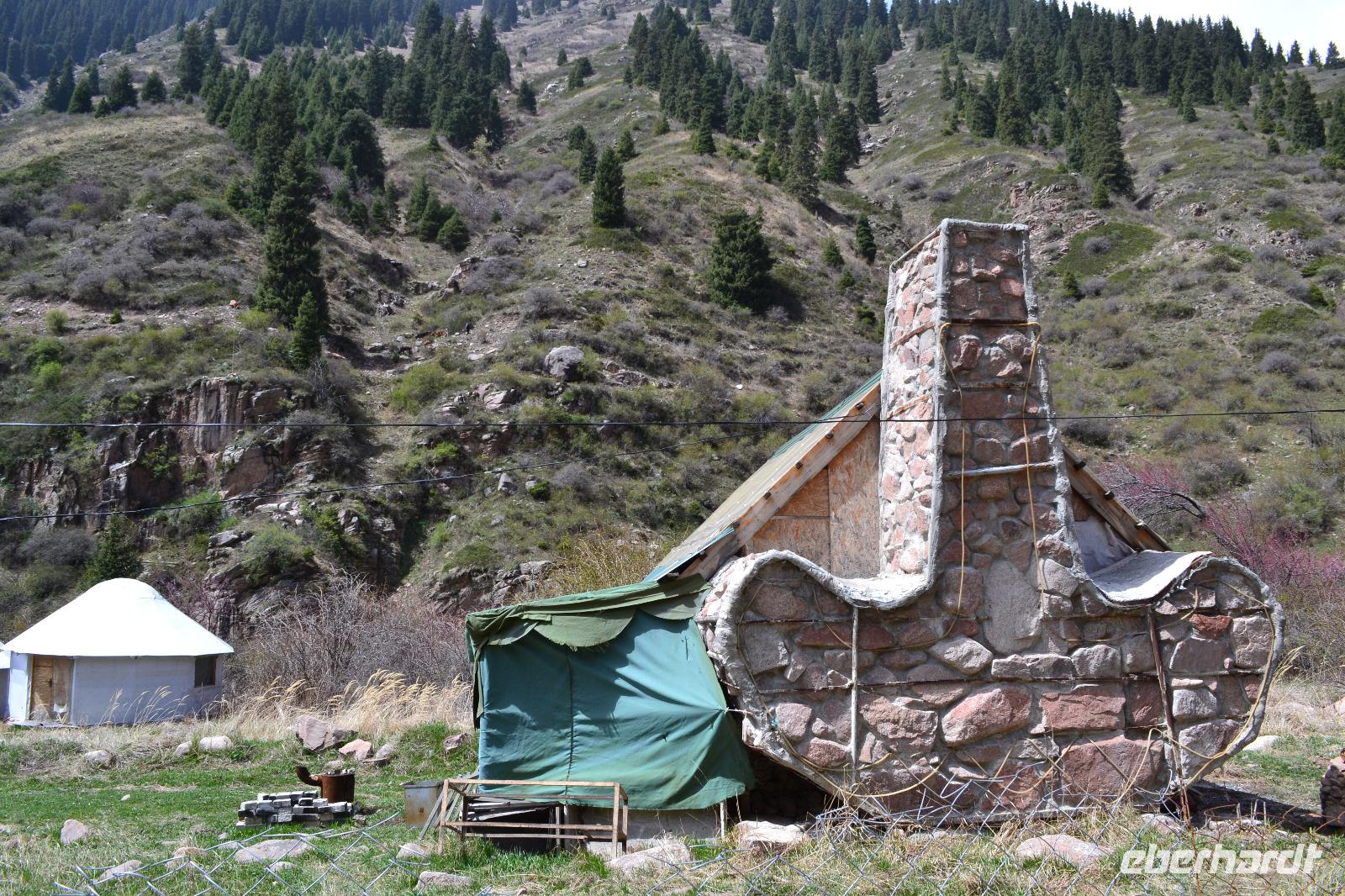 Heute haben wir keine lange Fahrt vor uns, denn wir wollen nur entlang des Nordufers des Issyk-Kul-Sees bis nach Karakol. Dafür stehen ein paar Besichtigungen und sogar eine Wanderung auf dem Programm. Ganz in der Nähe von Tscholponata befindet sich eine archäologische Stätte mit ungefähr 2.000 Petroglyphen. Sie stammen vor allem aus der Zeit der geheimnisvollen Skythen und stellen vornehmlich Jagdszenen dar. An einem kleinen Supermarkt kaufen wir dann Proviant für den Tag und unser Picknick und fahren dann ein Stück durch schöne Alleen mit blühenden Bäumen und kleine Dörfer bis zur Grigorjewskoe-Schlucht. Hier wandern wir ein kleines Stück in die Schlucht hinein und treffen auf Pferde, Reiter und Kuhhirten. Im Hochsommer leben hier auch für ein paar Monate Nomaden. Nach der Wanderung machen wir noch ein kleines Picknick mit Obst und Brot am Bus, bevor wir die Fahrt über den Schotterweg zurück zur Hauptroute am See antreten. Unser Bus passt übrigens gerade so unter dem Schlagbaum am Eingang der Schlucht hindurch! An einem typischen Friedhof machen wir anschließend einen kleinen Fotostopp. Lena erklärt uns, wie in Zentralasien der vorherrschende Islam mit Naturreligionen eine Verbindung eingegangen ist und daher eine ganz besondere Ausprägung hat. Kurz vor Karakol besichtigen wir das Przewalski-Museum, das dem berühmten Asienforscher gewidmet ist, der hier am 20. Oktober 1888 auf seiner fünften Reise verstorben ist. Die hübsche russische-orthodoxe Holzkirche in Karakol ist leider schon verschlossen, obwohl wir eigentlich noch innerhalb der offiziellen Öffnungszeiten eintreffen. Wahrscheinlich haben sie einfach nicht mehr mit Besuchern gerechnet. Wir beschließen, es am nächsten Tag noch einmal zu probieren. Immerhin können wir noch die hölzerne Dunganen-Moschee aus dem Jahr 1910 besichtigen, die von den aus China vertriebenen chinesisch-muslimischen Dunganen errichtet wurde, und vom Baustil daher eher an einen buddhistischen Tempel oder eine Pagode erinnert. In Karakol wohnen wir in einem kleinen familiengeführten Hotel, und zum Abendessen sind wir bei einer kirgisischen Familie in der Nähe eingeladen. Als wir die viel zu vielen Köstlichkeiten, die uns aufgetischt werden, verspeisen, fängt es draußen heftig zu regnen an. Zum Glück holen uns unsere beiden freundlichen Busfahrer mit dem Bus ab und bringen uns zum Hotel zurück.
