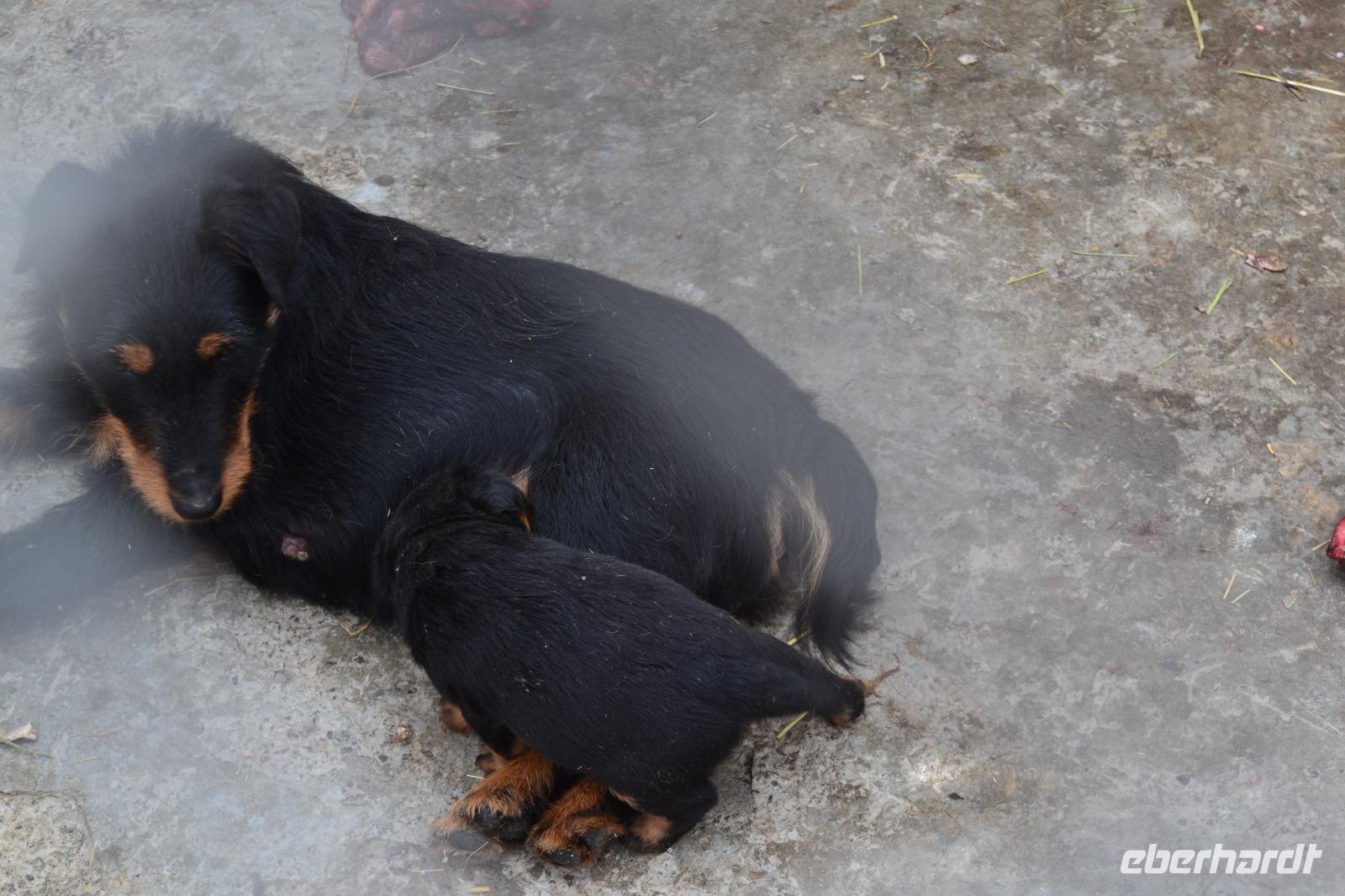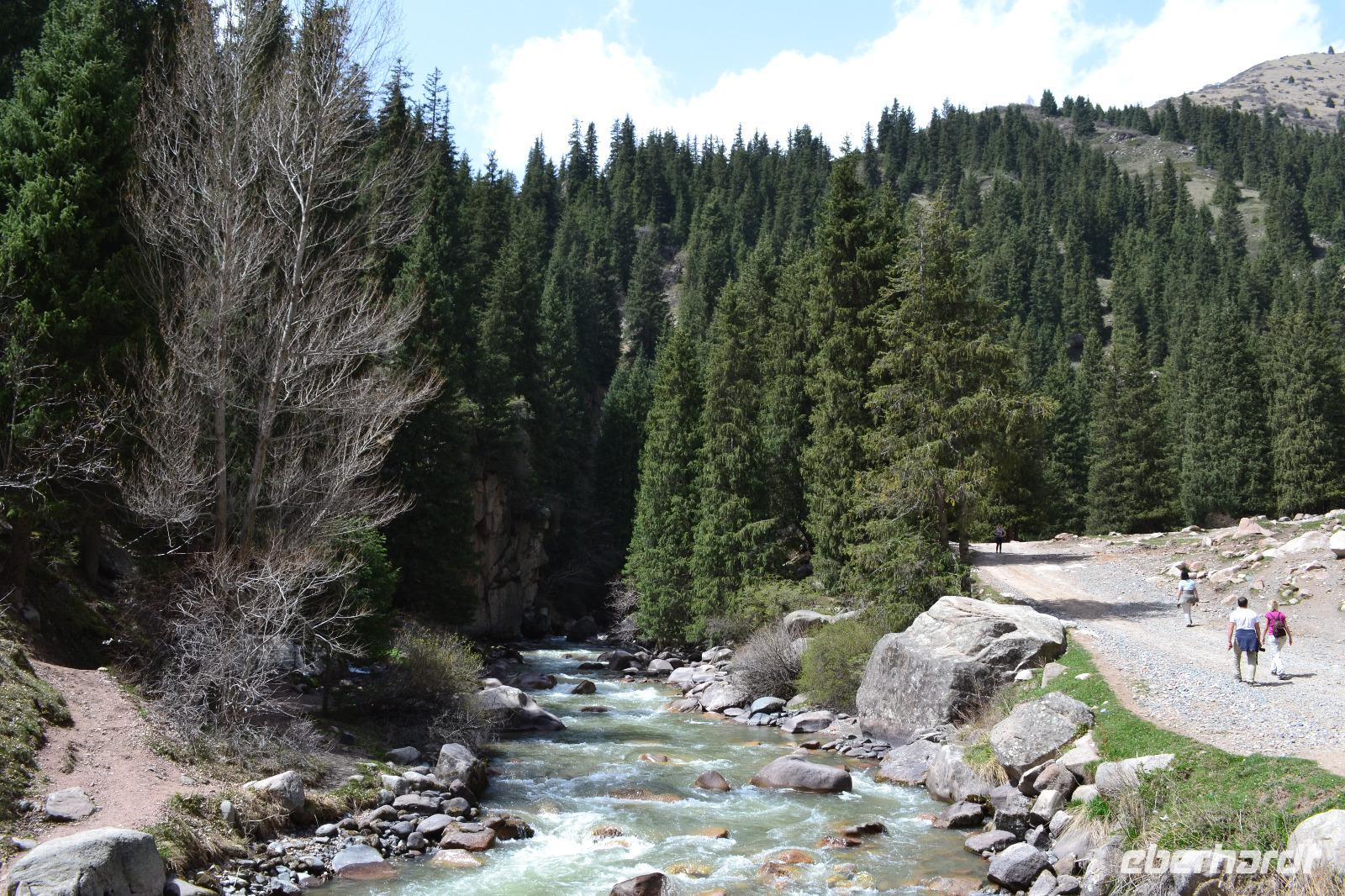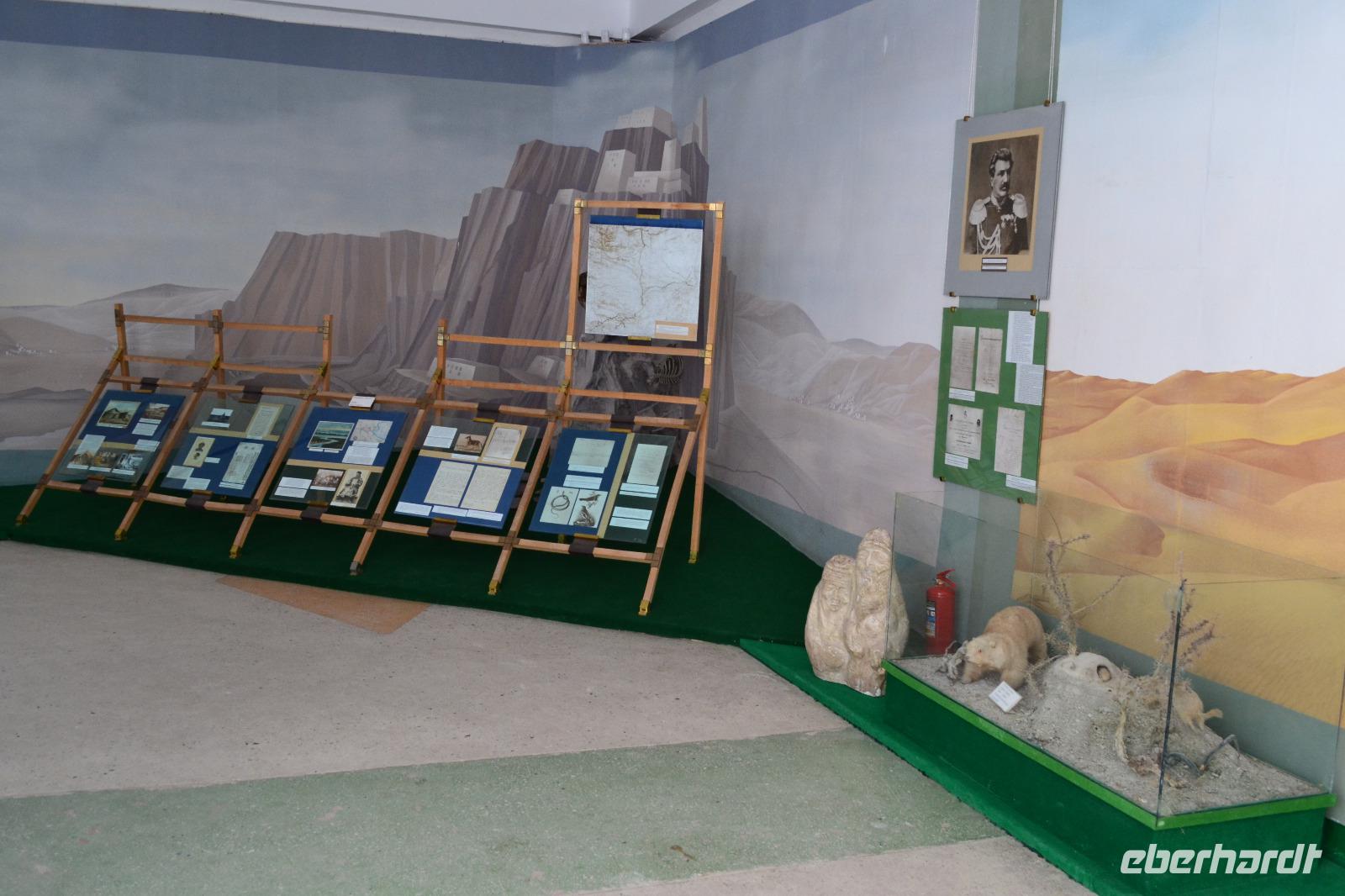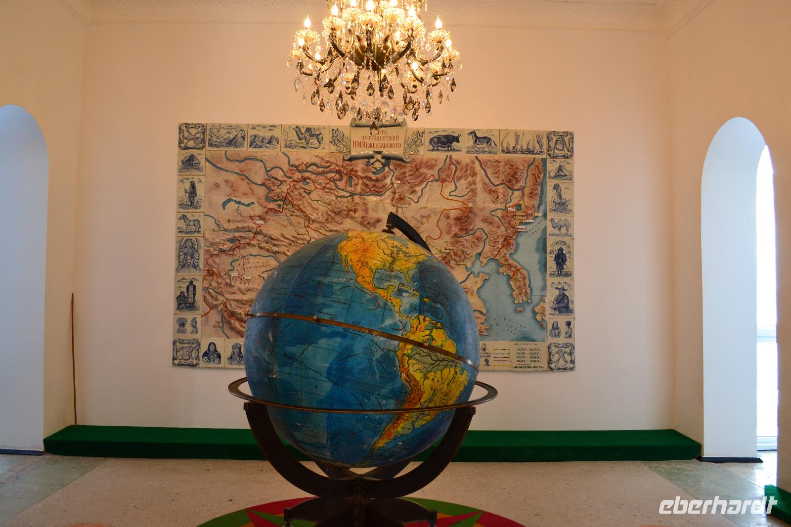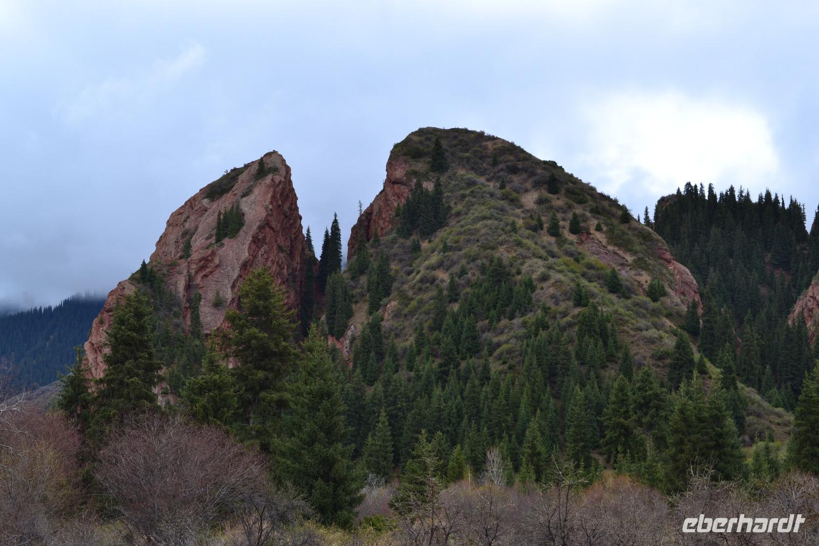 Heute haben wir keine lange Fahrt vor uns, denn wir wollen nur entlang des Nordufers des Issyk-Kul-Sees bis nach Karakol. Dafür stehen ein paar Besichtigungen und sogar eine Wanderung auf dem Programm. Ganz in der Nähe von Tscholponata befindet sich eine archäologische Stätte mit ungefähr 2.000 Petroglyphen. Sie stammen vor allem aus der Zeit der geheimnisvollen Skythen und stellen vornehmlich Jagdszenen dar. An einem kleinen Supermarkt kaufen wir dann Proviant für den Tag und unser Picknick und fahren dann ein Stück durch schöne Alleen mit blühenden Bäumen und kleine Dörfer bis zur Grigorjewskoe-Schlucht. Hier wandern wir ein kleines Stück in die Schlucht hinein und treffen auf Pferde, Reiter und Kuhhirten. Im Hochsommer leben hier auch für ein paar Monate Nomaden. Nach der Wanderung machen wir noch ein kleines Picknick mit Obst und Brot am Bus, bevor wir die Fahrt über den Schotterweg zurück zur Hauptroute am See antreten. Unser Bus passt übrigens gerade so unter dem Schlagbaum am Eingang der Schlucht hindurch! An einem typischen Friedhof machen wir anschließend einen kleinen Fotostopp. Lena erklärt uns, wie in Zentralasien der vorherrschende Islam mit Naturreligionen eine Verbindung eingegangen ist und daher eine ganz besondere Ausprägung hat. Kurz vor Karakol besichtigen wir das Przewalski-Museum, das dem berühmten Asienforscher gewidmet ist, der hier am 20. Oktober 1888 auf seiner fünften Reise verstorben ist. Die hübsche russische-orthodoxe Holzkirche in Karakol ist leider schon verschlossen, obwohl wir eigentlich noch innerhalb der offiziellen Öffnungszeiten eintreffen. Wahrscheinlich haben sie einfach nicht mehr mit Besuchern gerechnet. Wir beschließen, es am nächsten Tag noch einmal zu probieren. Immerhin können wir noch die hölzerne Dunganen-Moschee aus dem Jahr 1910 besichtigen, die von den aus China vertriebenen chinesisch-muslimischen Dunganen errichtet wurde, und vom Baustil daher eher an einen buddhistischen Tempel oder eine Pagode erinnert. In Karakol wohnen wir in einem kleinen familiengeführten Hotel, und zum Abendessen sind wir bei einer kirgisischen Familie in der Nähe eingeladen. Als wir die viel zu vielen Köstlichkeiten, die uns aufgetischt werden, verspeisen, fängt es draußen heftig zu regnen an. Zum Glück holen uns unsere beiden freundlichen Busfahrer mit dem Bus ab und bringen uns zum Hotel zurück.
