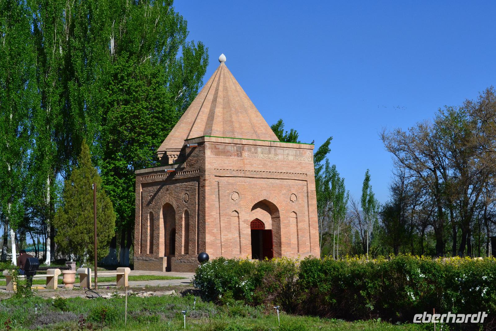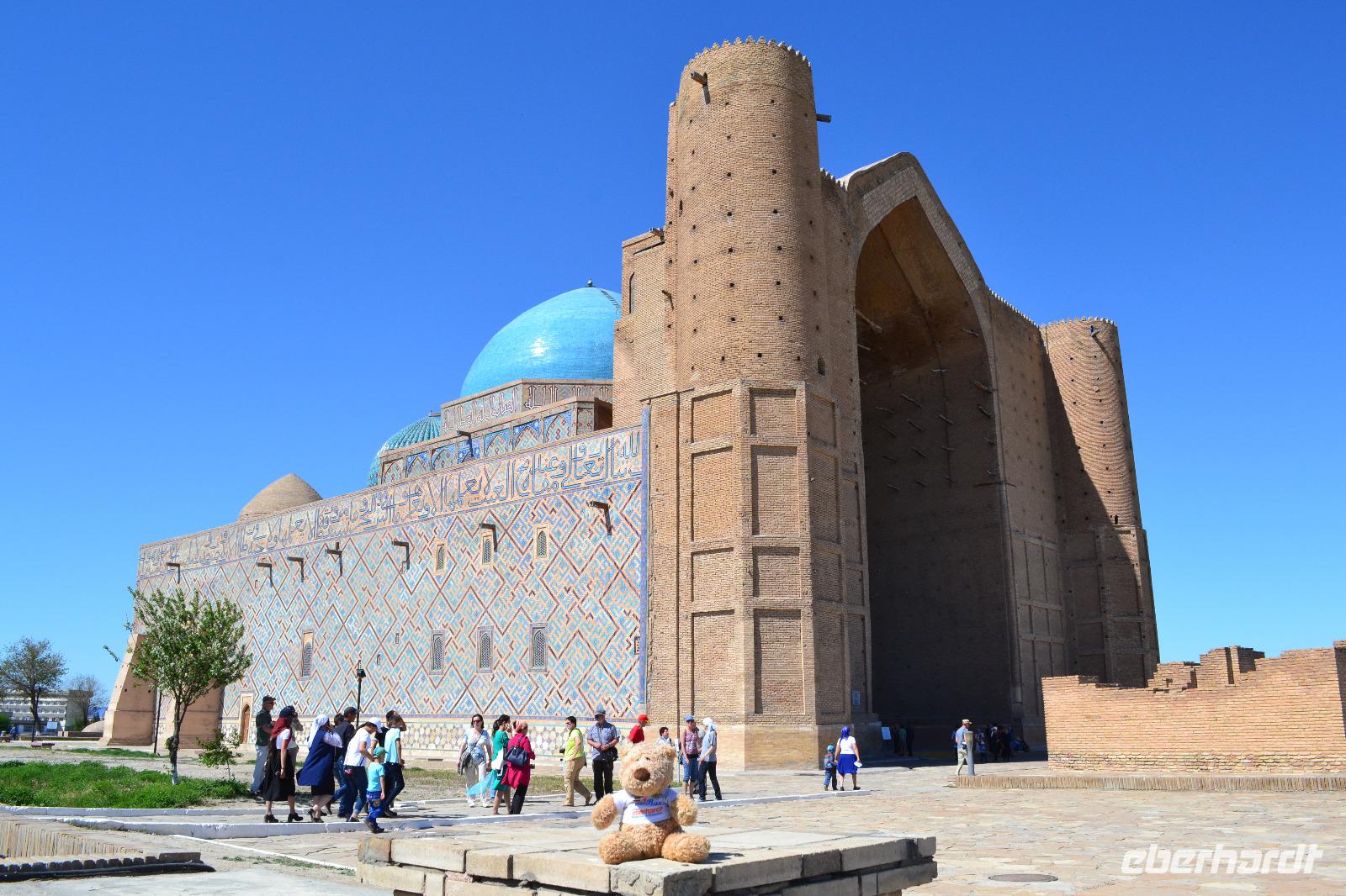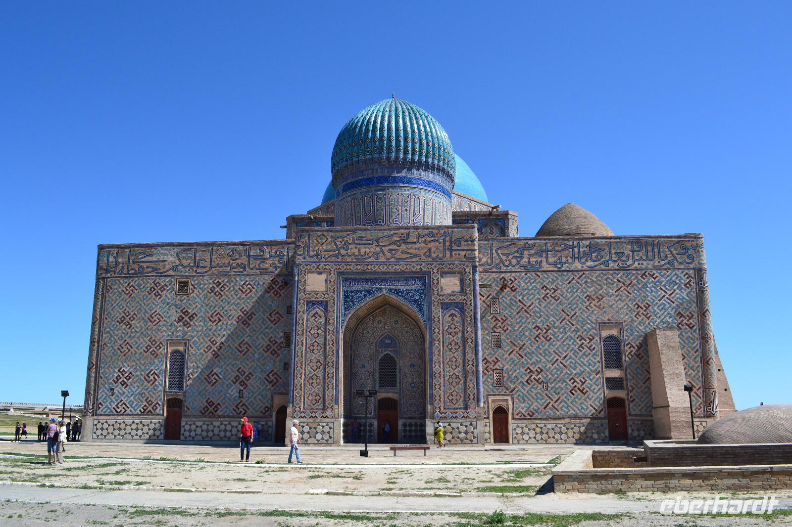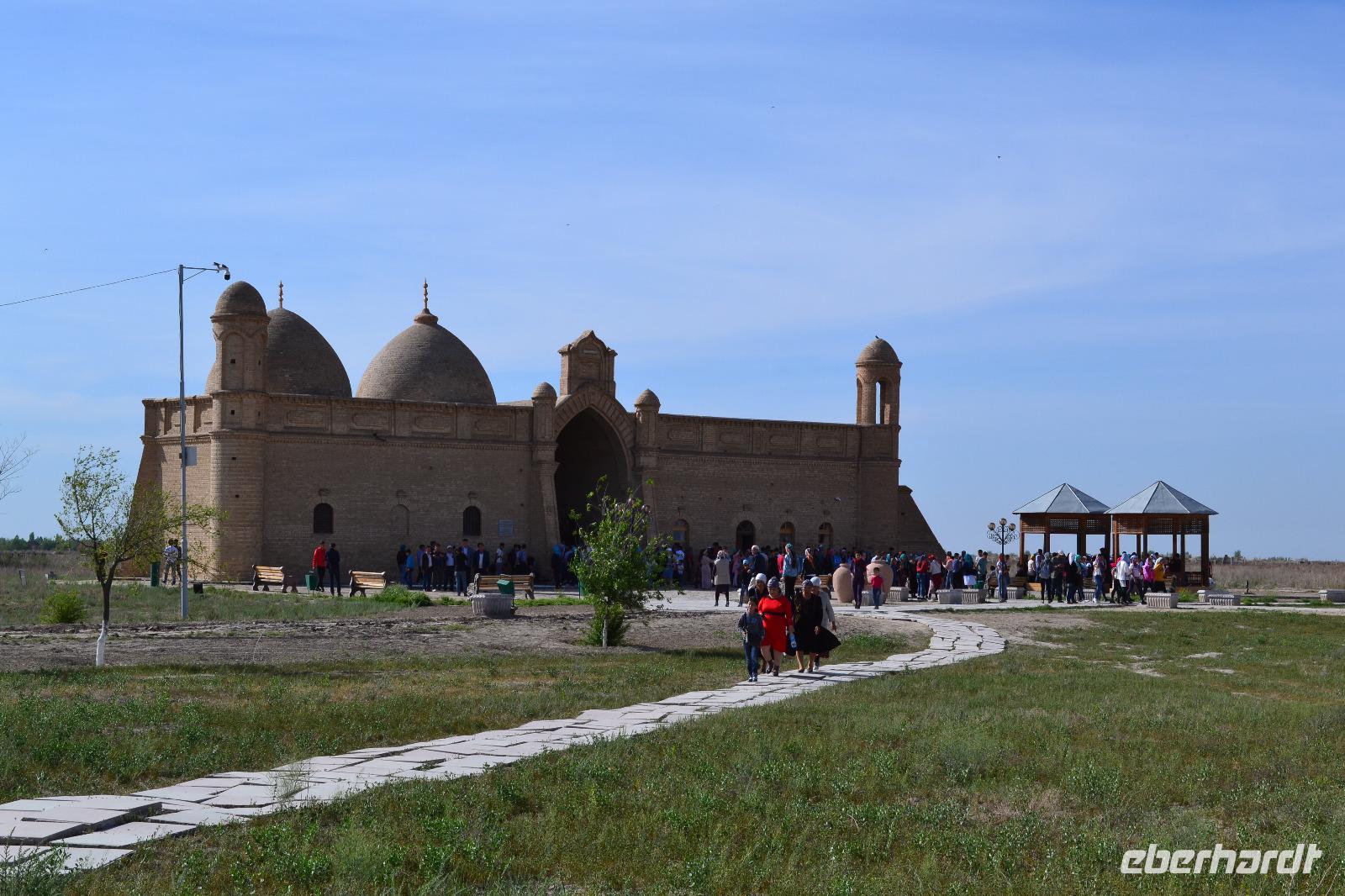 Schon Taras stand bisher auf keiner Eberhardt-Reise auf dem Programm, und auch unser heutiges Ziel Turkestan ist sozusagen „Neuland". Unterwegs legen wir aber erstmal einen Stopp an den Mausoleen Aischa-Bibi und Babadschi-Hatun ein, die wie der Turm in Burana aus der Zeit der Karachaniden stammen. In ihnen sind die Tochter eines Statthalters, Aischa-Bibi, und eine adlige Frau, Babadschi-Hatun, bestattet. Der Legende nach starb Aischa-Bibi am Ufer des Flusses Talas, als sie auf dem Weg zu ihrem Verlobten von einer Schlange gebissen wurde. Tief erschüttert ließ er diesen wunderschöne kleine Museum für sie errichten, das mit Terrakotta-Fliesen und verschiedenen Mustern verziert ist. Die alte Karawanenstadt Turkestan war vor 1.500 Jahren ein großes religiöses und kulturelles Zentrum. Das gewaltige Mausoleum des bekannten Sufisten und Dichters Ahmed Jassewi überragt dabei alle anderen Gebäude. Das imposante Bauwerk mit den leuchtenden blauen Kuppeln, raffinierten Schnitzereien und prächtigen Majolika-Mosaiken wurde Ende des 14. Jahrhunderts auf Befehl von Timur errichtet, nachdem das vorherige, viel bescheidenere Grab bereits zu einem wichtigen Pilgerort geworden war. Man sagt auch heute noch, dass drei Pilgerreisen nach Turkestan äquivalent zur Haddsch nach Mekka seien. In unmittelbarer Nachbarschaft finden sich noch weitere interessante Gebäude, die wir mit Lena erkunden: die Juma-Moschee, die unterirdische Moschee Hilowat, ein mittelalterliches Badehaus und das Esumhan-Mausoleum sowie das Mausoleum Rabija Sultan Begim. Angesichts der Außentemperaturen ist die unterirdische Moschee der Derwische natürlich eine ganz besonders clevere Erfindung. Unser Hotel in Turkestan liegt in Sichtweite des großen Mausoleums, sodass wir am Abend auch auf eigene Faust noch einmal hinüber schlendern können.