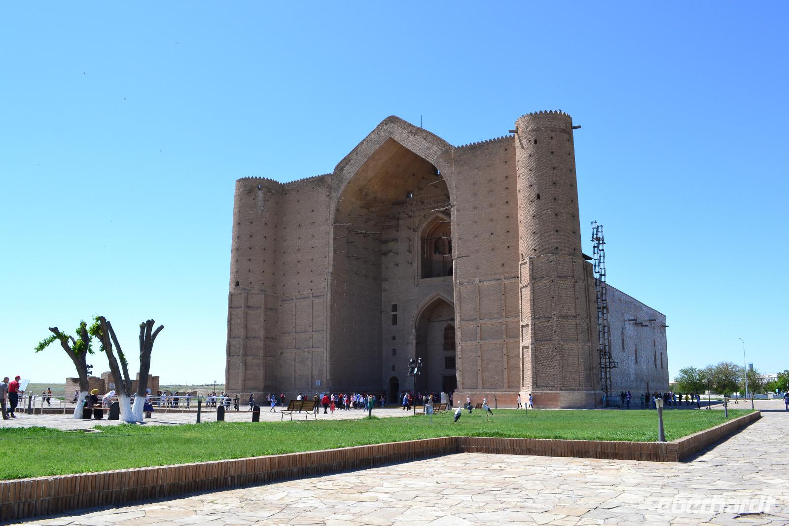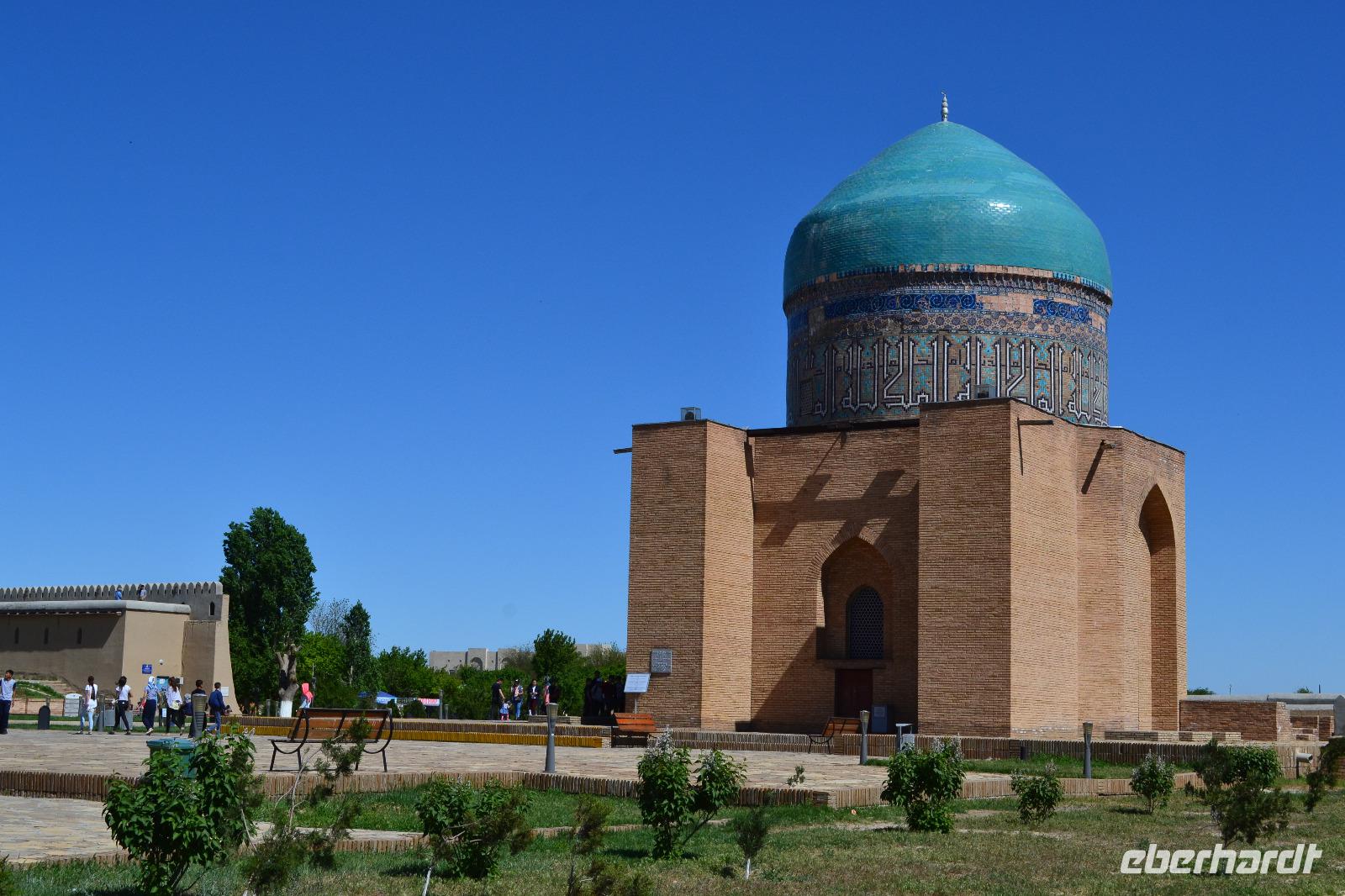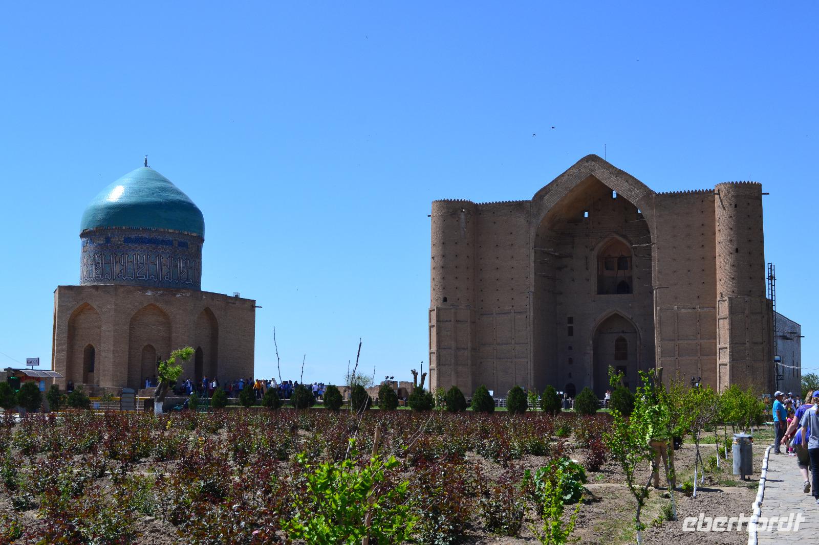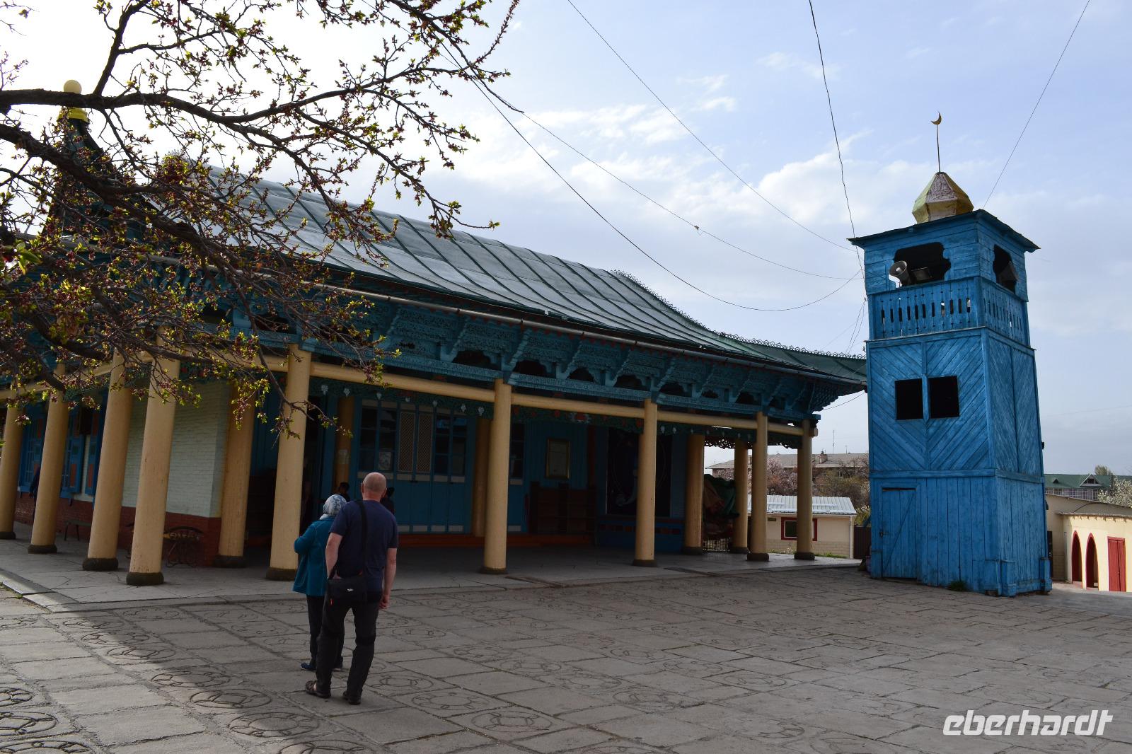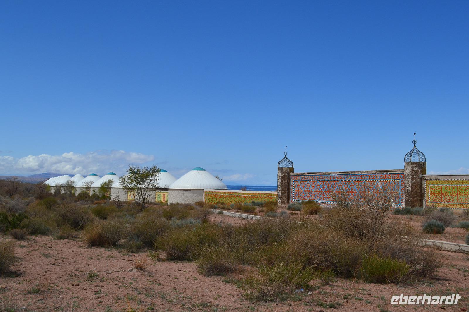 Schon Taras stand bisher auf keiner Eberhardt-Reise auf dem Programm, und auch unser heutiges Ziel Turkestan ist sozusagen „Neuland". Unterwegs legen wir aber erstmal einen Stopp an den Mausoleen Aischa-Bibi und Babadschi-Hatun ein, die wie der Turm in Burana aus der Zeit der Karachaniden stammen. In ihnen sind die Tochter eines Statthalters, Aischa-Bibi, und eine adlige Frau, Babadschi-Hatun, bestattet. Der Legende nach starb Aischa-Bibi am Ufer des Flusses Talas, als sie auf dem Weg zu ihrem Verlobten von einer Schlange gebissen wurde. Tief erschüttert ließ er diesen wunderschöne kleine Museum für sie errichten, das mit Terrakotta-Fliesen und verschiedenen Mustern verziert ist. Die alte Karawanenstadt Turkestan war vor 1.500 Jahren ein großes religiöses und kulturelles Zentrum. Das gewaltige Mausoleum des bekannten Sufisten und Dichters Ahmed Jassewi überragt dabei alle anderen Gebäude. Das imposante Bauwerk mit den leuchtenden blauen Kuppeln, raffinierten Schnitzereien und prächtigen Majolika-Mosaiken wurde Ende des 14. Jahrhunderts auf Befehl von Timur errichtet, nachdem das vorherige, viel bescheidenere Grab bereits zu einem wichtigen Pilgerort geworden war. Man sagt auch heute noch, dass drei Pilgerreisen nach Turkestan äquivalent zur Haddsch nach Mekka seien. In unmittelbarer Nachbarschaft finden sich noch weitere interessante Gebäude, die wir mit Lena erkunden: die Juma-Moschee, die unterirdische Moschee Hilowat, ein mittelalterliches Badehaus und das Esumhan-Mausoleum sowie das Mausoleum Rabija Sultan Begim. Angesichts der Außentemperaturen ist die unterirdische Moschee der Derwische natürlich eine ganz besonders clevere Erfindung. Unser Hotel in Turkestan liegt in Sichtweite des großen Mausoleums, sodass wir am Abend auch auf eigene Faust noch einmal hinüber schlendern können.