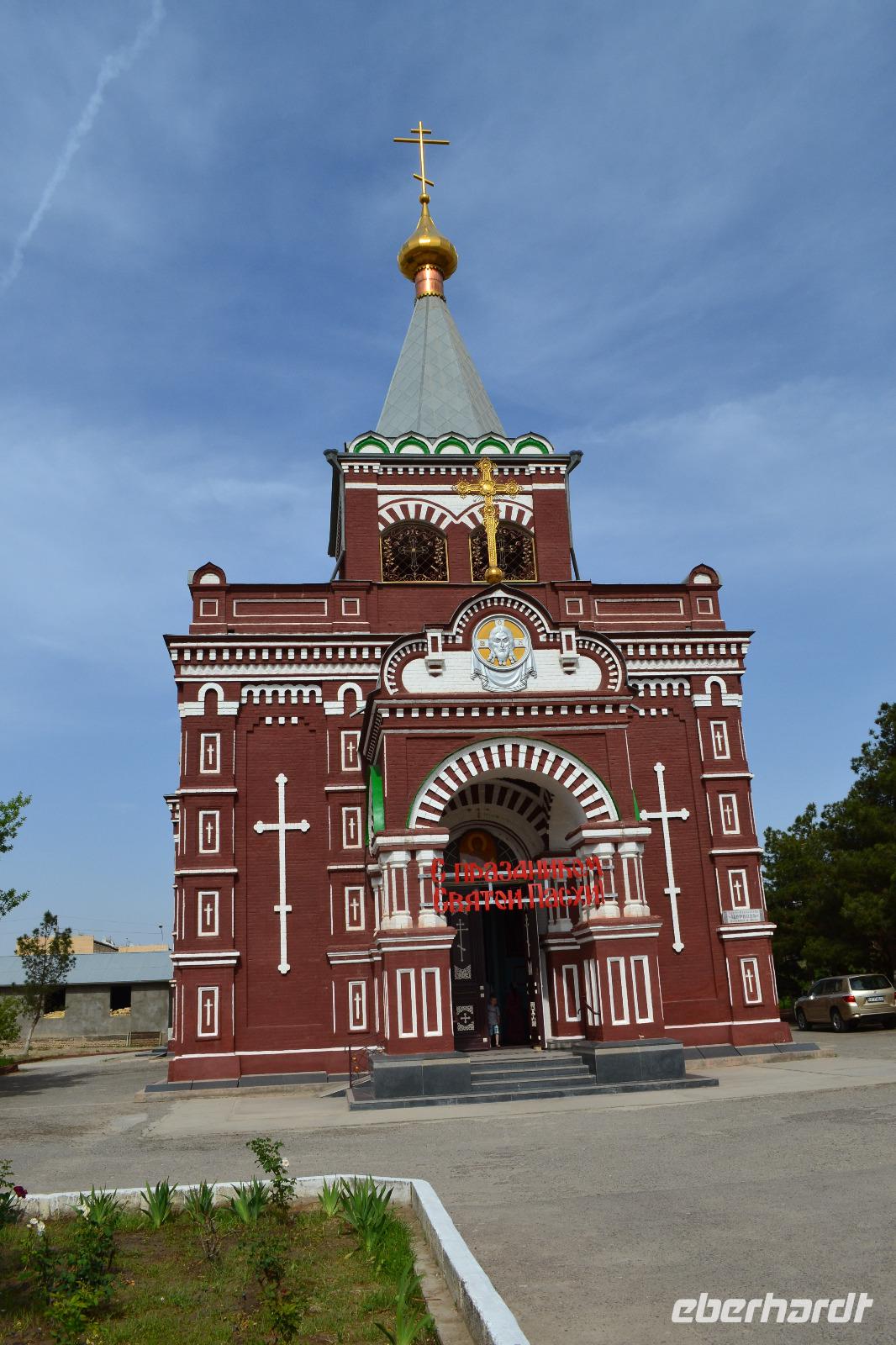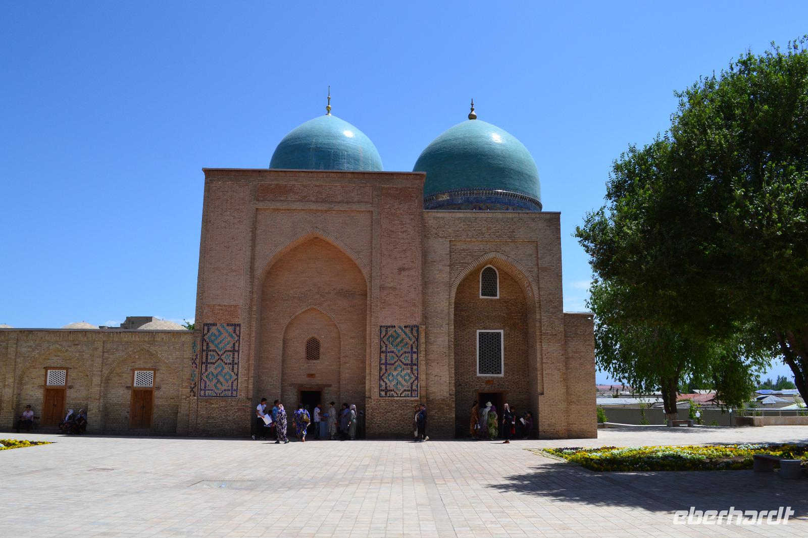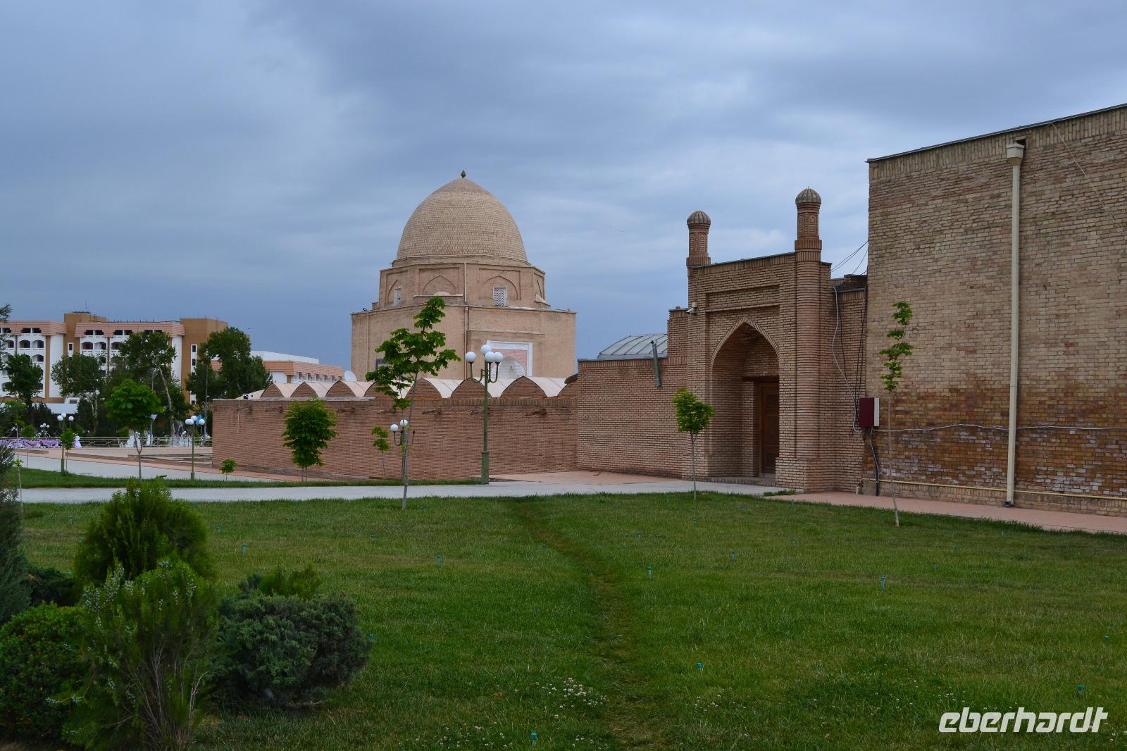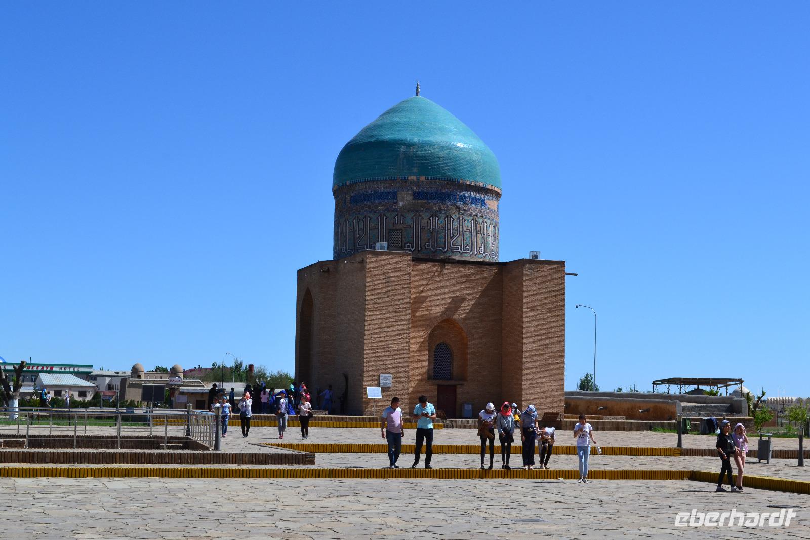 Schon Taras stand bisher auf keiner Eberhardt-Reise auf dem Programm, und auch unser heutiges Ziel Turkestan ist sozusagen „Neuland". Unterwegs legen wir aber erstmal einen Stopp an den Mausoleen Aischa-Bibi und Babadschi-Hatun ein, die wie der Turm in Burana aus der Zeit der Karachaniden stammen. In ihnen sind die Tochter eines Statthalters, Aischa-Bibi, und eine adlige Frau, Babadschi-Hatun, bestattet. Der Legende nach starb Aischa-Bibi am Ufer des Flusses Talas, als sie auf dem Weg zu ihrem Verlobten von einer Schlange gebissen wurde. Tief erschüttert ließ er diesen wunderschöne kleine Museum für sie errichten, das mit Terrakotta-Fliesen und verschiedenen Mustern verziert ist. Die alte Karawanenstadt Turkestan war vor 1.500 Jahren ein großes religiöses und kulturelles Zentrum. Das gewaltige Mausoleum des bekannten Sufisten und Dichters Ahmed Jassewi überragt dabei alle anderen Gebäude. Das imposante Bauwerk mit den leuchtenden blauen Kuppeln, raffinierten Schnitzereien und prächtigen Majolika-Mosaiken wurde Ende des 14. Jahrhunderts auf Befehl von Timur errichtet, nachdem das vorherige, viel bescheidenere Grab bereits zu einem wichtigen Pilgerort geworden war. Man sagt auch heute noch, dass drei Pilgerreisen nach Turkestan äquivalent zur Haddsch nach Mekka seien. In unmittelbarer Nachbarschaft finden sich noch weitere interessante Gebäude, die wir mit Lena erkunden: die Juma-Moschee, die unterirdische Moschee Hilowat, ein mittelalterliches Badehaus und das Esumhan-Mausoleum sowie das Mausoleum Rabija Sultan Begim. Angesichts der Außentemperaturen ist die unterirdische Moschee der Derwische natürlich eine ganz besonders clevere Erfindung. Unser Hotel in Turkestan liegt in Sichtweite des großen Mausoleums, sodass wir am Abend auch auf eigene Faust noch einmal hinüber schlendern können.
