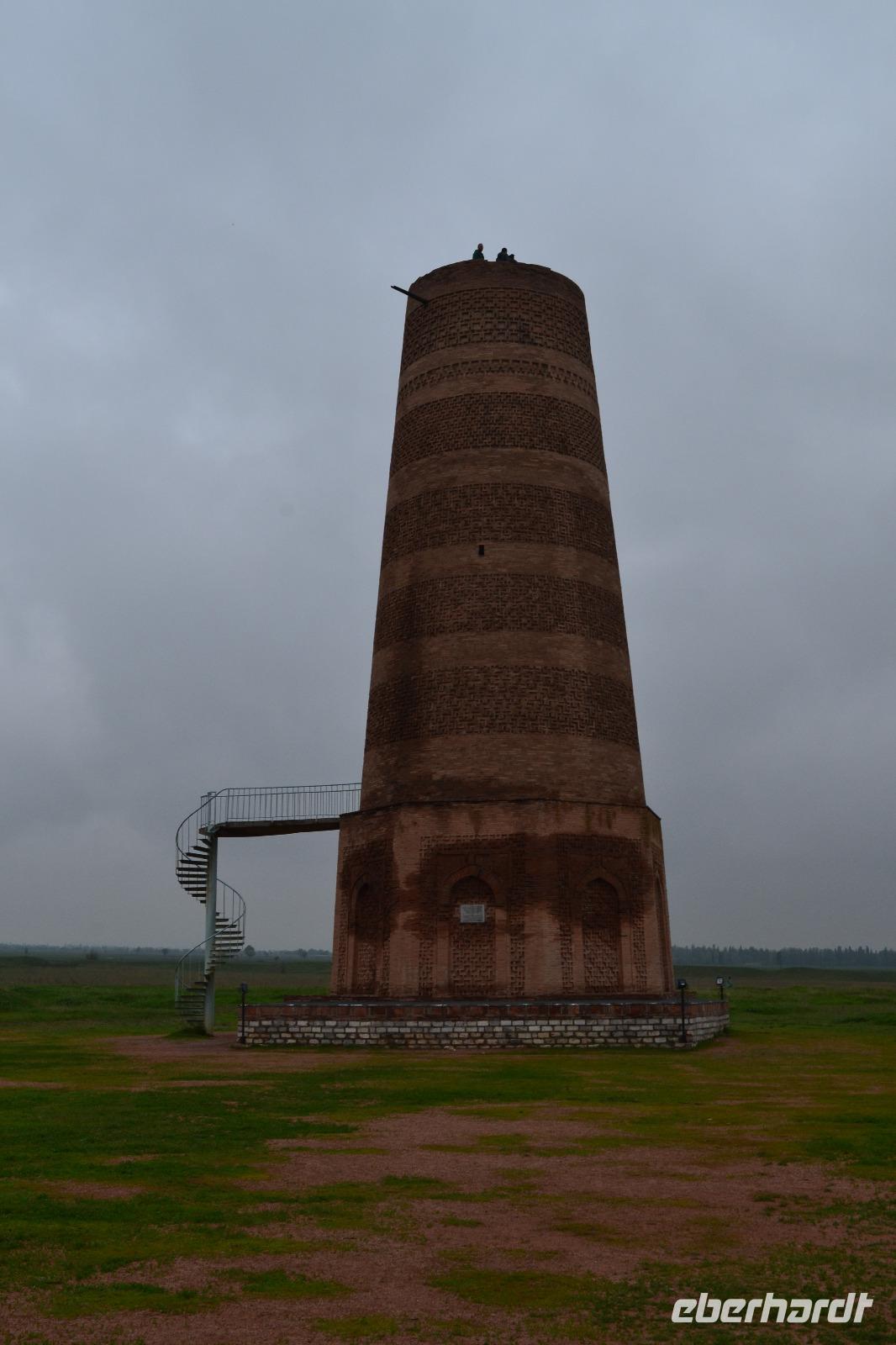 Nach dem Frühstück fahren wir noch einmal zur russisch-orthodoxen Kirche, die diesmal auch geöffnet ist. Die Hartnäckigkeit hat sich gelohnt, denn das Innere ist wirklich sehr sehenswert. Lena kauft uns Kerzen, die wir vor den Ikonen der Heiligen aufstellen können. Anschließend fahren wir entlang des malerischen Südufers des Issyk-Kul-Sees nach Bishkek. Nach einer halben Stunde erreichen wir die Jeti-Oguz-Schlucht, wo wir eindrucksvolle Felsformationen aus rotem Sandstein bestaunen können, darunter ein gebrochenes Herz und die „Sieben Ochsen". In der Schlucht können wir uns ein bisschen auf eigene Faust umschauen. U. a. gibt es hier auch ein Sanatorium aus der Sowjetzeit, das immer noch in Betrieb ist. Die weitere Fahrt führt über teilweise sehr holprige Straßen. Unter alten Ladas und Eselskarren wirkt unser großer Bus schon seit Tagen wie ein UFO. Als Überraschung sind wir bei einer kirgisischen Familie zur Teepause eingeladen. Besonders die leckere Aprikosenmarmelade hat es uns angetan. Am späten Nachmittag erreichen wir die Ruinen von Burana. Die Überreste des angeblich einmal 40 m hohen Minarettes und weitere Ruinen sowie der Friedhof zeugen davon, dass es hier im 10. und 11. Jahrhundert eine große Stadt unter der Herrschaft der Karachaniden gegeben hat. Bis in die kirgisische Hauptstadt Bishkek fahren wir nun noch eine weitere Stunde. Als Entschädigung für die lange Fahrt werden wir aber mit einem sehr schönen Hotel und sehr guten Abendessen belohnt.