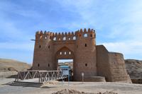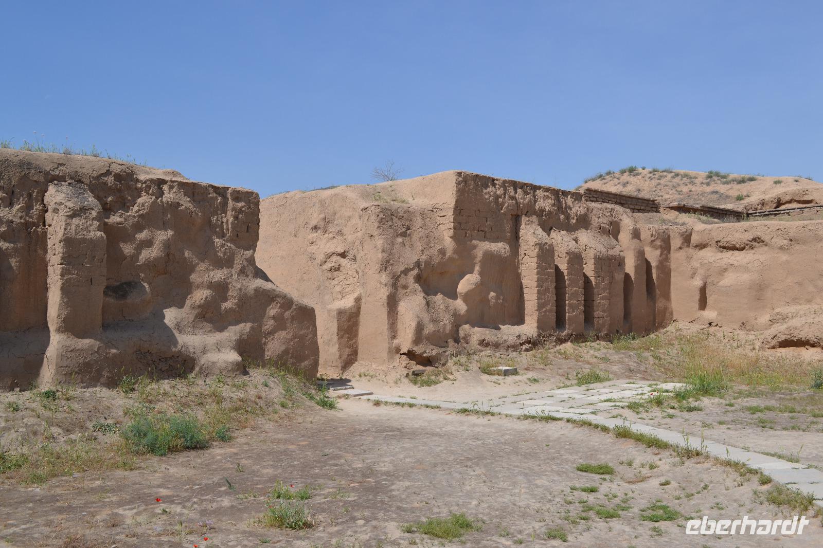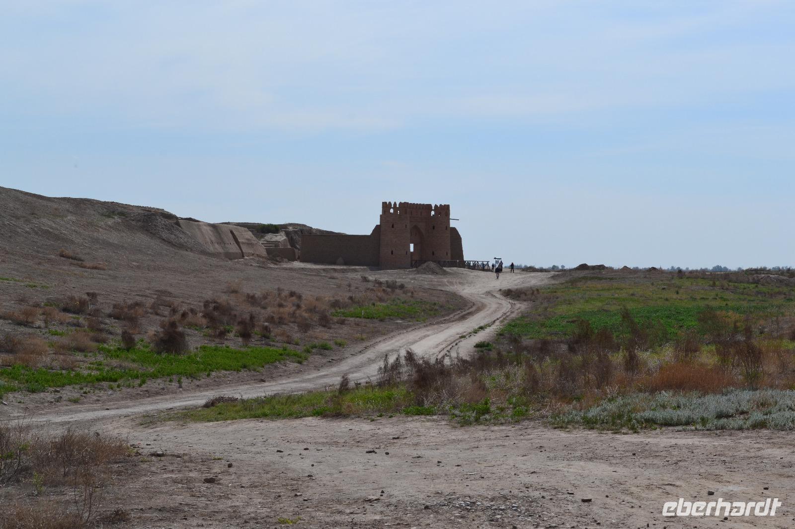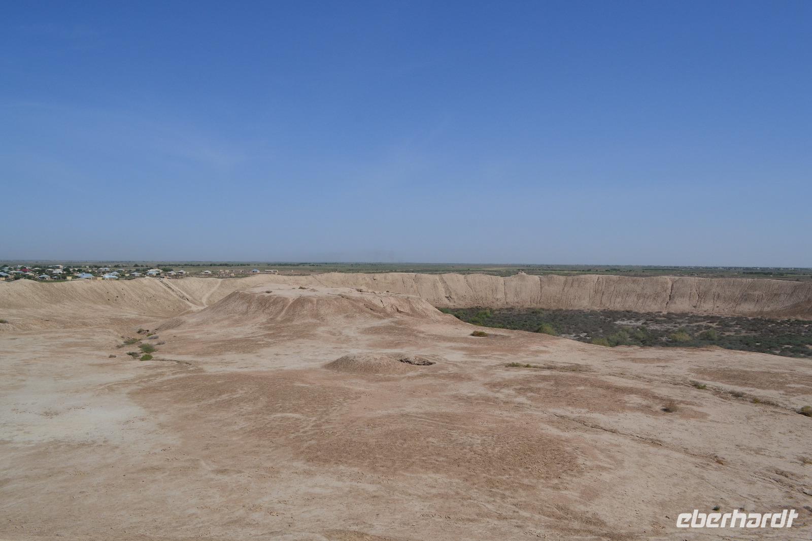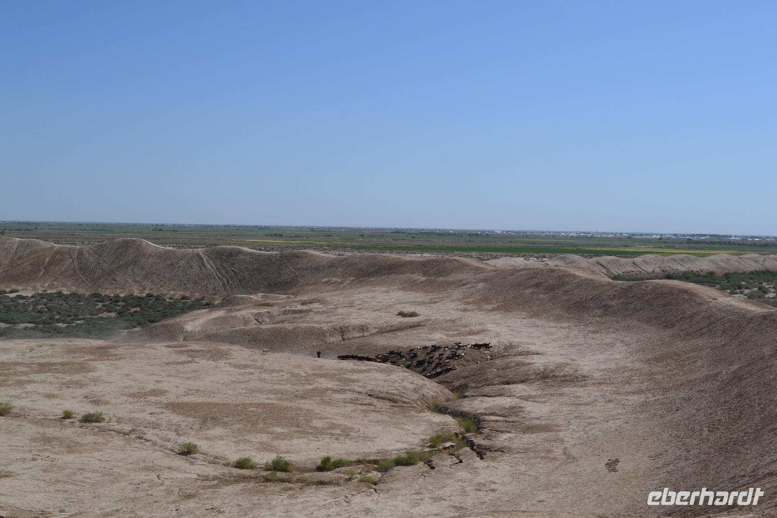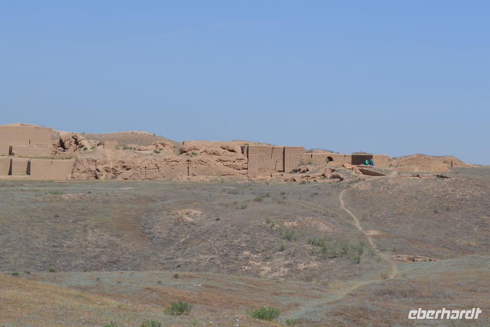Unser erster Abschnitt dieser Reise geht heute zu Ende, sodass sich etwas Wehmut bemerkbar macht. Immerhin bleibt uns Lena ja noch ein paar Stunden erhalten. Auf dem Weg zur Grenze nach Usbekistan muss sie uns noch zwei Stationen erklären. Der erste Anlaufpunkt ist das Mausoleum des bekannten islamischen Mystikers Astanbab, der als Lehrer von Ahmed Jassewi gilt und daher ebenfalls sehr verehrt wird. Des Weiteren besuchen wir heute die Geisterstadt Otrar. Gegründet in der Nähe des Flusses Syrdarja entwickelte sich Otrar ab dem 9. Jahrhundert zu einem wichtigen Zentrum des Handels und der Wissenschaft, wurde aber stets auch zum Spielball verschiedener Mächte. Im Jahre 1219 belagerten dann die Mongolen unter Dschingis Khan die Stadt und machten sie dem Erdboden gleich. Nach dem Tod des großen Mongolenherrschers gelangte Otrar jedoch im Gegensatz zu anderen zerstörten Städten zu neuer Blüte. Erst im 17. und 18. Jahrhundert begann der endgültige Niedergang, als nach und nach das Bewässerungssystem ausfiel. Durch eines der rekonstruierten Stadttore können wir auf den Hügel, auf dem sich die Kernstadt befand, hinaufgehen und erkennen in der Ferne sogar ein paar Kamele. Nun geht es aber wirklich zur Grenze, und wir müssen uns von Lena und unseren beiden Busfahrern verabschieden. Auch diesmal ist alles weniger schlimm als befürchtet, aber dafür beobachten wir um uns herum ein heilloses Chaos, denn viele Usbeken versuchen in Kasachstan hinter der Grenze billig einzukaufen und ihre Waren dann in Usbekistan mit Gewinn wieder zu verkaufen. Dabei haben die Kleinhändler es vor allem auf Tafelgeschirr und ziemlich hässliche Thermoskannen abgesehen, was uns erst einmal ratlos zurücklässt. Auf der usbekischen Seite wartet dann unsere neue örtliche Reiseleiterin Swetlana auf uns, die uns ebenfalls sehr herzlich empfängt und bis ins Hotel in Taschkent bringt. Aufgrund von Reparaturarbeiten funktioniert leider bei unserer Ankunft in einigen Zimmern das Wasser nicht, was aber bis zum Abend behoben wird. Das Essen am Abend im Restaurant ist wieder sehr gut, und bei einer Runde Wodka stoßen wir auf den zweiten Abschnitt unserer Reise an.