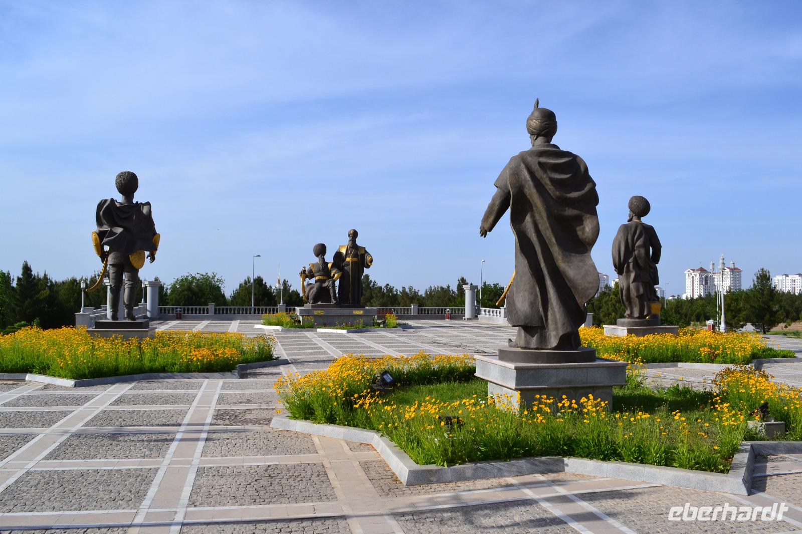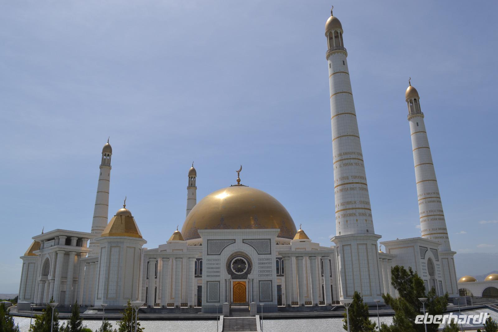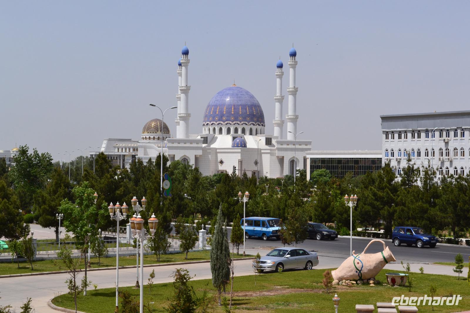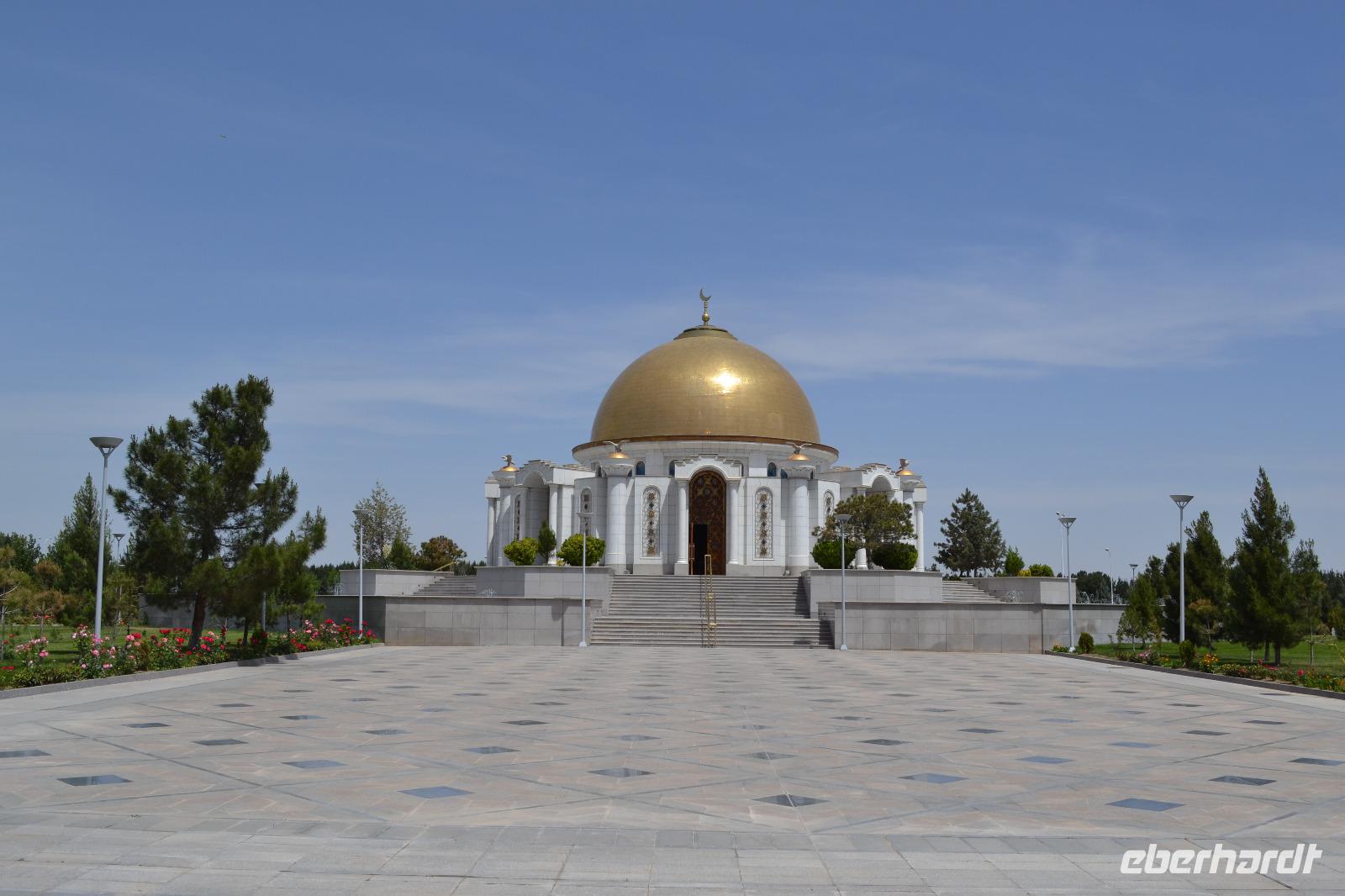Nach einer ruhigen Nacht in unserem wirklich sehr schönen Hotel fliegen wir am Morgen in die turkmenische Hauptstadt Aschgabat, die am Fuße der Kopet-Dag-Berge in einer fruchtbaren Oase in der Karakum-Wüste liegt. Wir fahren zuerst in die Ruinenstadt Nisa, die erste Hauptstadt der geheimnisvollen Parther, und werden dort durch die Anlage geführt. In ihrer Blüte umfasste das Partherreich ein gewaltiges Gebiet, das (u. a.) weite Teile der heutigen Staaten Irak, Iran, Armenien und Turkmenistan umfasste. Mittags fahren wir in die Innenstadt zurück zu unserem letzten Hotel auf dieser Reise. Unterwegs besichtigen wir die monumentale - ein anderes Adjektiv würde dem Bauwerk nicht gerecht werden - Moschee in Kipchak. 5.000 unterirdische Parkplätze, im Inneren Platz für angeblich 20.000 Menschen - und wir sind die einzigen Besucher, mit Ausnahme der Wachsoldaten sogar die einzigen Menschen weit und breit. Neben der Moschee ist der Schrein für die Familie des ehemaligen Präsidenten, ansonsten gibt es kaum Häuser im näheren Umkreis. Dieser Irrsinn i. S. von Bauwahn scheint Ausdruck der internationalen Geltungssucht der politischen Elite zu sein; anders können wir uns die Stadt Ashgabat nicht erklären, in der es Parks gibt, durch die niemand läuft und an Paläste erinnernde Hochhäuser mit Wohnungen, in denen (angeblich) niemand wohnt (da sich die Wohnungen niemand leisten kann). Nicht weit von unserem Hotel entfernt befindet sich der russische Basar „Gulistan-Russkiy". Hier spendiere ich meine Gäste eine leckere Suppe zum Mittagessen, und wir können die vielen Eindrücke erst einmal verarbeiten. Unser Programm für heute ist jedoch noch nicht zu Ende, denn mit Parzdepe steht noch eine weitere Ausgrabungsstätte auf dem Programm. In den Ruinen der bronzezeitlichen Siedlung halten wir es aber nicht lange aus, denn die Sonne brennt wie verrückt vom Himmel, und es gibt kaum Schatten. Da machen wir mit Alexander doch lieber noch eine kleine Stadtrundfahrt, bestaunen die Regierungspaläste aus weißem Marmor und Gold, spazieren durch den Freiheitspark und halten am Neutralitätsdenkmal. Unser Abendessen nehmen wir in einem Restaurant nicht weit vom Hotel entfernt ein, und wir bekommen auch wieder Wodka spendiert.