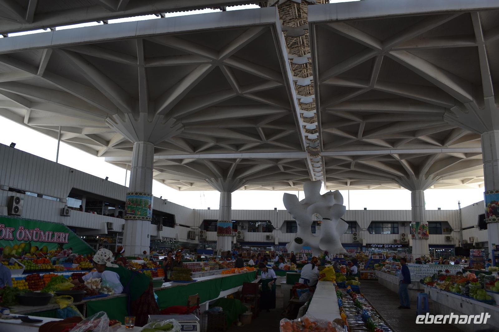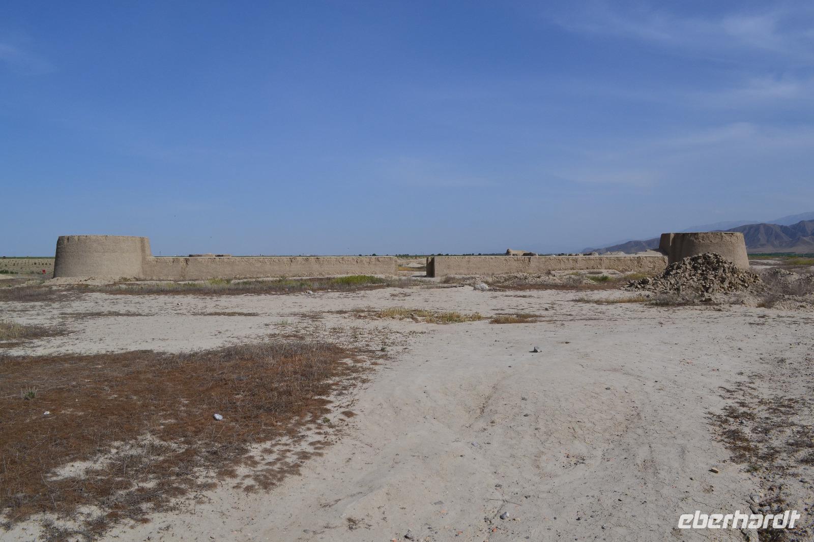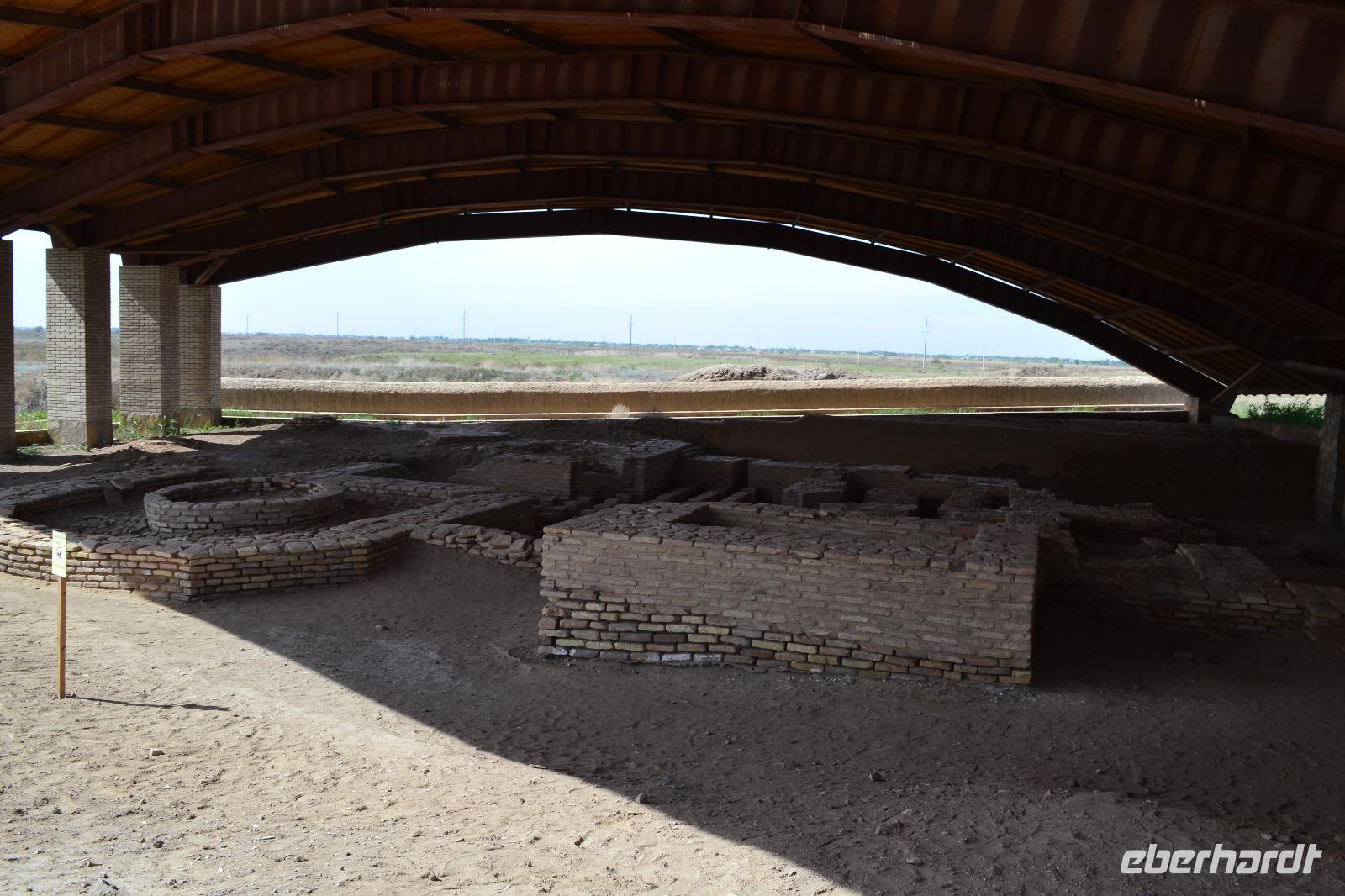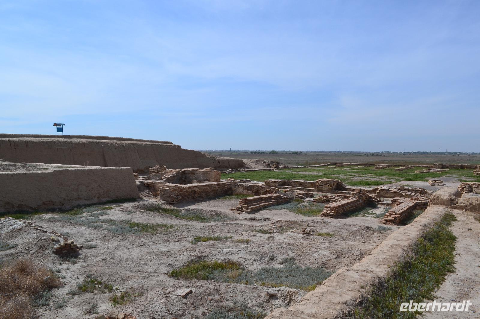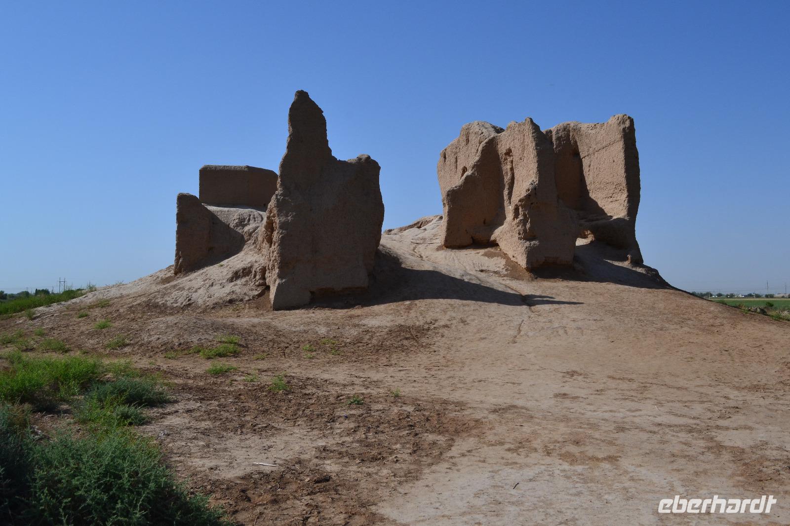 Nach einer ruhigen Nacht in unserem wirklich sehr schönen Hotel fliegen wir am Morgen in die turkmenische Hauptstadt Aschgabat, die am Fuße der Kopet-Dag-Berge in einer fruchtbaren Oase in der Karakum-Wüste liegt. Wir fahren zuerst in die Ruinenstadt Nisa, die erste Hauptstadt der geheimnisvollen Parther, und werden dort durch die Anlage geführt. In ihrer Blüte umfasste das Partherreich ein gewaltiges Gebiet, das (u. a.) weite Teile der heutigen Staaten Irak, Iran, Armenien und Turkmenistan umfasste. Mittags fahren wir in die Innenstadt zurück zu unserem letzten Hotel auf dieser Reise. Unterwegs besichtigen wir die monumentale - ein anderes Adjektiv würde dem Bauwerk nicht gerecht werden - Moschee in Kipchak. 5.000 unterirdische Parkplätze, im Inneren Platz für angeblich 20.000 Menschen - und wir sind die einzigen Besucher, mit Ausnahme der Wachsoldaten sogar die einzigen Menschen weit und breit. Neben der Moschee ist der Schrein für die Familie des ehemaligen Präsidenten, ansonsten gibt es kaum Häuser im näheren Umkreis. Dieser Irrsinn i. S. von Bauwahn scheint Ausdruck der internationalen Geltungssucht der politischen Elite zu sein; anders können wir uns die Stadt Ashgabat nicht erklären, in der es Parks gibt, durch die niemand läuft und an Paläste erinnernde Hochhäuser mit Wohnungen, in denen (angeblich) niemand wohnt (da sich die Wohnungen niemand leisten kann). Nicht weit von unserem Hotel entfernt befindet sich der russische Basar „Gulistan-Russkiy". Hier spendiere ich meine Gäste eine leckere Suppe zum Mittagessen, und wir können die vielen Eindrücke erst einmal verarbeiten. Unser Programm für heute ist jedoch noch nicht zu Ende, denn mit Parzdepe steht noch eine weitere Ausgrabungsstätte auf dem Programm. In den Ruinen der bronzezeitlichen Siedlung halten wir es aber nicht lange aus, denn die Sonne brennt wie verrückt vom Himmel, und es gibt kaum Schatten. Da machen wir mit Alexander doch lieber noch eine kleine Stadtrundfahrt, bestaunen die Regierungspaläste aus weißem Marmor und Gold, spazieren durch den Freiheitspark und halten am Neutralitätsdenkmal. Unser Abendessen nehmen wir in einem Restaurant nicht weit vom Hotel entfernt ein, und wir bekommen auch wieder Wodka spendiert.