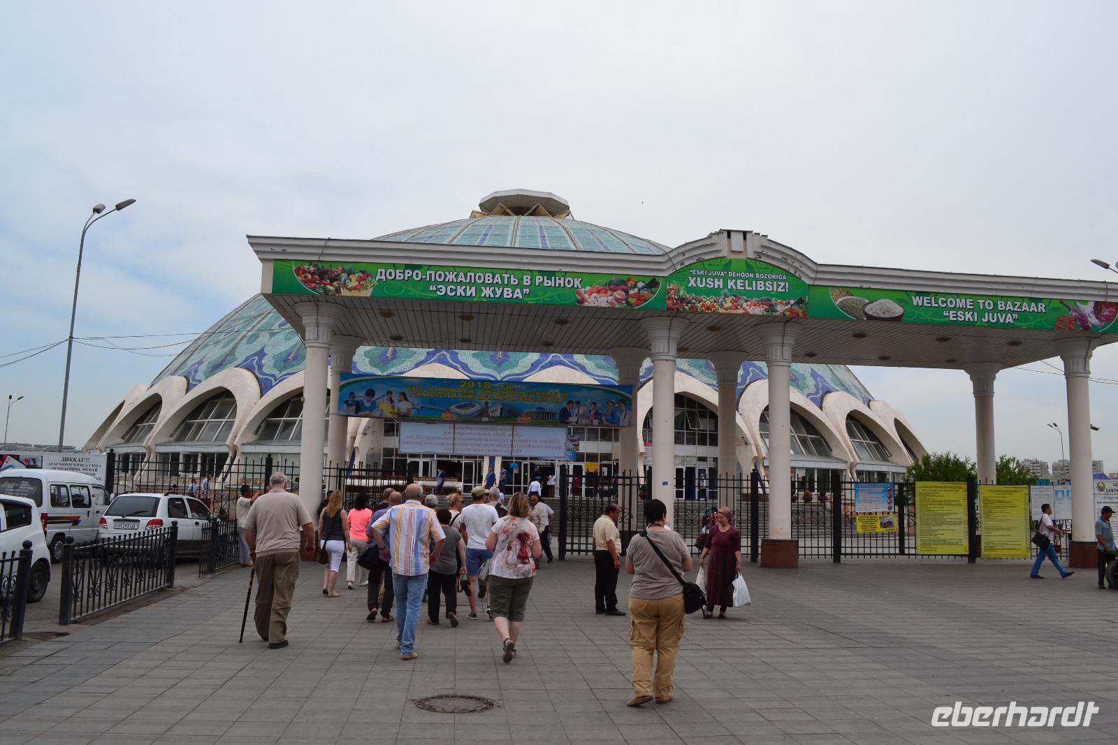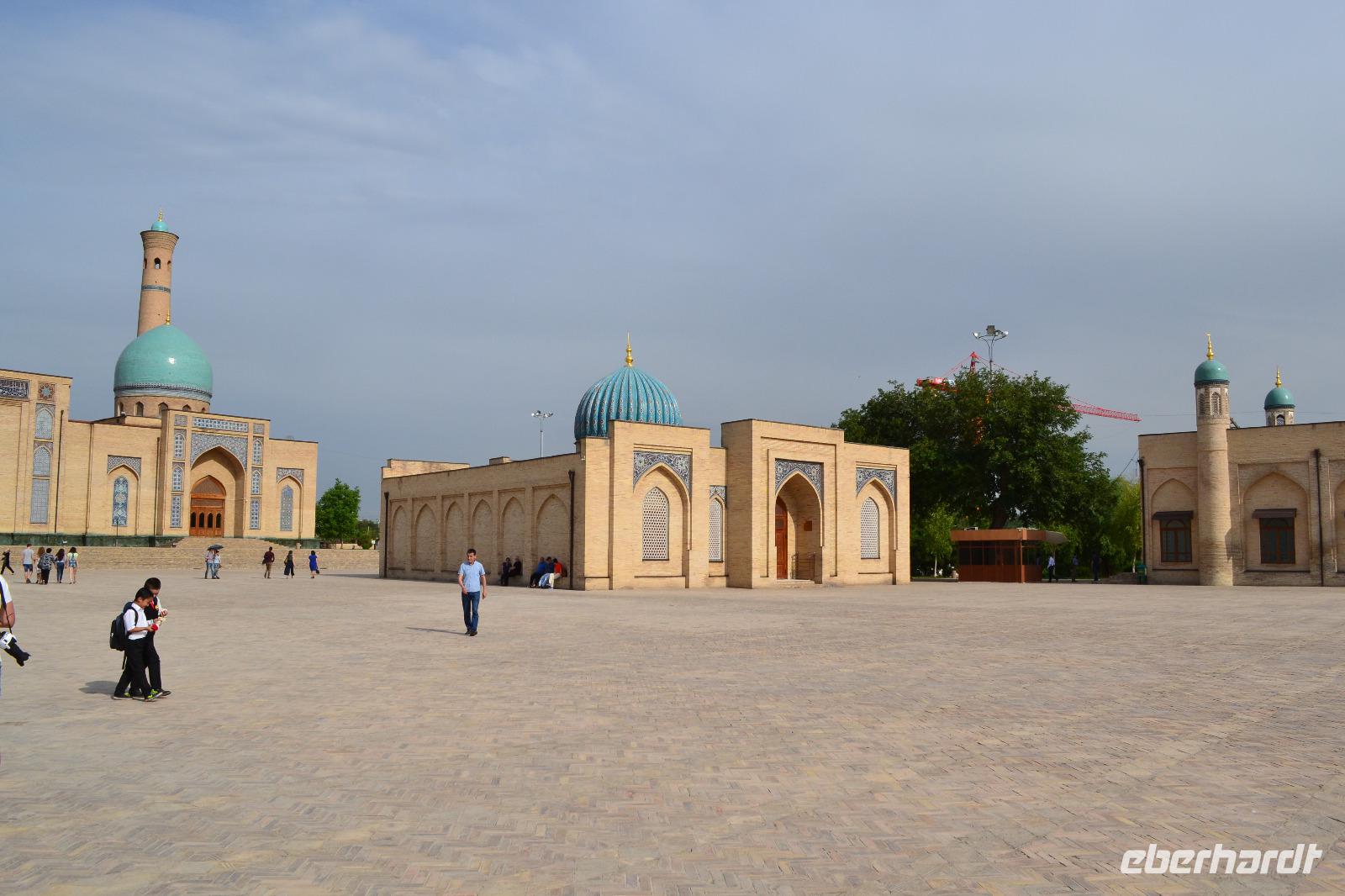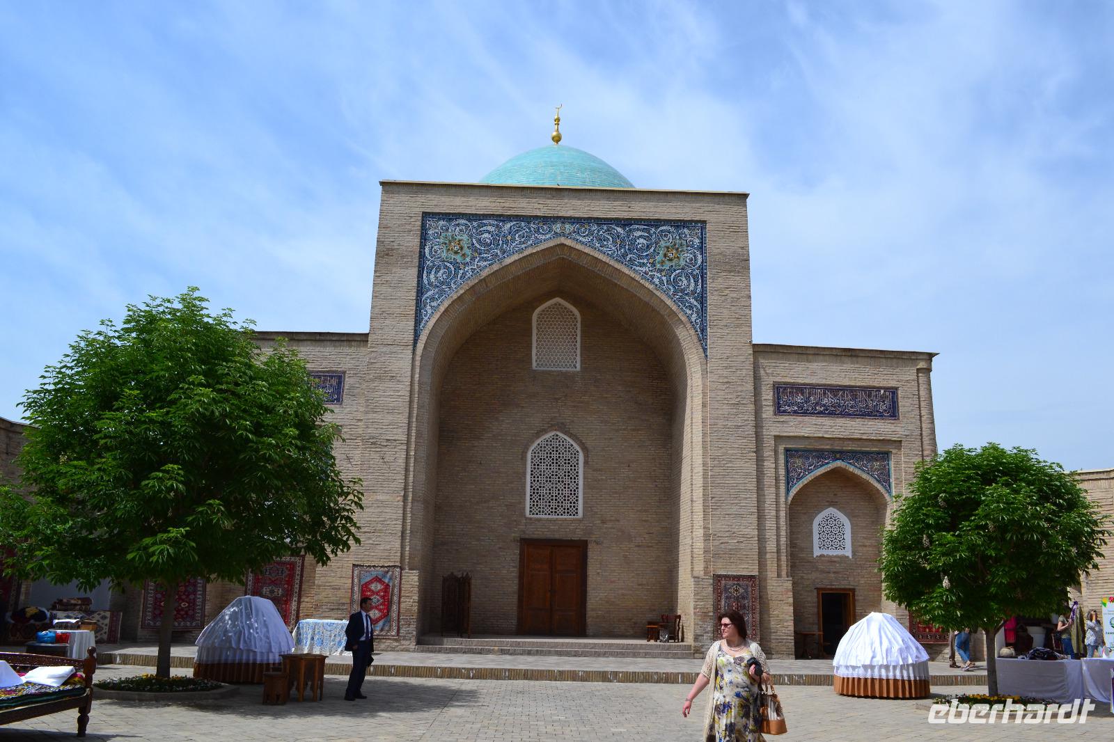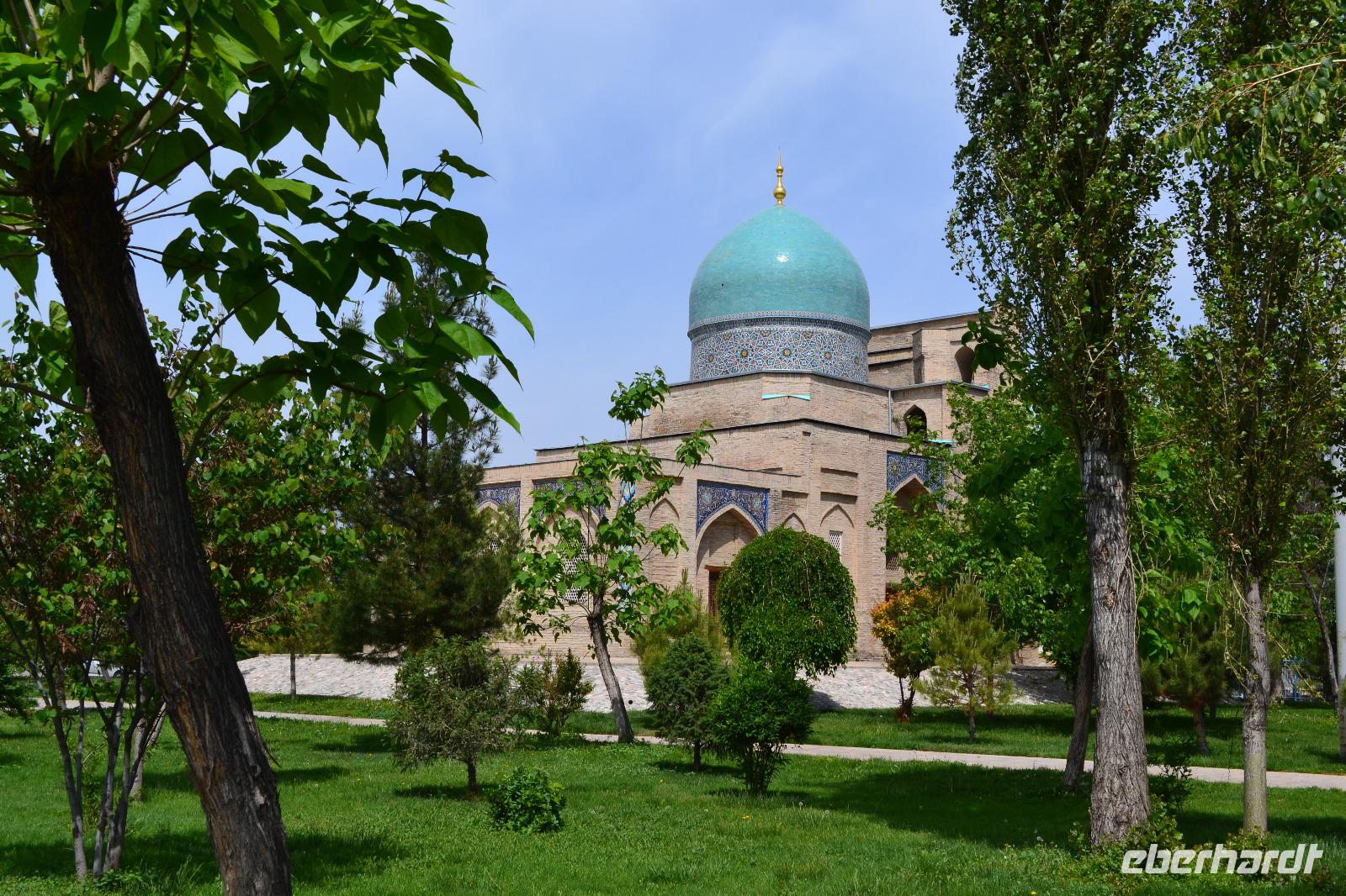 Man könnte meine, das ganze Land habe sich heute für uns herausgeputzt. Doch es ist leider nur der türkische Präsident, der auf Staatsbesuch in Usbekistan weilt, dem diese Aufmerksamkeit gilt. Wir können ihn alle sowieso nicht so gut leiden, und die Tatsache, dass er uns den Besuch der Bibliothek am Hast-Imam-Platz mit dem ältesten handgeschriebenen Koran der Welt vermasselt, lässt ihn auch nicht gerade Sympathiepunkte gewinnen. Aber immerhin sieht die usbekische Hauptstadt heute ganz besonders sauber aus, weshalb wir tolle Fotos machen können. Am Hast-Imam-Platz können wir aber die wunderschöne Barak-Khan-Medrese, die Tillya-Sheikh-Moschee und das Kaffal-Shashi-Mausoleum aus schlichtem Backsteinmauerwerk bewundern. Anschließend bummeln wir über den riesigen Chorsu-Basar zur Kukeldash-Medrese, die auch heute noch als Koranschule dient. Auf dem Basar werden wir von den vielen Gerüchen und angebotenen Waren ganz überwältigt. Zum Mittagessen fahren wir in ein kleines Freiluftrestaurant. Verrückt: damit kein Rauch die Sicht von Erdogan auf seiner Fahrt durch Taschkent trübt, darf dort heute nicht gegrillt werden! Aber die Suppen, Salate und das traditionelle Gericht aus Frischkäse sind auch alle sehr lecker. Am Nachmittag fahren wir dann ein paar Stationen mit der U-Bahn, deren Stationen ähnlich wie in Moskau oder St. Petersburg reich dekoriert sind und jede eine Geschichte erzählen. Im Museum für angewandte Kunst in einer alten, reich verzierten Villa erhalten wir Einblicke in die traditionelle Handwerkskunst und sehen Teppiche, Goldstickereien, Keramik, Porzellan, Schmuck, Kleinmöbel und Musikinstrumente. Auch der zweite Versuch am späten Nachmittag, den Koran zu sehen, scheitert, und so kehren wir schließlich zu unserem Hotel zurück. Beim Abendessen in einem Restaurant unweit des Hotels wundern wir uns, dass die Gänge alle so schnell hintereinander serviert werden. Doch Swetlana erklärt uns, dass man in Usbekistan nicht den Eindruck erwecken will, dass es nichts mehr zu essen gibt, und ein an Tellern und Schüsseln überbordender Tisch Ausdruck von Gastfreundschaft ist. Schmecken tut es uns aber allemal.