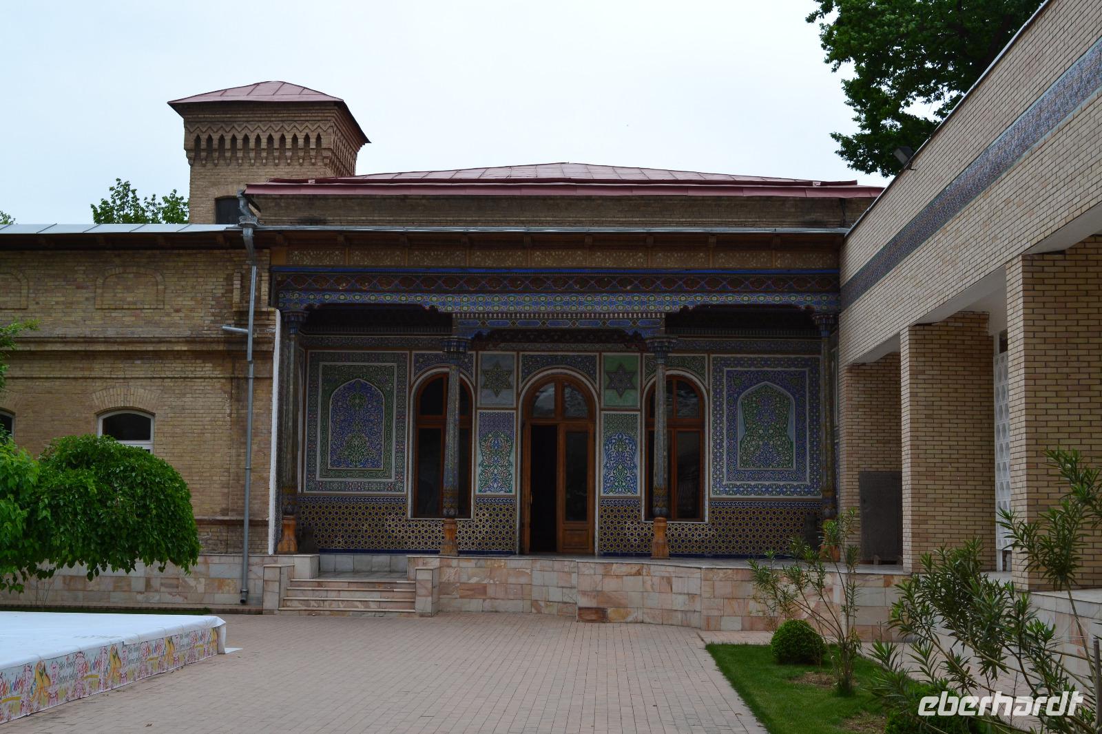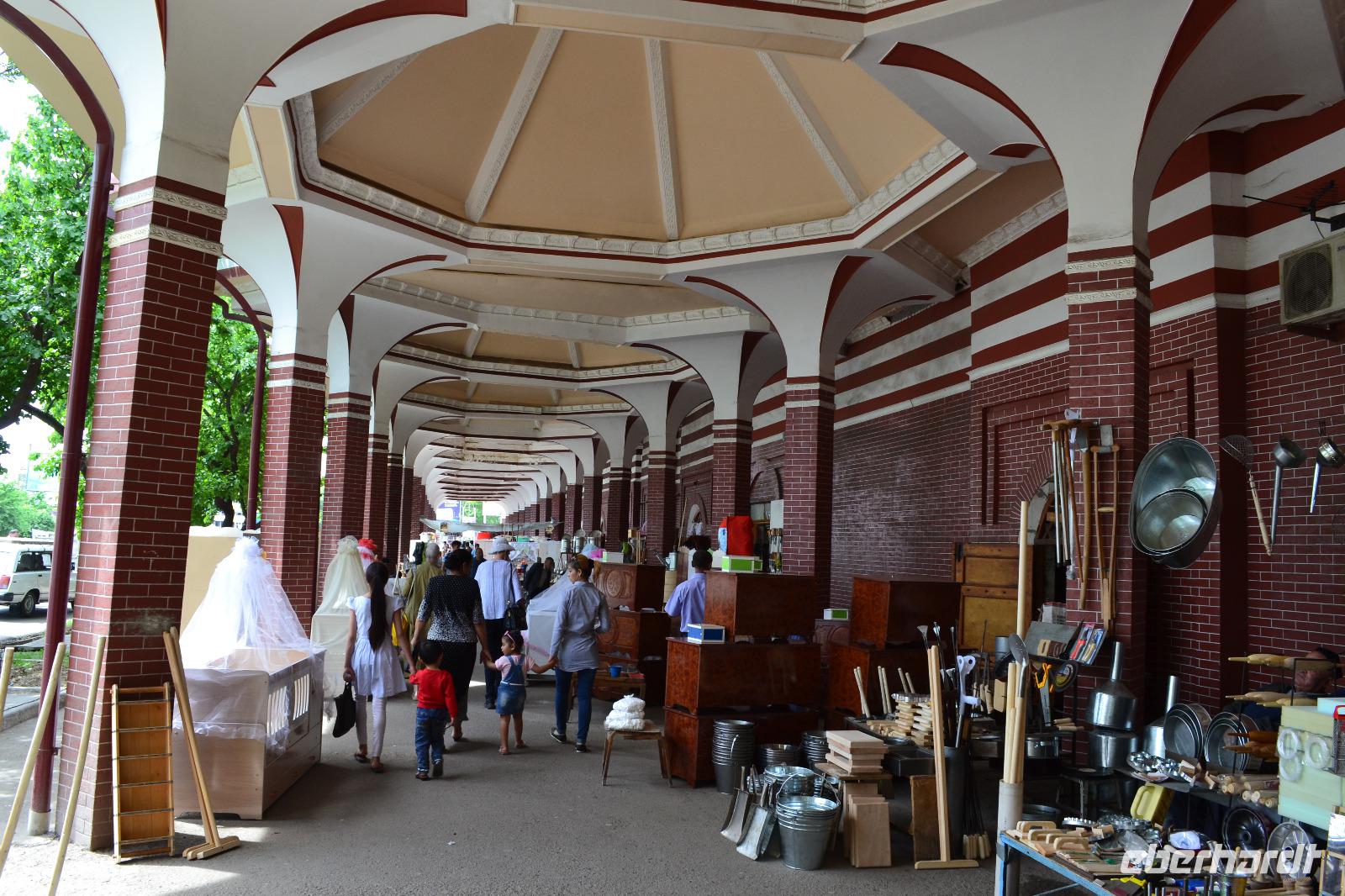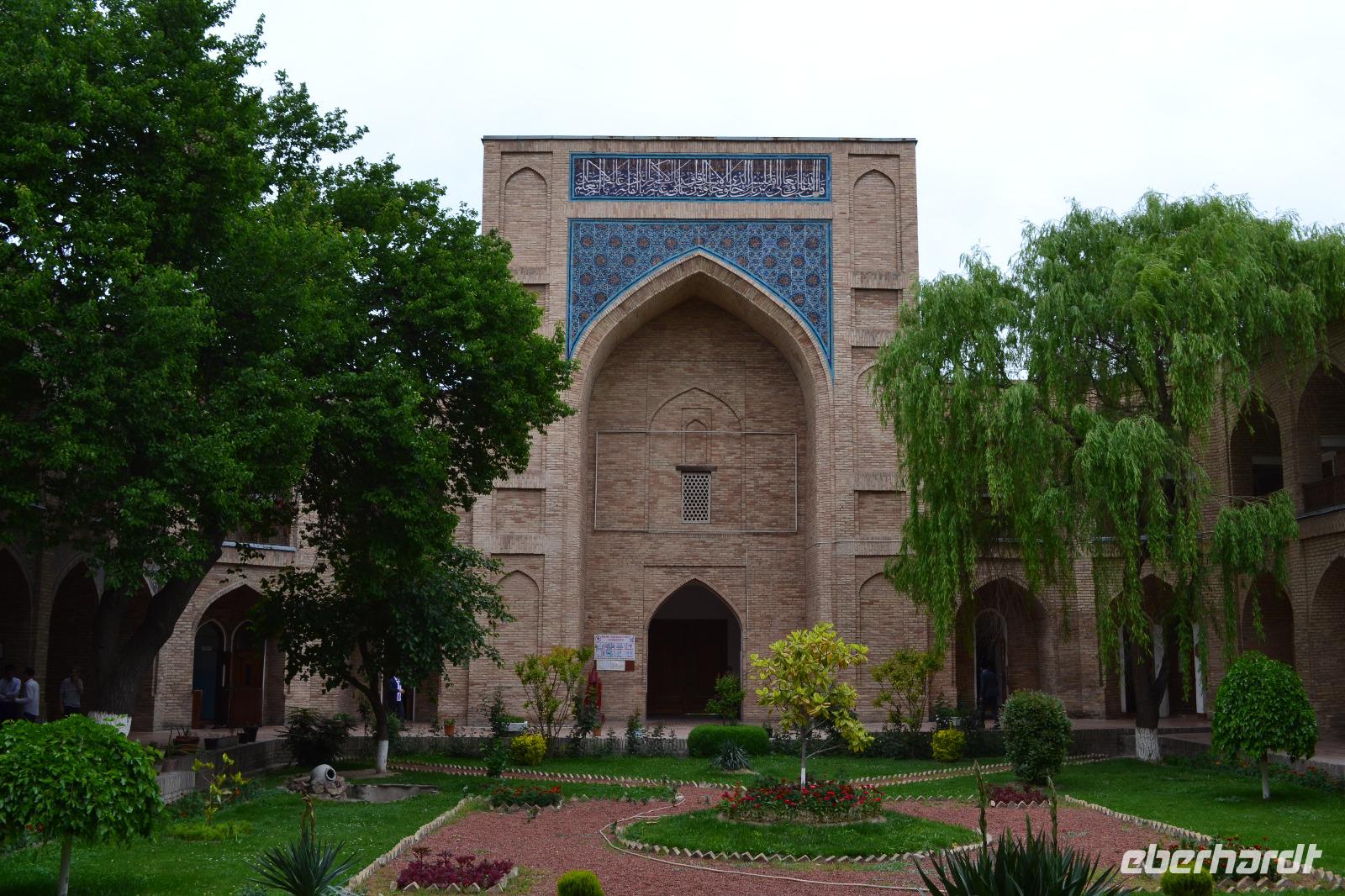 Man könnte meine, das ganze Land habe sich heute für uns herausgeputzt. Doch es ist leider nur der türkische Präsident, der auf Staatsbesuch in Usbekistan weilt, dem diese Aufmerksamkeit gilt. Wir können ihn alle sowieso nicht so gut leiden, und die Tatsache, dass er uns den Besuch der Bibliothek am Hast-Imam-Platz mit dem ältesten handgeschriebenen Koran der Welt vermasselt, lässt ihn auch nicht gerade Sympathiepunkte gewinnen. Aber immerhin sieht die usbekische Hauptstadt heute ganz besonders sauber aus, weshalb wir tolle Fotos machen können. Am Hast-Imam-Platz können wir aber die wunderschöne Barak-Khan-Medrese, die Tillya-Sheikh-Moschee und das Kaffal-Shashi-Mausoleum aus schlichtem Backsteinmauerwerk bewundern. Anschließend bummeln wir über den riesigen Chorsu-Basar zur Kukeldash-Medrese, die auch heute noch als Koranschule dient. Auf dem Basar werden wir von den vielen Gerüchen und angebotenen Waren ganz überwältigt. Zum Mittagessen fahren wir in ein kleines Freiluftrestaurant. Verrückt: damit kein Rauch die Sicht von Erdogan auf seiner Fahrt durch Taschkent trübt, darf dort heute nicht gegrillt werden! Aber die Suppen, Salate und das traditionelle Gericht aus Frischkäse sind auch alle sehr lecker. Am Nachmittag fahren wir dann ein paar Stationen mit der U-Bahn, deren Stationen ähnlich wie in Moskau oder St. Petersburg reich dekoriert sind und jede eine Geschichte erzählen. Im Museum für angewandte Kunst in einer alten, reich verzierten Villa erhalten wir Einblicke in die traditionelle Handwerkskunst und sehen Teppiche, Goldstickereien, Keramik, Porzellan, Schmuck, Kleinmöbel und Musikinstrumente. Auch der zweite Versuch am späten Nachmittag, den Koran zu sehen, scheitert, und so kehren wir schließlich zu unserem Hotel zurück. Beim Abendessen in einem Restaurant unweit des Hotels wundern wir uns, dass die Gänge alle so schnell hintereinander serviert werden. Doch Swetlana erklärt uns, dass man in Usbekistan nicht den Eindruck erwecken will, dass es nichts mehr zu essen gibt, und ein an Tellern und Schüsseln überbordender Tisch Ausdruck von Gastfreundschaft ist. Schmecken tut es uns aber allemal.