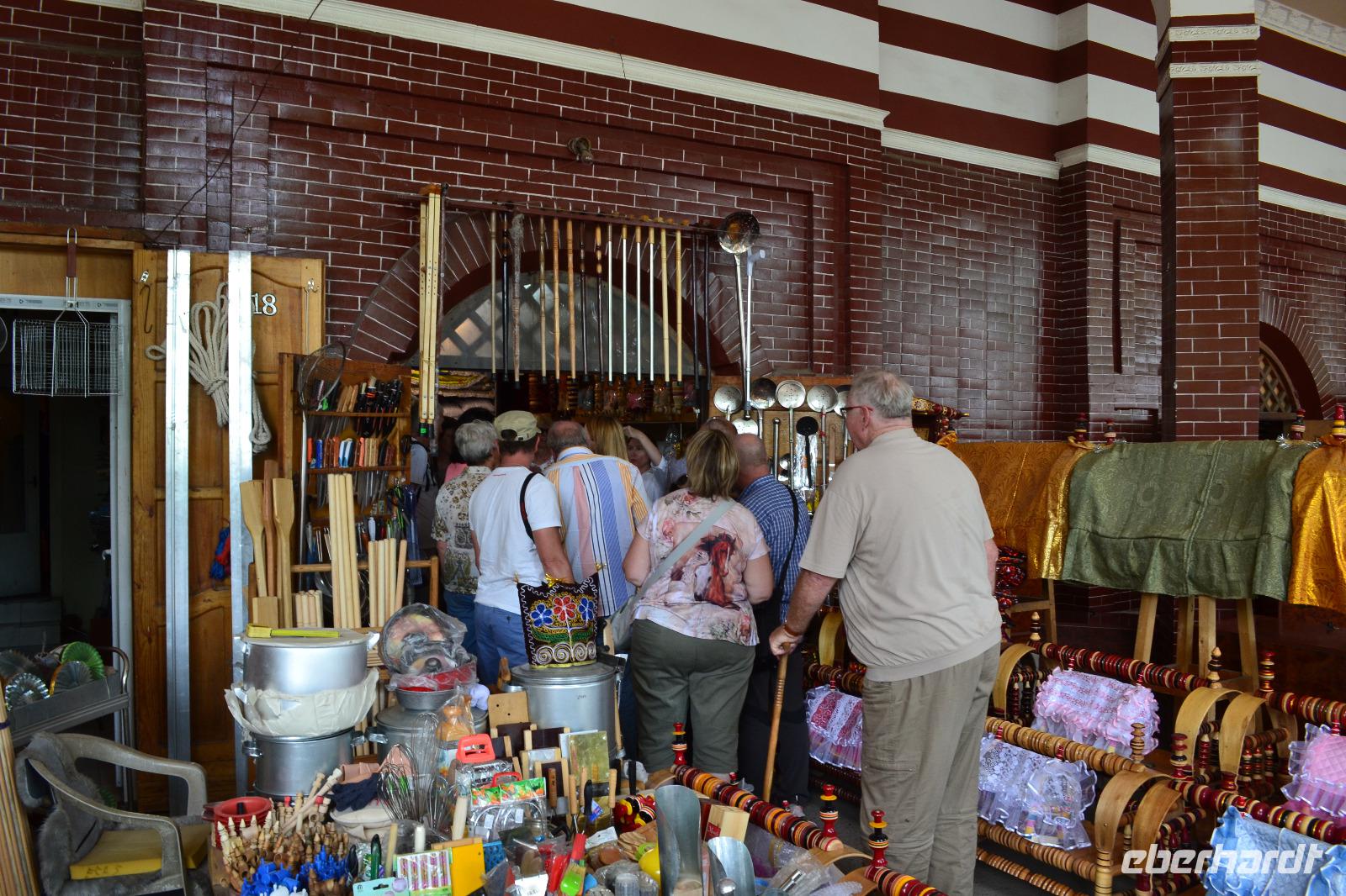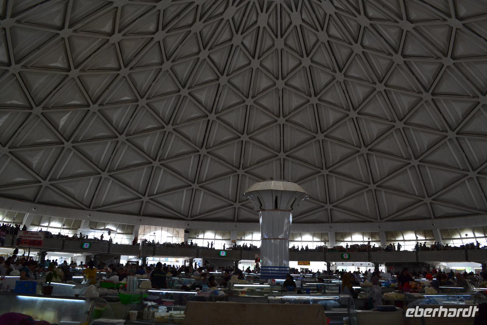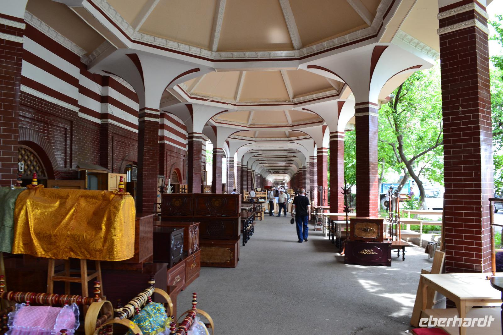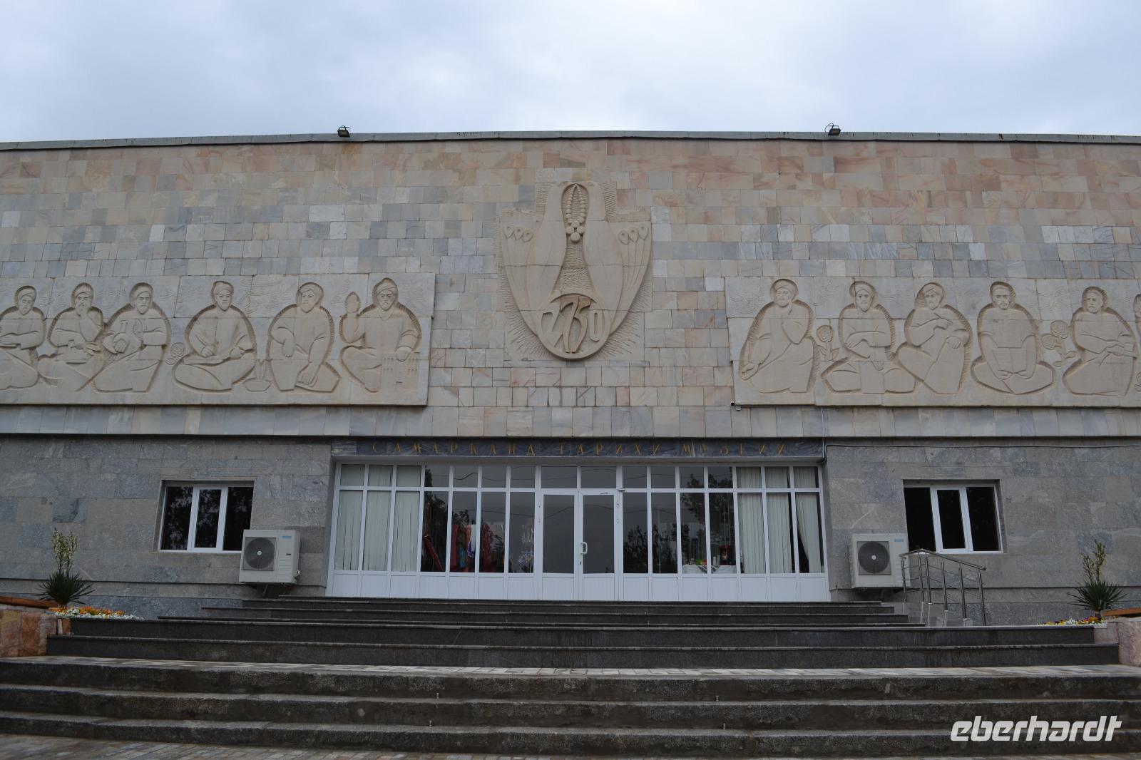 Man könnte meine, das ganze Land habe sich heute für uns herausgeputzt. Doch es ist leider nur der türkische Präsident, der auf Staatsbesuch in Usbekistan weilt, dem diese Aufmerksamkeit gilt. Wir können ihn alle sowieso nicht so gut leiden, und die Tatsache, dass er uns den Besuch der Bibliothek am Hast-Imam-Platz mit dem ältesten handgeschriebenen Koran der Welt vermasselt, lässt ihn auch nicht gerade Sympathiepunkte gewinnen. Aber immerhin sieht die usbekische Hauptstadt heute ganz besonders sauber aus, weshalb wir tolle Fotos machen können. Am Hast-Imam-Platz können wir aber die wunderschöne Barak-Khan-Medrese, die Tillya-Sheikh-Moschee und das Kaffal-Shashi-Mausoleum aus schlichtem Backsteinmauerwerk bewundern. Anschließend bummeln wir über den riesigen Chorsu-Basar zur Kukeldash-Medrese, die auch heute noch als Koranschule dient. Auf dem Basar werden wir von den vielen Gerüchen und angebotenen Waren ganz überwältigt. Zum Mittagessen fahren wir in ein kleines Freiluftrestaurant. Verrückt: damit kein Rauch die Sicht von Erdogan auf seiner Fahrt durch Taschkent trübt, darf dort heute nicht gegrillt werden! Aber die Suppen, Salate und das traditionelle Gericht aus Frischkäse sind auch alle sehr lecker. Am Nachmittag fahren wir dann ein paar Stationen mit der U-Bahn, deren Stationen ähnlich wie in Moskau oder St. Petersburg reich dekoriert sind und jede eine Geschichte erzählen. Im Museum für angewandte Kunst in einer alten, reich verzierten Villa erhalten wir Einblicke in die traditionelle Handwerkskunst und sehen Teppiche, Goldstickereien, Keramik, Porzellan, Schmuck, Kleinmöbel und Musikinstrumente. Auch der zweite Versuch am späten Nachmittag, den Koran zu sehen, scheitert, und so kehren wir schließlich zu unserem Hotel zurück. Beim Abendessen in einem Restaurant unweit des Hotels wundern wir uns, dass die Gänge alle so schnell hintereinander serviert werden. Doch Swetlana erklärt uns, dass man in Usbekistan nicht den Eindruck erwecken will, dass es nichts mehr zu essen gibt, und ein an Tellern und Schüsseln überbordender Tisch Ausdruck von Gastfreundschaft ist. Schmecken tut es uns aber allemal.