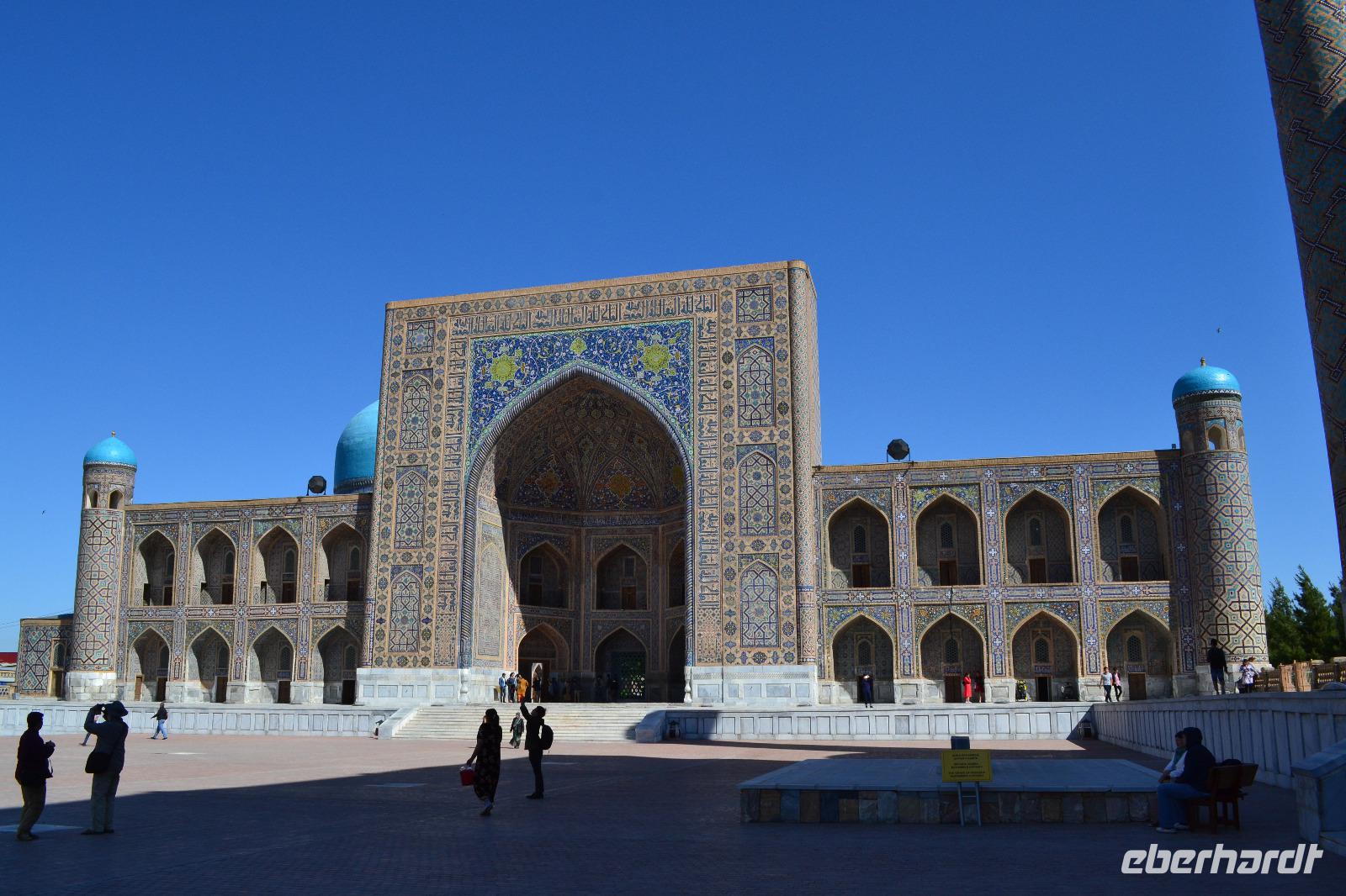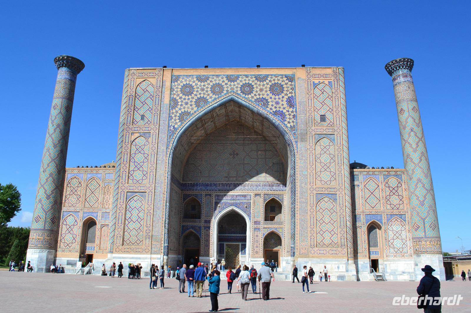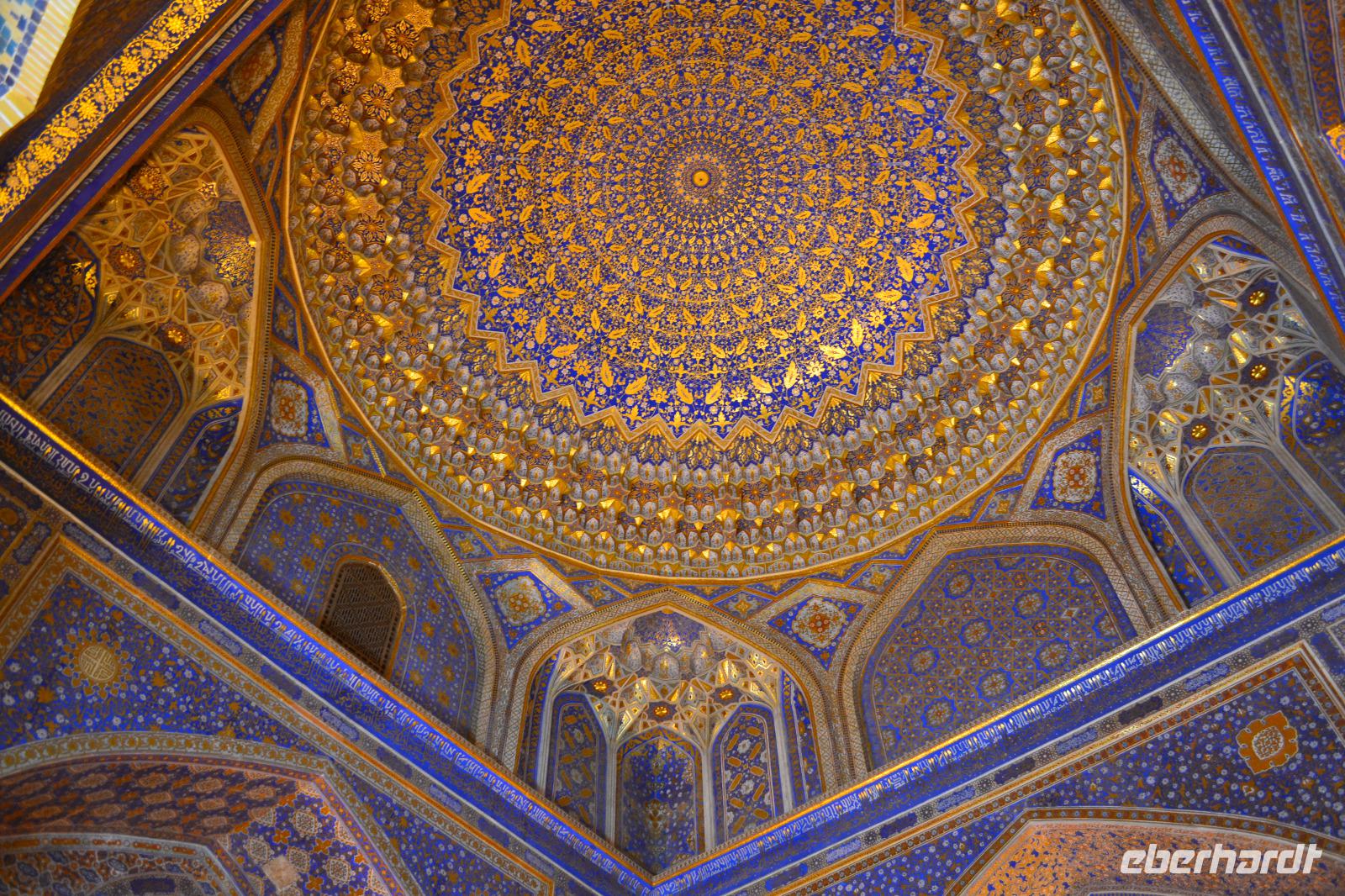 Mit Blick auf den Wetterbericht hatten wir die Besichtigung des Registans auf den heutigen Morgen verschoben, was sich im Nachhinein als goldrichtige Entscheidung herausstellt. Verdunkelten gestern Vormittag noch Regenwolken den Himmel, so lacht uns heute wieder freundlich die Sonne an. Um den Registan sind drei Medresen, also Schulen für islamische Wissenschaften, angeordnet, wobei sich die älteste, die Ulug-Beg-Medrese aus dem 15. Jahrhundert, und die zweitälteste, die Sher-Dor-Medrese aus dem 17. Jahrhundert, entsprechend des Kosch-Prinzips gegenüberstehen. Die jüngste Medrese, die ebenfalls im 17. Jahrhundert erbaute Tilya-Kori-Medrese, befindet sich in der Mitte, am Nordende des Platzes. Beginnend mit der Ulug-Beg-Medrese besichtigen wir alle drei Gebäudekomplexe im Uhrzeigersinn. In der dritten Medrese darf/muss ich mich zu Anschauungszwecken als Derwisch verkleiden und ein Schweigegelübde abhalten. Gottseidank brauche ich es nicht lange einhalten, und kann somit zur Mittagspause in einer alten Karawanserei mein Essen bestellen. Auch meine Gäste profitieren davon, denn ich habe mal wieder die Spendierhosen an und jeder erhält einen leckeren Nachtisch. Die Moschee Bibi Khanim, die wir anschließend besichtigen, ließ der große Herrscher Timur ab 1399 erbauen. Sie sollte natürlich - wie es sich für einen größenwahnsinnigen Feldherren gehört, der sich in der Tradition Dschingis Khans sieht - die größte Moschee der Welt werden. Entgegen der Warnungen seiner Baumeister hielt Timur an seinen Plänen fest, weshalb schon bald nach Fertigstellung die ersten Ziegel auf die Gläubigen herabfielen. Als wir durch das gewaltige Paradeportal in den Innenhof der rekonstruierten Moschee treten, werden wir dennoch von Ehrfurcht erfasst. Ein Bummel über den Siyob-Basar holt uns wieder in weltliche Gefilde zurück, bevor wir zum Abschluss die Nekropole Shohizinda erkunden, in der angeblich ein Cousin Mohammeds begraben liegt. Unser Restaurant, in dem wir zu Abend essen, liegt etwas außerhalb, und auch hier findet parallel im Nachbarraum wieder eine Geburtstagsparty statt. Wir werden ebenfalls zum Tanzen aufgefordert, und lernen den Brauch kennen, nachdem die mutigen Tänzer mit Geld beschenkt werden. Nach dem Abendessen schauen wir spontan noch einmal am Registan vorbei, um diesen herrlichen Platz bei Nacht zu bewundern.