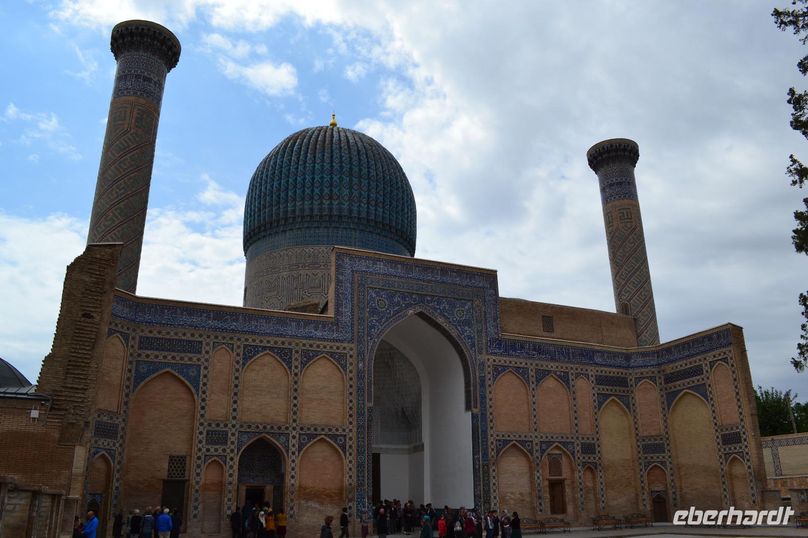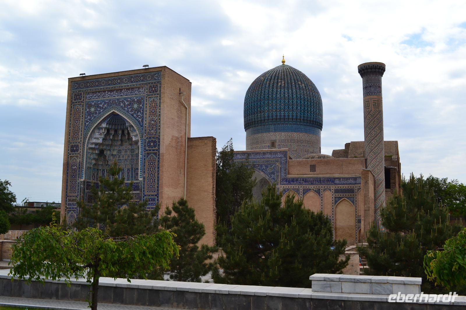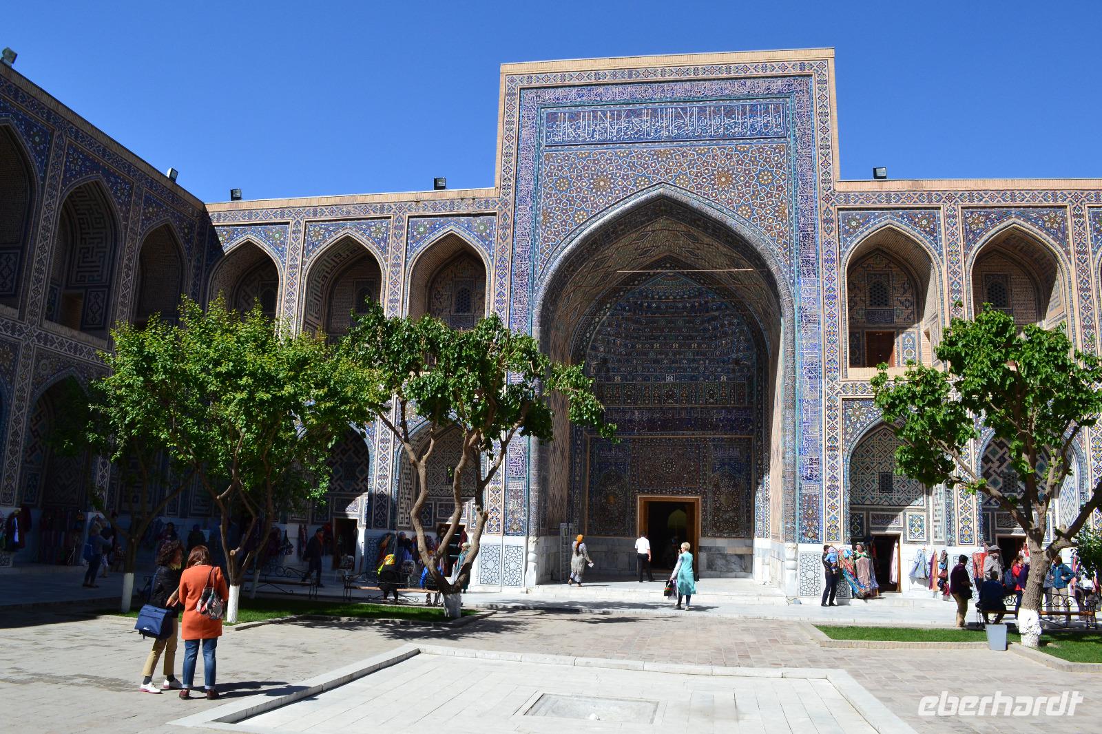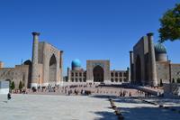Mit Blick auf den Wetterbericht hatten wir die Besichtigung des Registans auf den heutigen Morgen verschoben, was sich im Nachhinein als goldrichtige Entscheidung herausstellt. Verdunkelten gestern Vormittag noch Regenwolken den Himmel, so lacht uns heute wieder freundlich die Sonne an. Um den Registan sind drei Medresen, also Schulen für islamische Wissenschaften, angeordnet, wobei sich die älteste, die Ulug-Beg-Medrese aus dem 15. Jahrhundert, und die zweitälteste, die Sher-Dor-Medrese aus dem 17. Jahrhundert, entsprechend des Kosch-Prinzips gegenüberstehen. Die jüngste Medrese, die ebenfalls im 17. Jahrhundert erbaute Tilya-Kori-Medrese, befindet sich in der Mitte, am Nordende des Platzes. Beginnend mit der Ulug-Beg-Medrese besichtigen wir alle drei Gebäudekomplexe im Uhrzeigersinn. In der dritten Medrese darf/muss ich mich zu Anschauungszwecken als Derwisch verkleiden und ein Schweigegelübde abhalten. Gottseidank brauche ich es nicht lange einhalten, und kann somit zur Mittagspause in einer alten Karawanserei mein Essen bestellen. Auch meine Gäste profitieren davon, denn ich habe mal wieder die Spendierhosen an und jeder erhält einen leckeren Nachtisch. Die Moschee Bibi Khanim, die wir anschließend besichtigen, ließ der große Herrscher Timur ab 1399 erbauen. Sie sollte natürlich - wie es sich für einen größenwahnsinnigen Feldherren gehört, der sich in der Tradition Dschingis Khans sieht - die größte Moschee der Welt werden. Entgegen der Warnungen seiner Baumeister hielt Timur an seinen Plänen fest, weshalb schon bald nach Fertigstellung die ersten Ziegel auf die Gläubigen herabfielen. Als wir durch das gewaltige Paradeportal in den Innenhof der rekonstruierten Moschee treten, werden wir dennoch von Ehrfurcht erfasst. Ein Bummel über den Siyob-Basar holt uns wieder in weltliche Gefilde zurück, bevor wir zum Abschluss die Nekropole Shohizinda erkunden, in der angeblich ein Cousin Mohammeds begraben liegt. Unser Restaurant, in dem wir zu Abend essen, liegt etwas außerhalb, und auch hier findet parallel im Nachbarraum wieder eine Geburtstagsparty statt. Wir werden ebenfalls zum Tanzen aufgefordert, und lernen den Brauch kennen, nachdem die mutigen Tänzer mit Geld beschenkt werden. Nach dem Abendessen schauen wir spontan noch einmal am Registan vorbei, um diesen herrlichen Platz bei Nacht zu bewundern.
