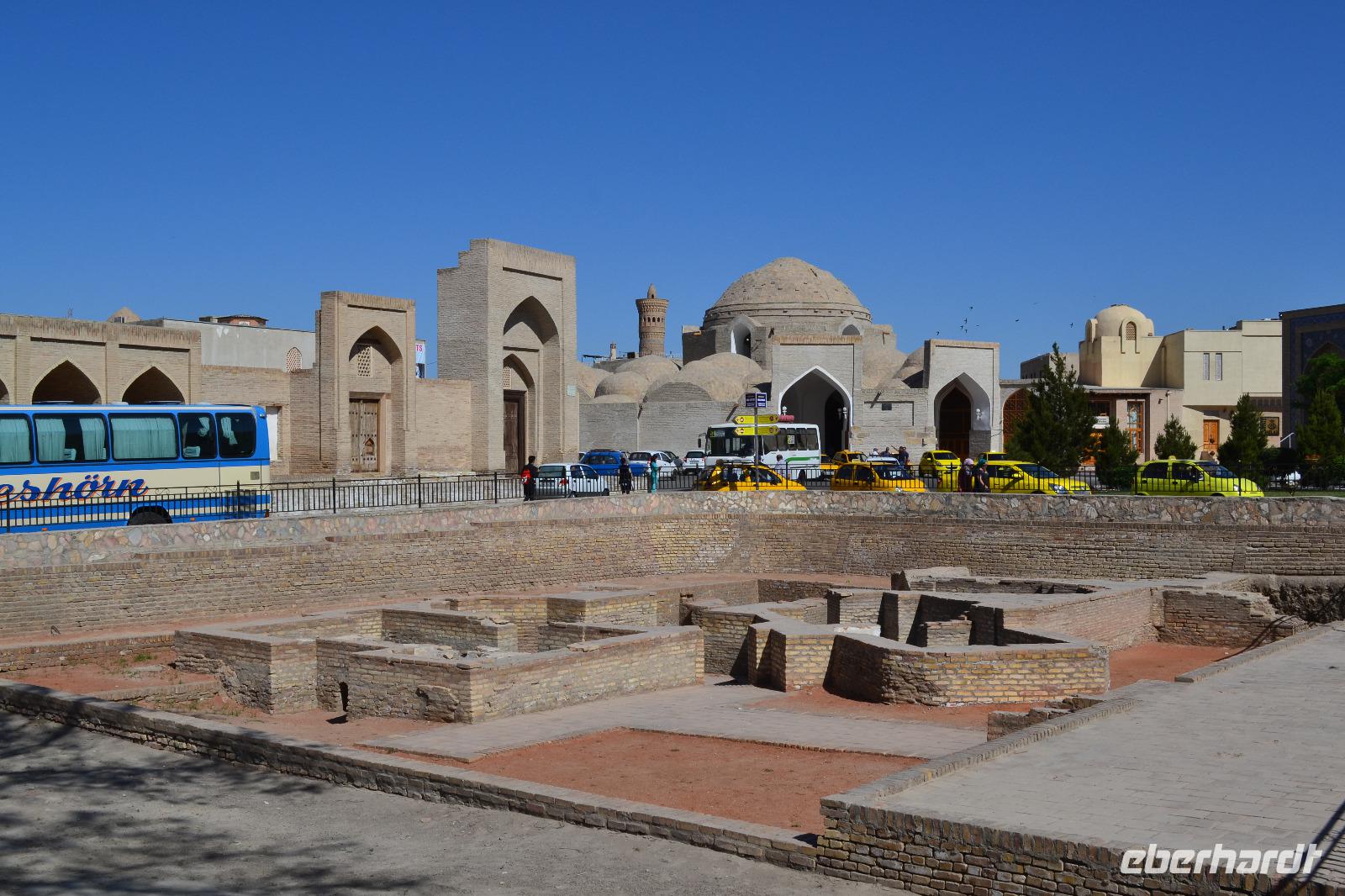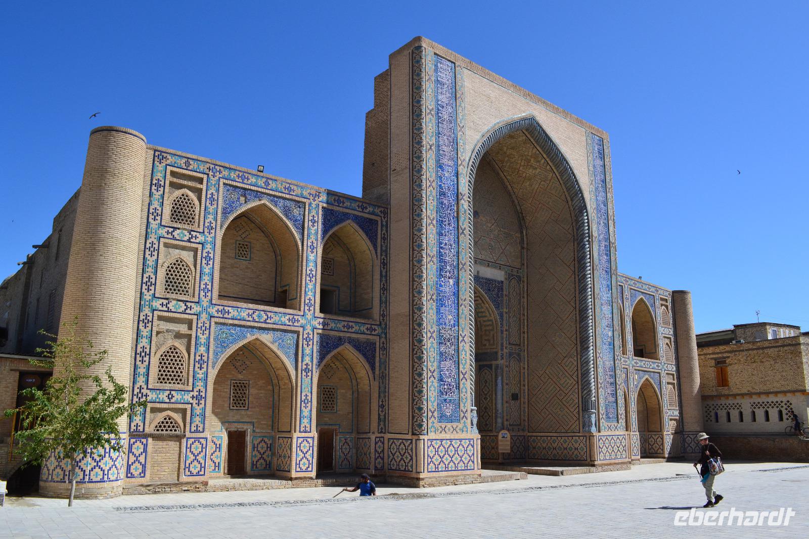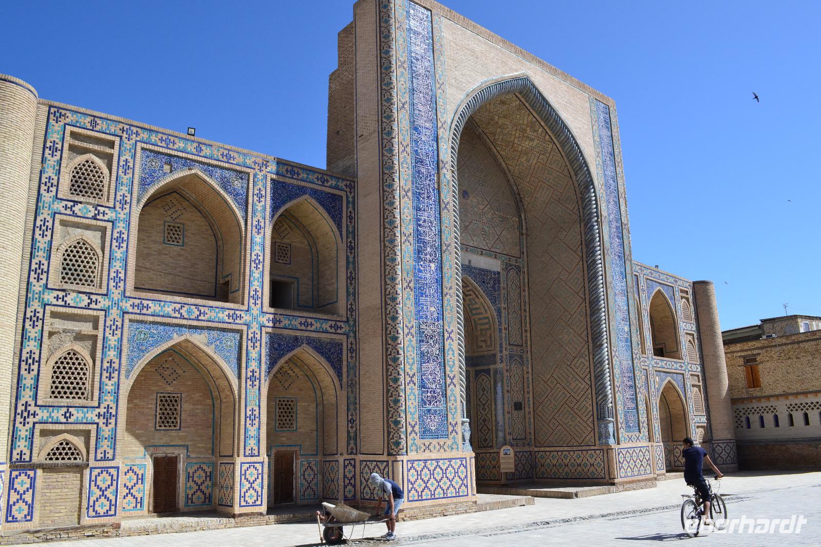 Wir wandeln noch ein bisschen auf den Spuren der Timuriden und machen einen Abstecher nach Shahrisabz, der Geburtsstadt Timur Lenks. Anstelle von Samarkand wollte er langfristig diesen Ort zu seiner Hauptstadt ausbauen, weshalb er sich hier u. a. das „Weiße Schloss" (Oq Saroy) errichten ließ, von dem heute nur noch die Ruinen des Eingangsportals erhalten sind. Immerhin sind diese immer noch riesige 38 m hoch. Der Palast soll bis zu sechs Stockwerke gehabt haben. Manchmal wünsche ich mir wirklich eine Zeitmaschine, sodass ich zurückreisen kann, um mir solche Bauwerke vor ihrer Zerstörung anzuschauen! In Shahrisabz besichtigen wir ebenfalls die Kok-Gumbaz-Moschee und das Dorussiadat-Mausoleum, bevor wir bei einer usbekischen Familie zum Mittagessen einkehren. Am Nachmittag zieht unsere Karawane über teils sehr holprige Straßen nach Buchara weiter, das wir gegen 18:00 Uhr erreichen. Unser familiengeführtes Hotel in Buchara liegt ganz nahe am idyllischen Labi Hovuz, einem Gebäudeensemble um den einzigen verbliebenen künstlichen Teich, der im Mittelalter der Versorgung der Einwohner mit Trinkwasser diente. Zum Abendessen können wir zu Fuß gehen, und von der Terrasse des Restaurants aus den Blick über die historische Altstadt schweifen lassen.