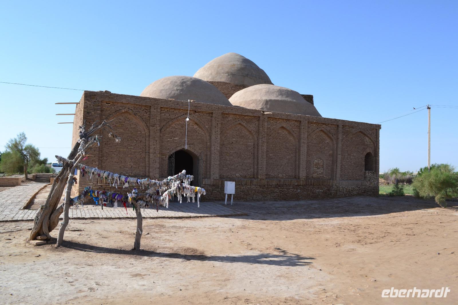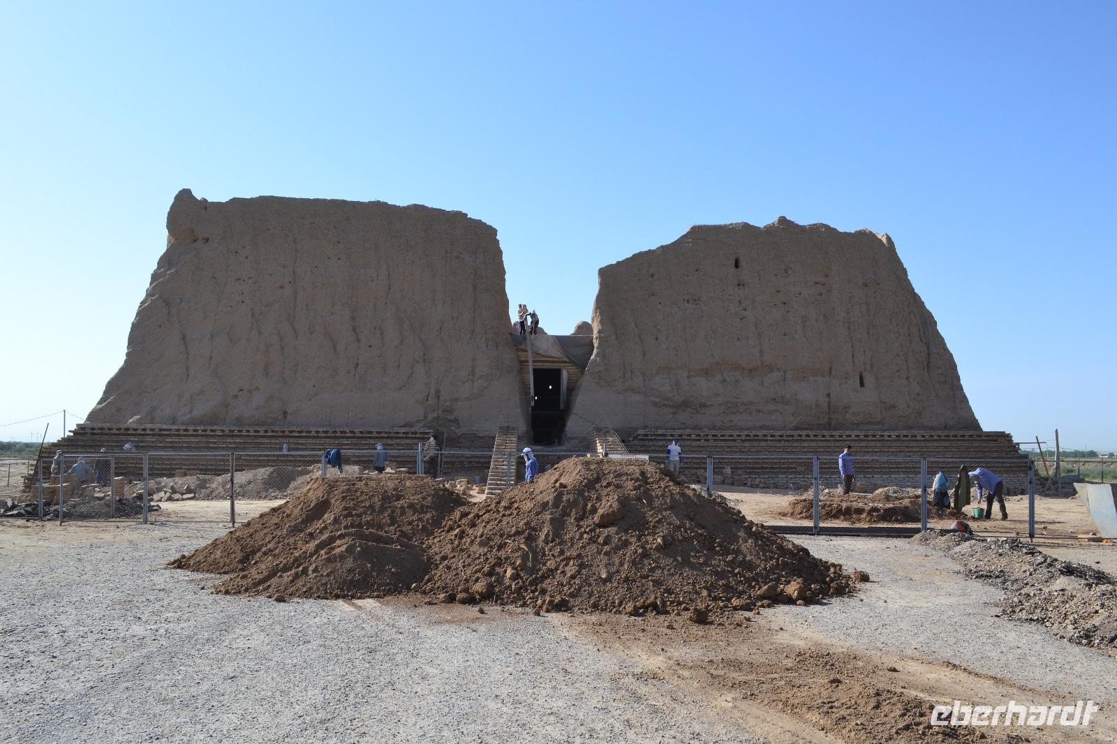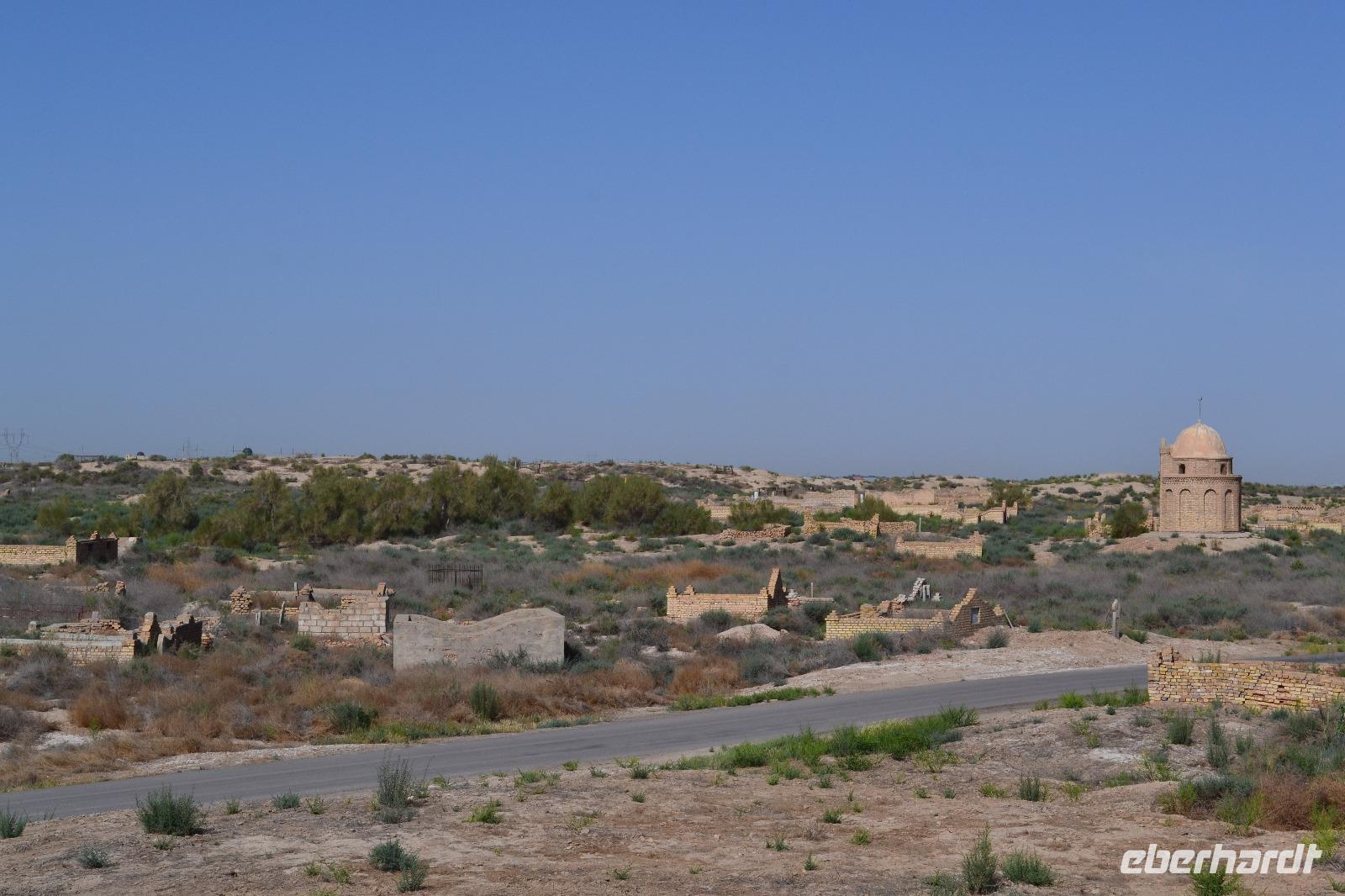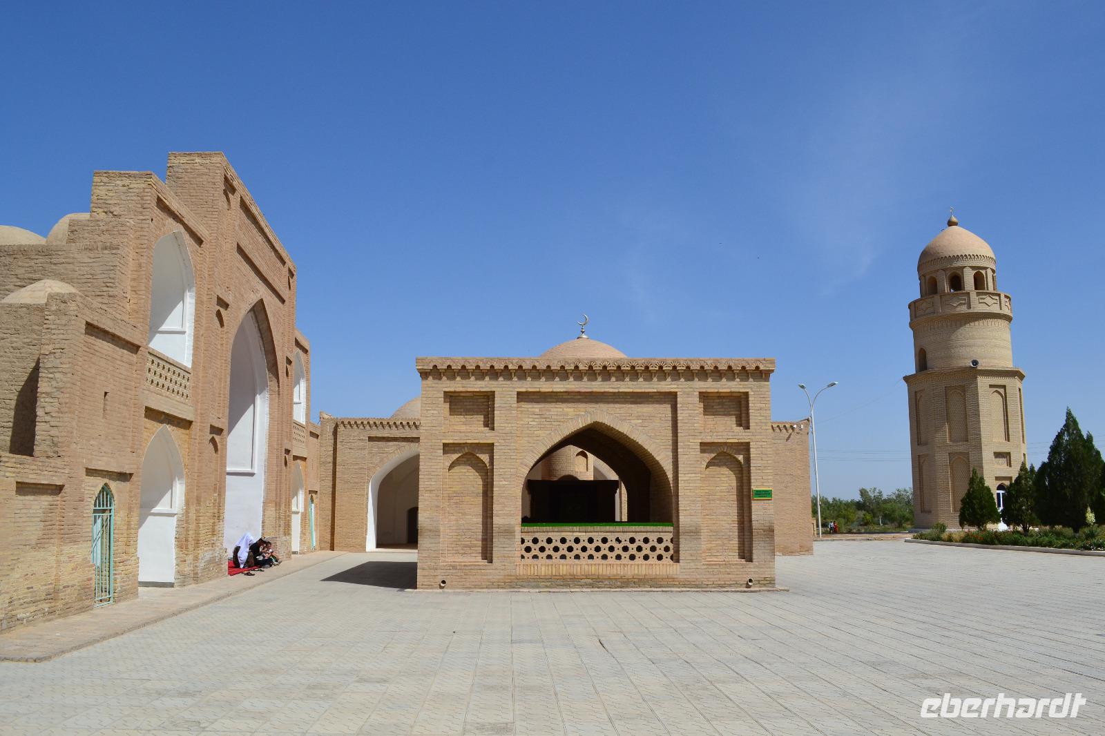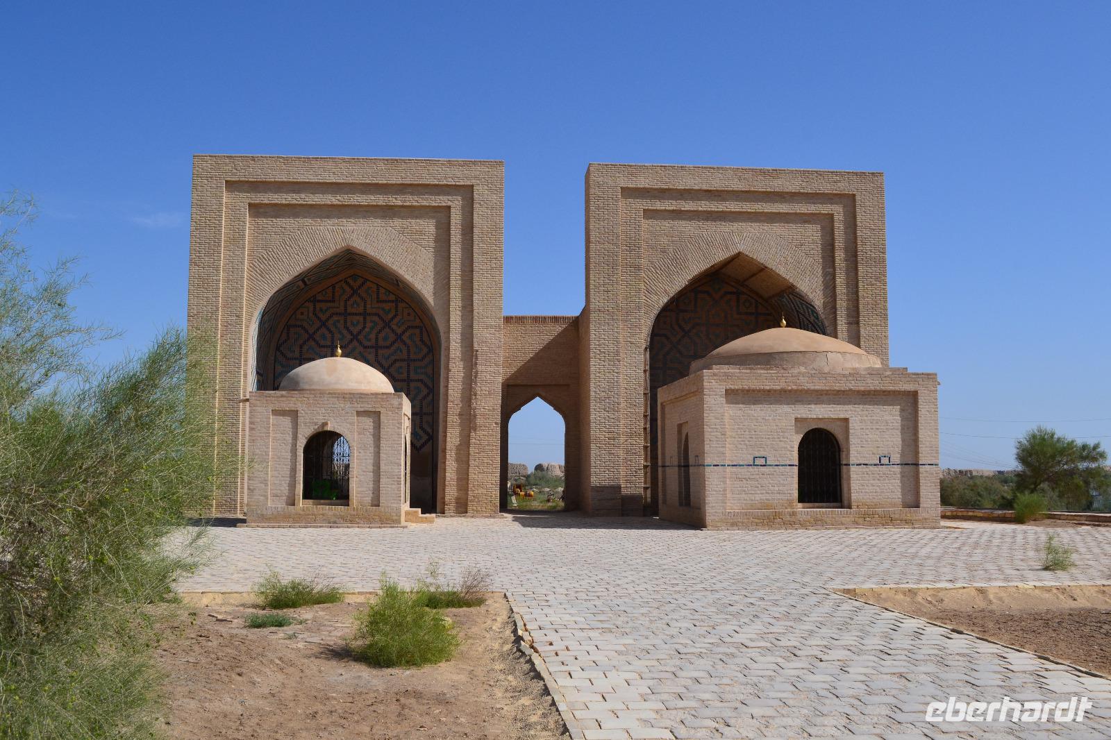 Heute beginnt der letzte Abschnitt unserer Reise mit dem Grenzübergang nach Turkmenistan. Dies bedeutet auch, dass wir von unserer Swetlana Abschied nehmen müssen, die uns in der Zeit in Usbekistan sehr ans Herz gewachsen ist. Wir sind die ersten Eberhardt-Gäste, die die Reise nach Turkmenistan wagen, weshalb wir an der turkmenischen Grenze auch vom Chef unserer örtlichen Partneragentur persönlich empfangen werden - überhaupt kommen nur wenige Touristen in dieses verschlossene Land. Er hilft uns jedenfalls beim Erledigen der Einreiseformalitäten, die nicht ganz so einfach sind, zumal es ein Problem mit unserem Gruppenvisum gibt, was aber vor Ort gelöst werden kann. Dann werden unsere Koffer noch nach bestimmten Medikamenten durchsucht, die in Turkmenistan verboten sind, aber niemand führt solche Amphetaminersatzpräparate mit sich. Ich muss sagen, dass es trotz allem recht schnell geht - nach knapp zwei Stunden haben wir beide Grenzkontrollpunkte passiert - und wir sehr höflich behandelt werden. Auch fällt uns auf, dass die Grenzschutzbeamten in Turkmenistan unbewaffnet sind, während in Usbekistan alle mit Sturmgewehren bewaffnet waren. Die Assistentin des Agenturleiters, Diana, kann etwas Deutsch und sehr gut Englisch und findet auf dem Weg zum Hotel in Daschogus ein paar einleitende Worte über unser letztes Reiseland. Nach einer Lagebesprechung und dem Check-In im palastähnlichen Hotel fahren wir dann erstmal Mittagessen (vom angebotenen Essen her unterscheiden sich alle vier Länder übrigens wenig). Im Restaurant treffen wir auch unseren neuen örtlichen Reiseleiter, Alexander. Er ist ein verschmitzter älterer Herr, der selbst schon in Deutschland war und es auch gern noch einmal besuchen möchte. Dann starten wir unseren Ausflug nach Kunja-Urgentsch. Die Fahrt führt uns über mal mehr, mal weniger gute Straßen tief ins Hinterland. Die Ruinenstadt Kunja-Urgentsch am Rand der Karakum-Wüste steht seit 2005 unter dem Schutz des UNESCO-Weltkulturerbes. Die verschiedenen großen und kleinen Mausoleen, das Kutlug-Temir-Minarett, mit heute immer noch 62 m das höchste Minarett Zentralasiens, und das prächtige Tor der Karawanserei zeugen davon, dass sich hier einmal die große Hauptstadt einer unabhängigen Herrscherdynastie befand. Nach unserer Rückkehr nach Daschogus bekommen wir ein Abendessen im Hotel, bevor wir erschöpft in unsere großen weichen Betten fallen.