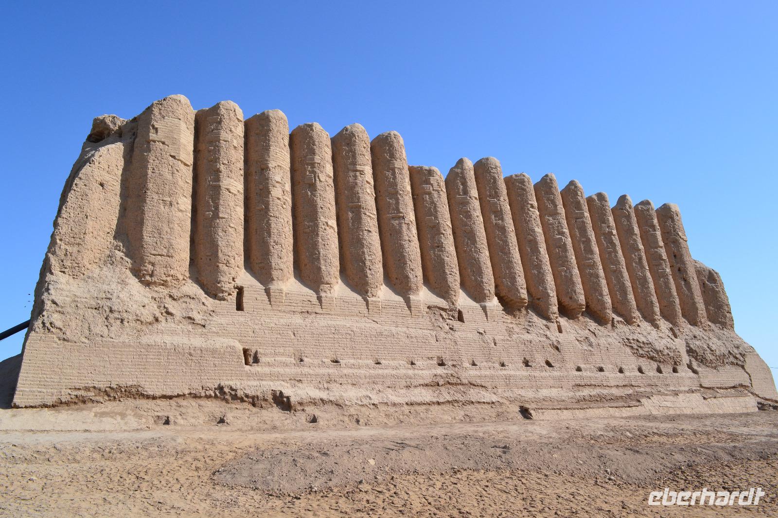 Als letztes Ziel auf dieser Reise steht ein Ausflug nach Mary auf dem Programm. Auch heute geht es wieder sehr zeitig los. Aber es lohnt sich wirklich, denn die Besichtigung der vielen historischen Monumente in der naheliegenden Ruinenstadt Merw ist sehr abwechslungsreich und gewährt uns einen tiefen Einblick in die lange Siedlungsgeschichte der Region. Die Ruinen sind auf einer Fläche von 70 km2 verteilt und reichen zurück bis in die Jungsteinzeit. Besonders beeindrucken uns drei Festungen: die große Gyz Kala, die kleine Gyz Kala und die Festung Erk Kala. Bei letzterer handelt es sich um die Überreste einer Siedlung aus der Zeit der Achämeniden, die von Alexander dem Großen erobert und zu einem griechischen Stadtstaat ausgebaut wurde. Als wir oben auf den Überresten der geschleiften Stadtmauer stehen, sehen wir in der Ferne eine große Herde Dromedare vorbeiziehen. Zum Abschluss unseres Besuchs in Merw besichtigen wir das Sultan-Sandschar-Mausoleum, welches mit einer Höhe von 38 m ebenfalls nicht wirklich klein ist. Der Besuch in Merw führt uns zusammen mit der Besichtigung von Nisa am Tag zuvor vor Augen, wie wenig wir auch nach unserer guten schulischen Ausbildung in Deutschland eigentlich von der Geschichte der Menschheit wissen, die sich außerhalb der deutschen bzw. europäischen Grenzen abgespielt hat. Einmal mehr bewahrheitet sich der Ausspruch: „Reisen bildet"! Auf dem Rückweg ins Zentrum von Mary halten wir an einem Restaurant für ein leichtes Mittagessen. Viel Hunger haben wir alle bei der Hitze nicht, aber ein klimatisierter Innenraum kommt uns jetzt gerade recht. Dann möchten wir das Historische Museum in Mary besichtigen, dürfen aber noch nicht rein, weil offiziell noch Mittagspause ist. Also entspannen wir in der Lobby eines nahegelegenen Hotels, wo wir auf Wunsch auch Kaffee und Tee bekommen. Nun kommt wieder so ein absurder Moment, den man so wohl nur in Turkmenistan erlebt: Im Museum sind wir die einzigen Gäste - nicht nur heute, so mutmaßen wir, sondern in der ganzen Woche, wenn nicht sogar im ganzen Monat. Unter den sehr, sehr strengen und wachsamen Augen der Aufseherinnen, müssen wir uns erst einen Raum anschauen, der ganz dem jetzigen Präsidenten und seinen Heldentaten gewidmet ist. Dann geht es weiter durch die Tier- und Pflanzenwelt, und am Ende wartet die historische Abteilung auf uns. Diese ist tatsächlich Dank Alexanders Ausführungen sehr interessant, denn sie gibt uns Einblick in das frühere Nomadenleben und die strikte Aufgaben- und Rollenverteilung von Mann und Frau. Am späten Nachmittag fliegen wir zurück nach Aschgabat. Auf der Fahrt zu unserem Restaurant sehen wir nun tatsächlich einmal Viertel der Stadt, in denen Menschen wohnen, denn das Lokal liegt mitten in einem Wohngebiet. Nach dem Abendessen - es ist inzwischen dunkel - machen wir noch eine kleine Stadtrundfahrt bei Nacht. Die langen, hell erleuchteten Straßenzüge, die wir vom futuristischen Standesamt aus sehen, sind ebenfalls sehr beeindruckend. Zurück im Hotel müssen wir endgültig unsere Koffer packen und können vielleicht noch 1-2 Stunden schlafen. Um 1:00 Uhr werden wir ein letztes Mal von Alexander vom Hotel abgeholt und zum Flughafen gebracht. Das internationale Terminal empfängt uns mit einer Lichtershow, die uns glauben machen soll, das gewaltige Gebäude in Form eines Falken würde tatsächlich abheben. Auch im Inneren wird nicht gekleckert, sondern geklotzt: eine riesige Empfangshalle, hohe Säulen, viel Gold und Marmor sollen uns beeindrucken. Es wirkt allerdings eher lächerlich, denn von den ca. 24 Gates starten im Laufe eines Tages gerade einmal sechs Maschine - drei am frühen Morgen, drei am Abend. Zeit uns auch von Alexander zu verabschieden, der uns sehr offen und ehrlich durch sein verschlossenes Heimatland geführt hat. Wir wünschen ihm von ganzem Herzen alles Gute. Unsere Lufthansa-Maschine nach Frankfurt ist nicht einmal annähernd ausgelastet; selbst nach der Zwischenlandung in Baku sind wir insgesamt mit Crew höchstens 80 Personen an Bord. Die erste Gäste verlassen in Frankfurt nach 19 aufregenden Tagen die Gruppe. Sieben Gäste fliegen mit mir weiter nach Dresden.