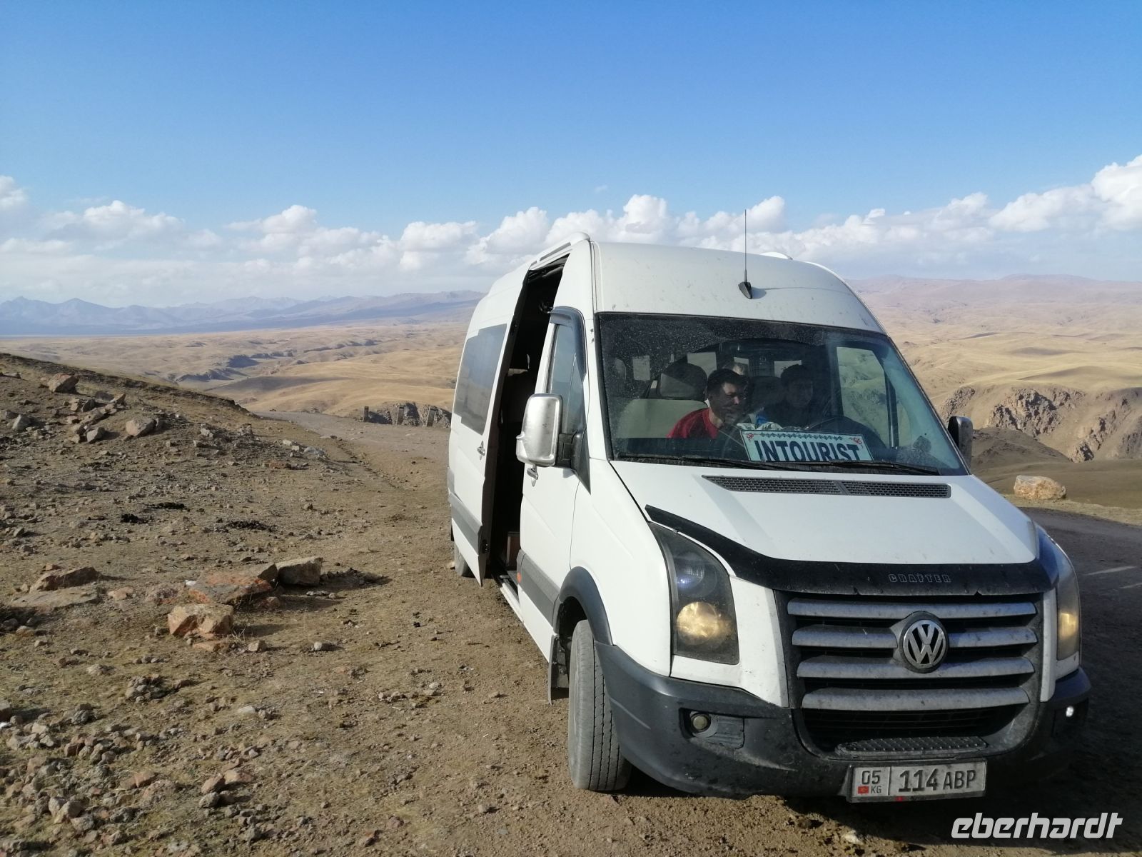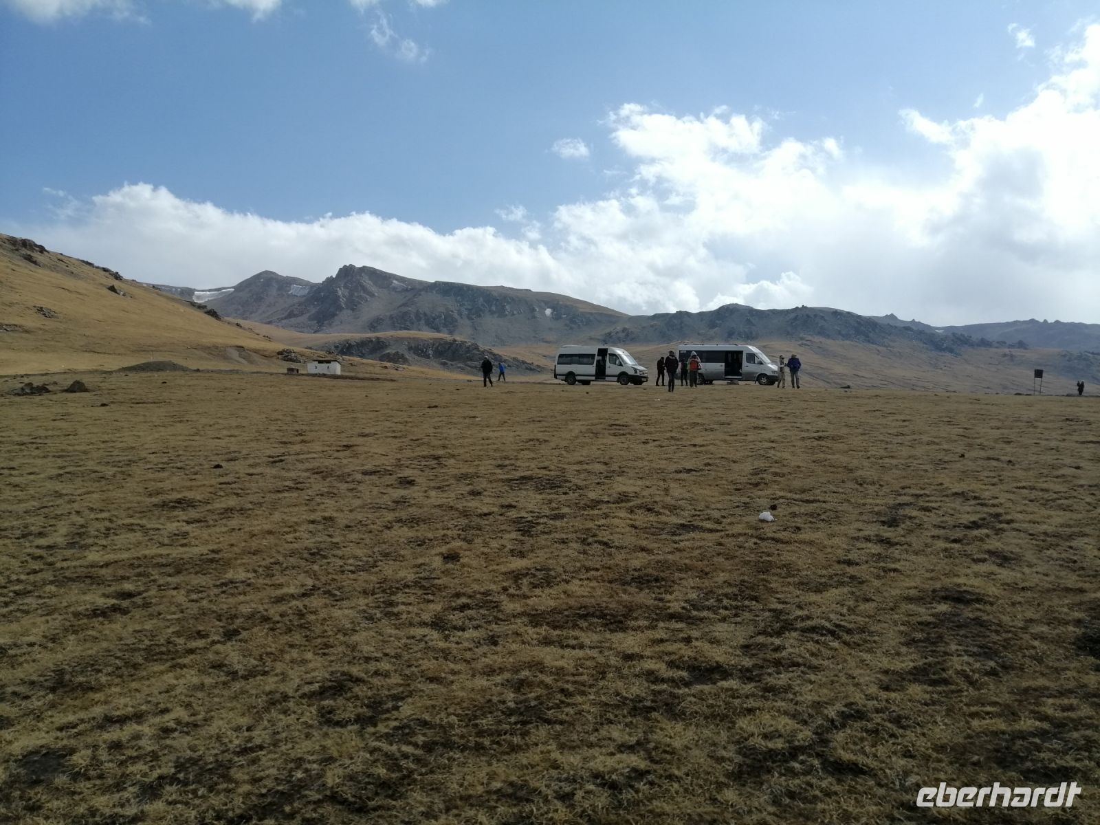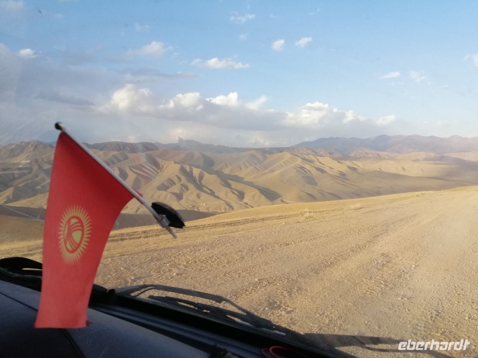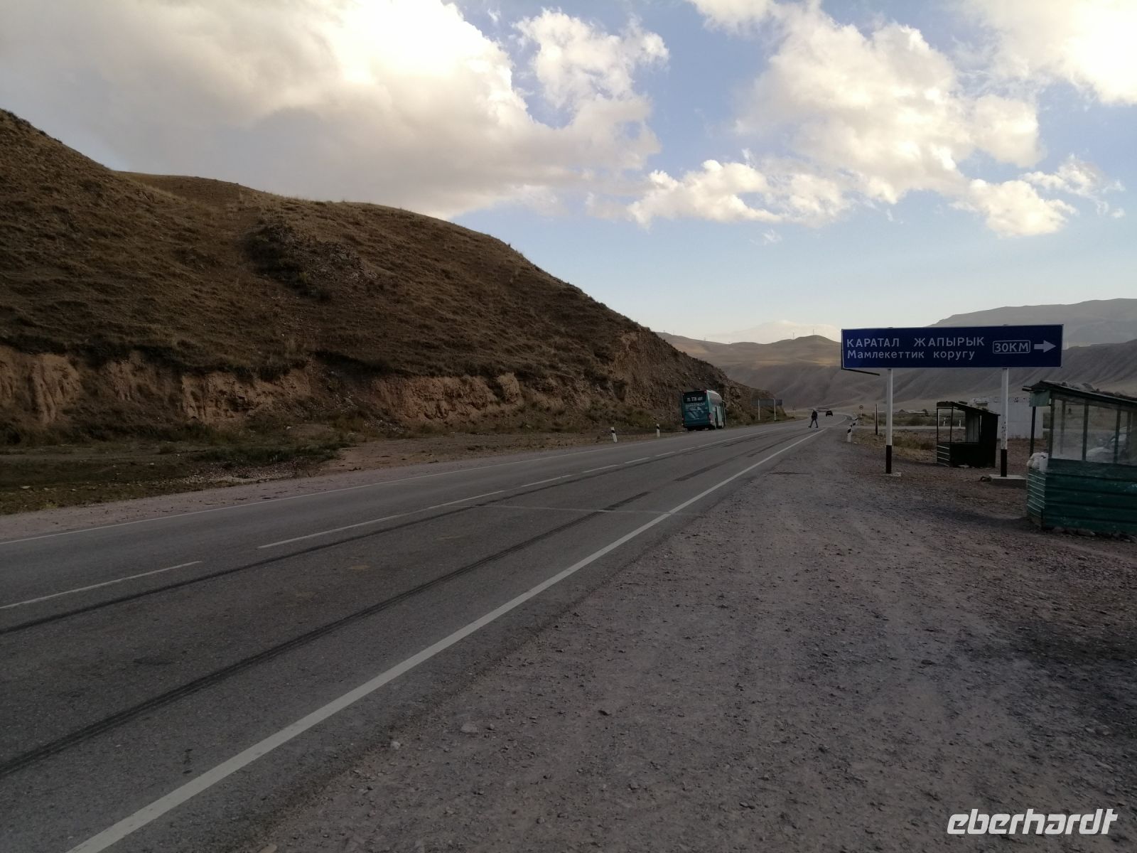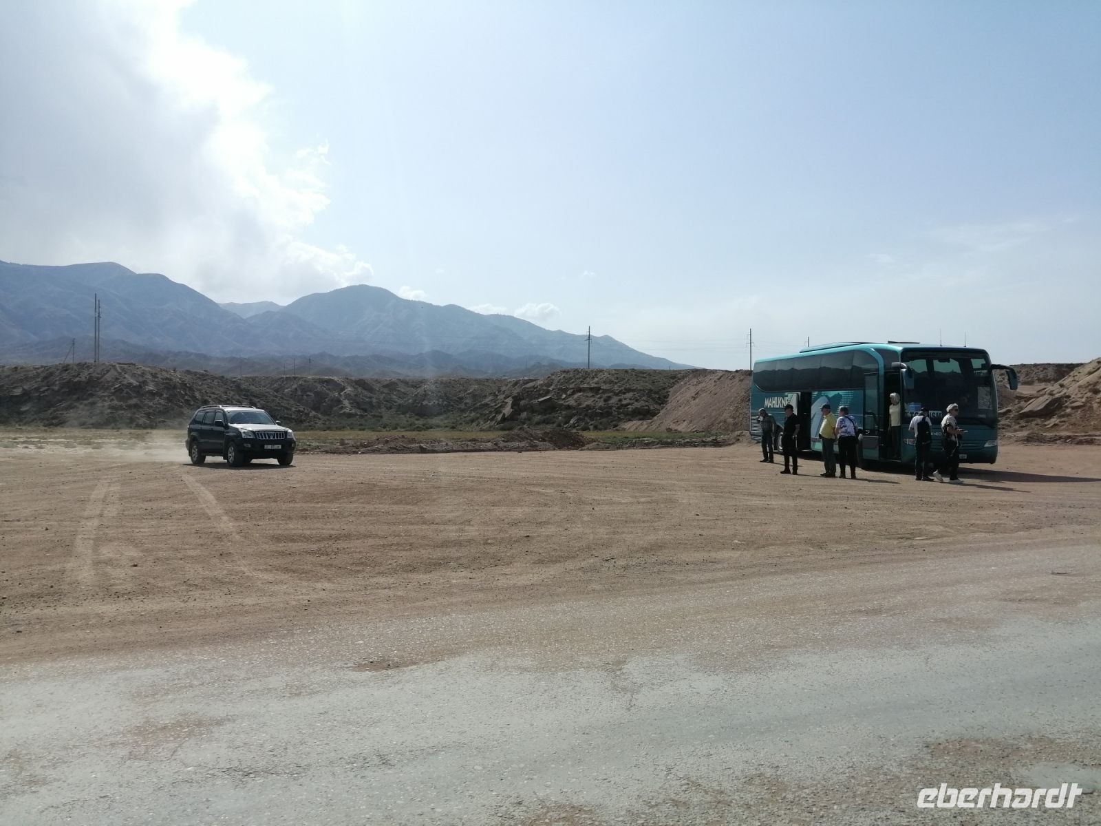 Fast die ganze Straße am Südufer des Issyk Kul-Sees wurde neu gebaut: die Freude für künftige Reisegruppen, motivierte uns die Strapazen der Fahrt nicht ernst zu nehmen. Mit einer kurzen Zwischen-Pause an der Ortotokoi-Talsperre, erreichten wir gegen 12 Uhr die Stadt Kotschkor, wo wir in kleinere Mercedes-Sprinter umstiegen und Richtung Kalmak-Aschuu-Pass starteten.