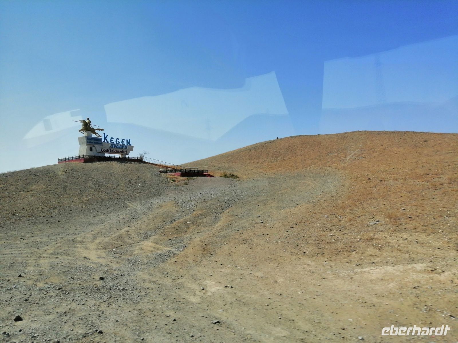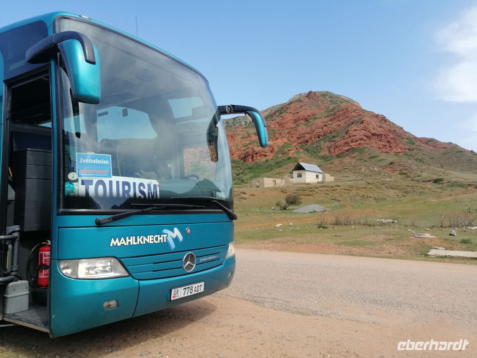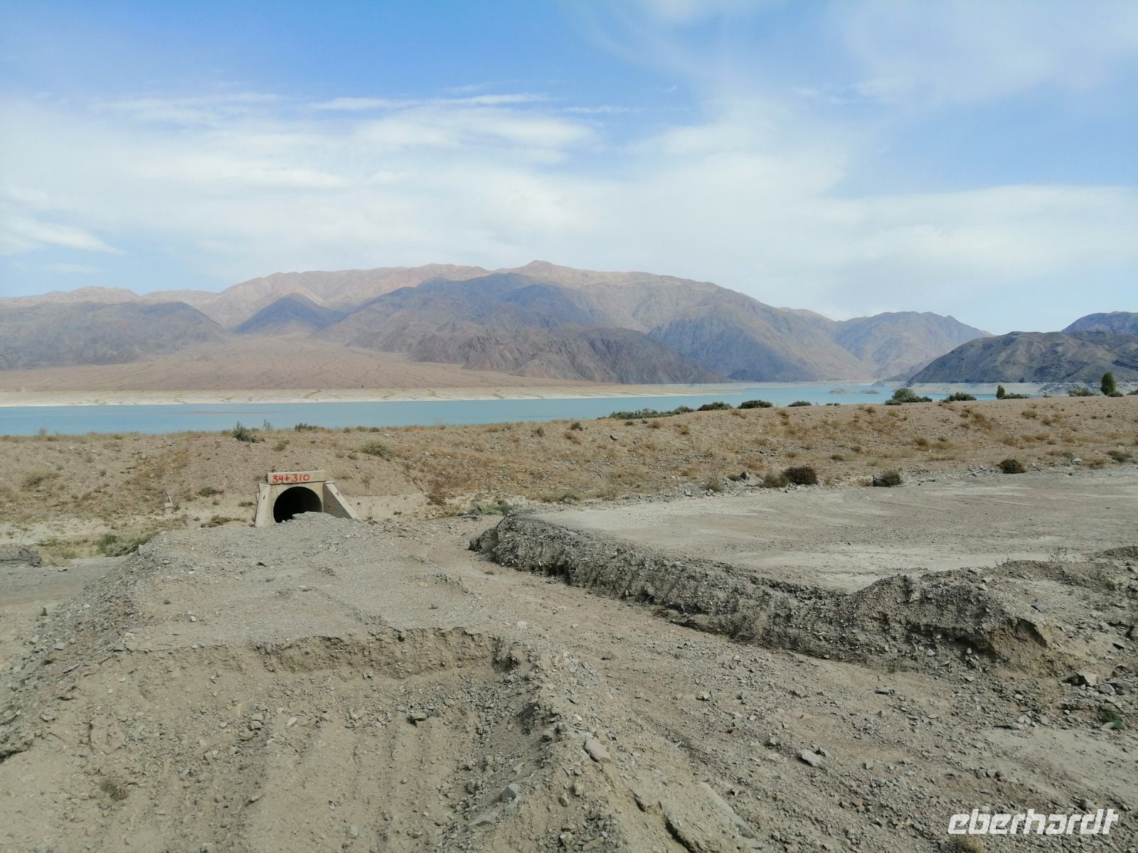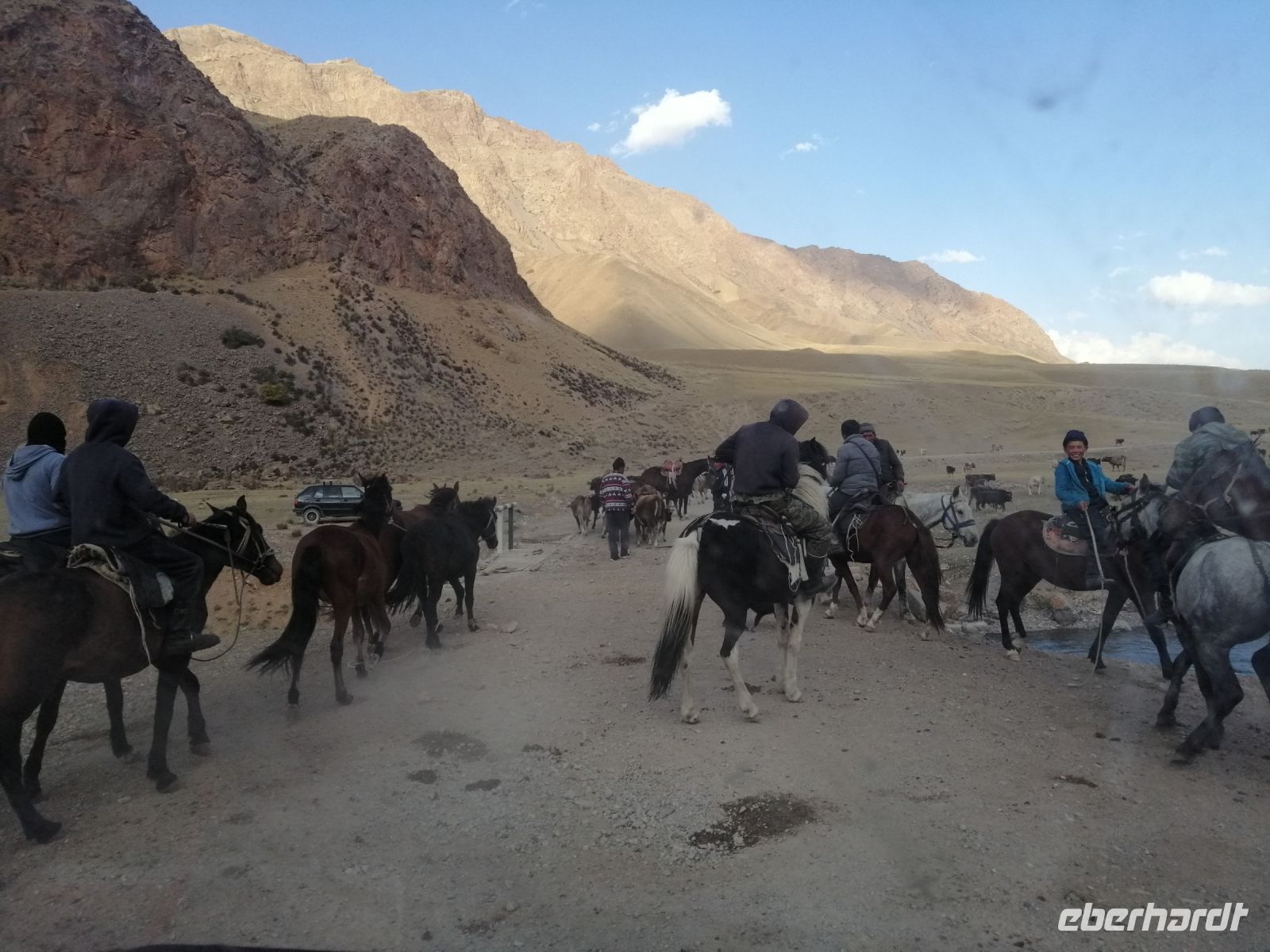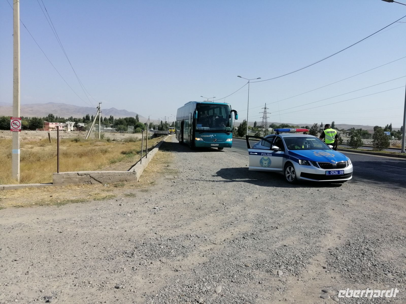 Fast die ganze Straße am Südufer des Issyk Kul-Sees wurde neu gebaut: die Freude für künftige Reisegruppen, motivierte uns die Strapazen der Fahrt nicht ernst zu nehmen. Mit einer kurzen Zwischen-Pause an der Ortotokoi-Talsperre, erreichten wir gegen 12 Uhr die Stadt Kotschkor, wo wir in kleinere Mercedes-Sprinter umstiegen und Richtung Kalmak-Aschuu-Pass starteten.